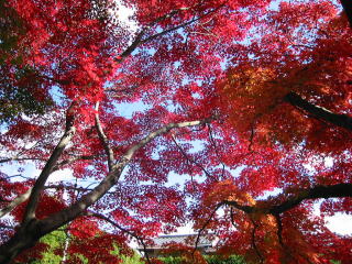 | 本阿弥光悦は、安土桃山・江戸時代初期に活躍したマルチ芸術家で、1615年徳川家康から 京都洛北の鷹ヶ峰に約9万坪という広大な土地を与えられて、一大芸術村をつくりました。 光悦寺の紅葉は、五、六分位でしたが、充分に綺麗でした。 |