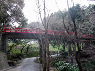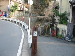 | 豊国廟の前、新日吉神社の裏から南の方へ歩いて行くと、剣神社に出てきます。その前の東山トレイル の道標の横を下って行けば、泉涌寺の塔頭、今熊野観音寺の赤い鳥居橋の下に出て来ます。 |