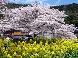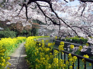 | 山科疎水の菜の花が綺麗に咲いていると聞き、出掛けました。以前は片岸に30メートル程が 咲いていて、その時もサクラと菜の花の黄色が見事だと思いましたが、今回行ったら、 菜の花が5・6倍以上に増えて、両岸にビッシリと咲いていて、本当に綺麗でした。 |