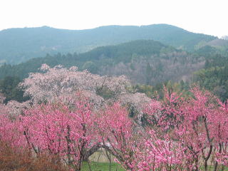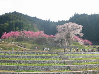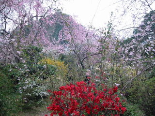 | 此処がこんなに綺麗に整備されていない10年程前に来た時は、後ろの桃を従える程の花が一杯 の迫力ある元気なサクラだったので、余りの貧弱さにガッカリしました。 |