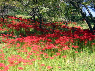 | 春に千年桜を見に来た時、バスを降りたのは私一人でしたが、 今日は10人位降りました。 天気良く残暑?厳しい暑さでしたが、2回目なので余裕を持ってダラダラ坂を歩きました。 ネットで調べて満開だと思ったのですが、まだ少し早く7・8分位でしたが、十分見事に綺麗 でした。人は一杯居ましたが、家から3時間半掛かっても充分価値ある風景でした。 |