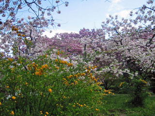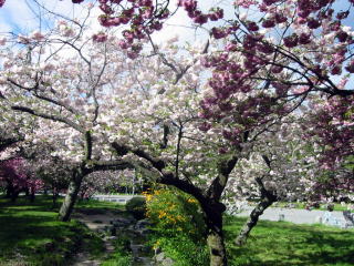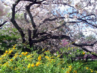 | 近衛邸跡の桜は、この寒さで満開が続いています。前の芝生の桜も満開でした。 |