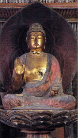| 九体阿弥陀堂には、「観無量寿経」にある九品往生、人間の努力や心がけなど、いろいろな条件で 下品下生からはじまり上品上生まで九つの往生の段階があるという考えから、九体の阿弥陀如来を まつった。中尊は丈六で他の八体は半丈六の、現存する唯一の九体阿弥陀仏(国宝)が壮観です。 |