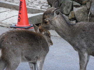 | 親子の鹿はマイペースで、母鹿は小鹿の耳をずうっと噛み揉んで動かないので、仕方なく車は そおっとハンドルを切って通り過ぎて行きました。 |