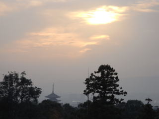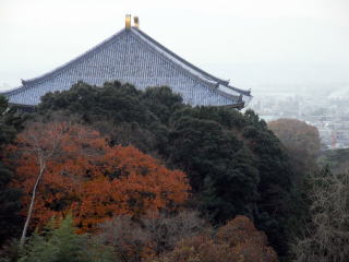 | 二月堂の舞台から東大寺金堂(大仏殿)と遠くに見える興福寺の五重塔 |