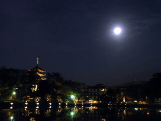 | 猿沢池畔から、ライトアップされた興福寺の五重塔に満月が出ていました。 |