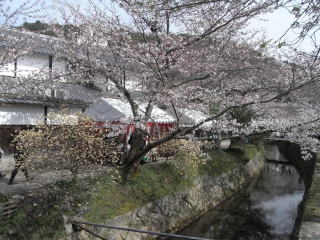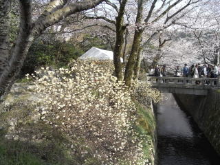 | 銀閣寺の近くからだんだん人が多くなり、哲学の道は人で溢れかえり大混雑の状態でしたが、 桜はほぼ満開に近く、ツツジ、三椏、連翹、山吹、椿等色々な花が咲き乱れて春爛漫のとても 気持良い時間でした。 |