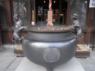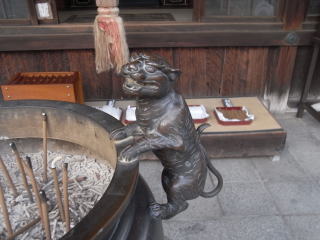 | 毘沙門堂前の香炉にも虎がいました。さらに香炉自体にも虎と共に毘沙門天の使いである 百足が彫刻してあります。 |