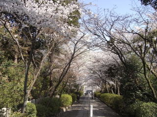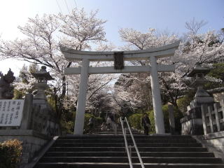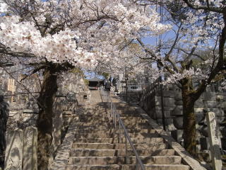 | 何時もは遅い石段の参道の桜も、天候のせいか7分位咲いていました。 地図 |