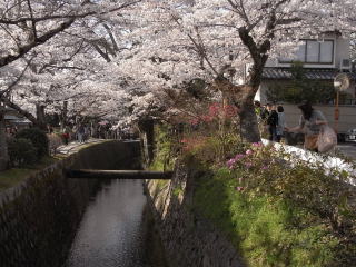 | 哲学の道は、毎年通り人で溢れかえり大混雑の状態でしたが、桜はほぼ満開に近く、 桜以外にも色々な花が咲き乱れて、これぞ春爛漫の状態で気持も高揚します。 地図 |
