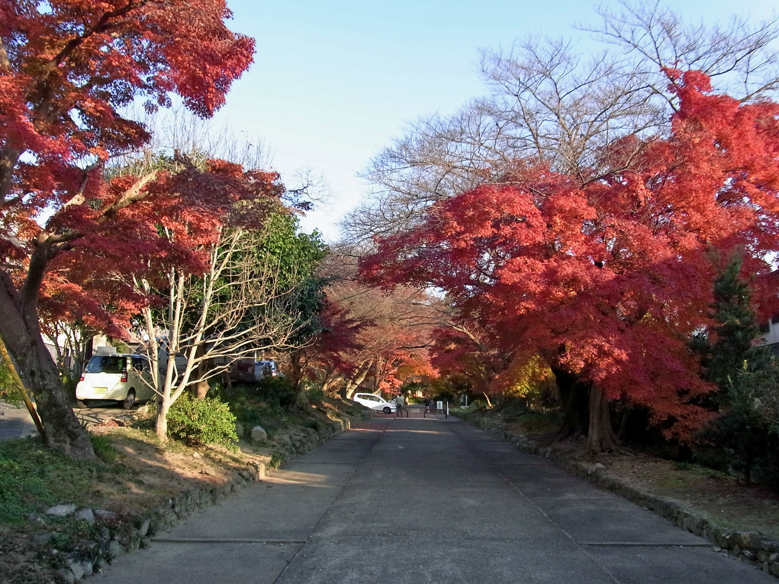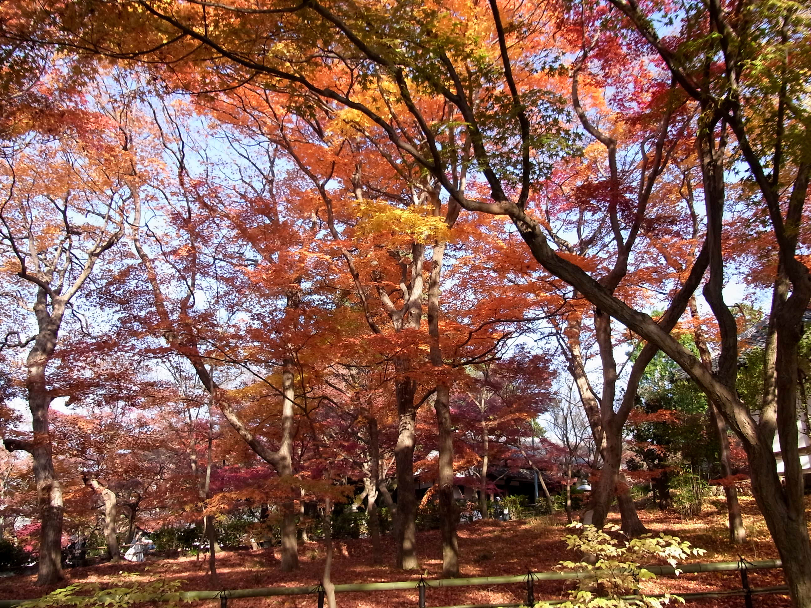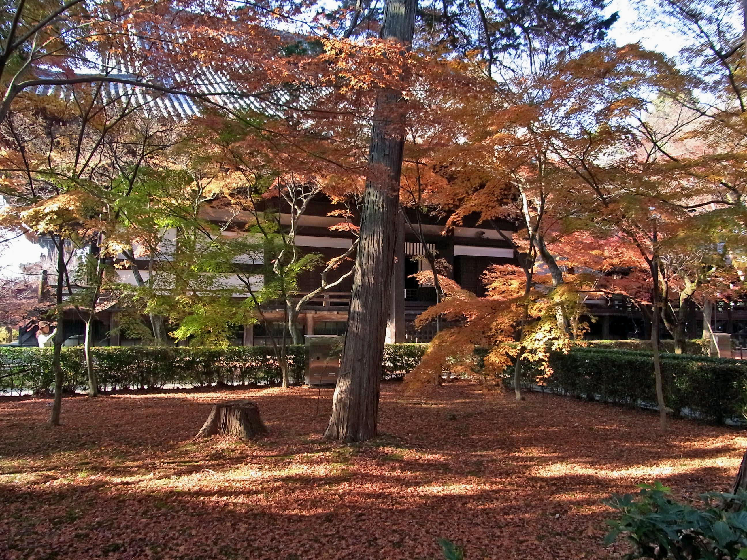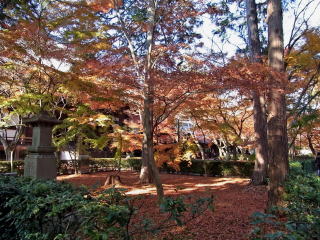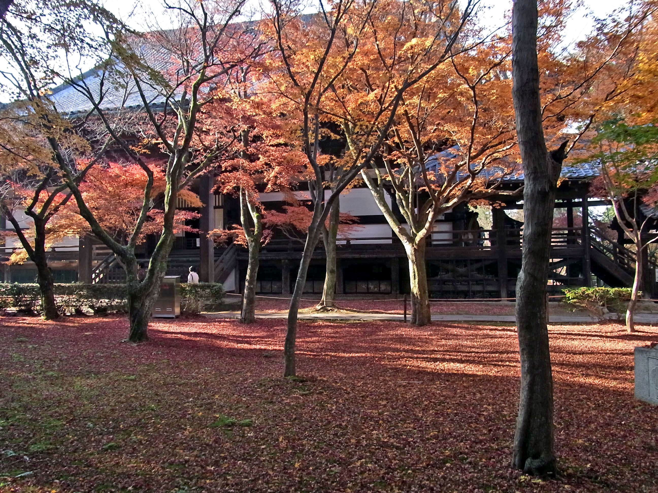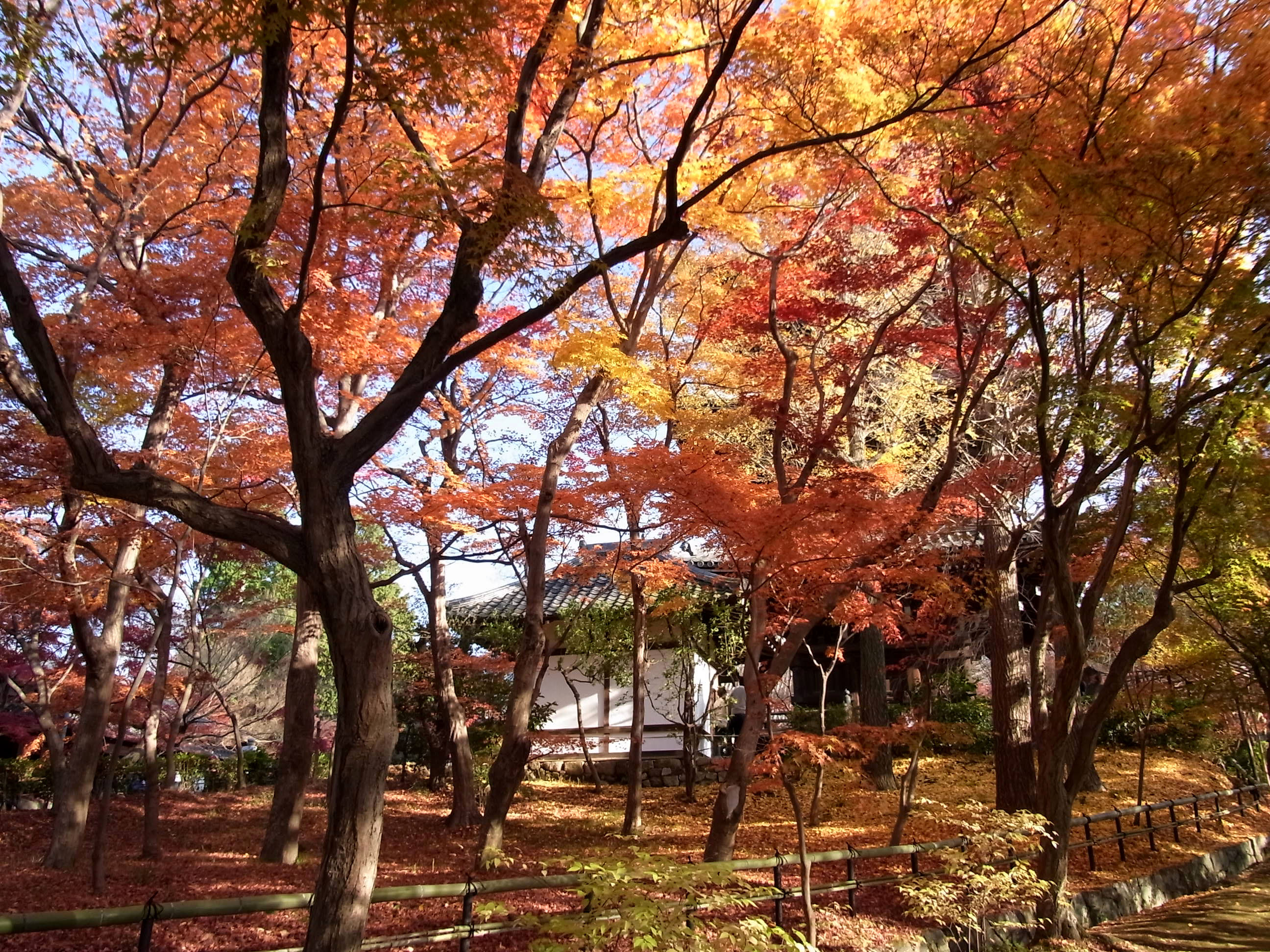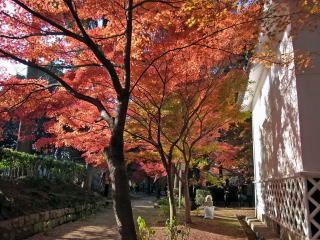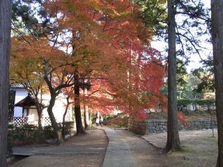 | 私の一番お気に入り、黒谷さんから出て来た蔵の紅葉は見頃で、本堂裏は散紅葉が綺麗でした。 本堂前の参道は終わっていましたが、三重塔の南の参道は、まだまだ見頃が続いていました。 |