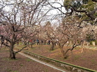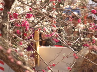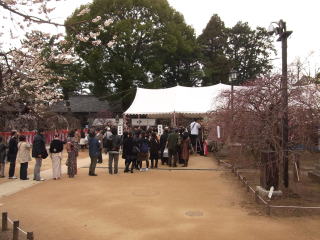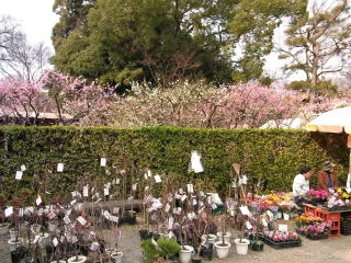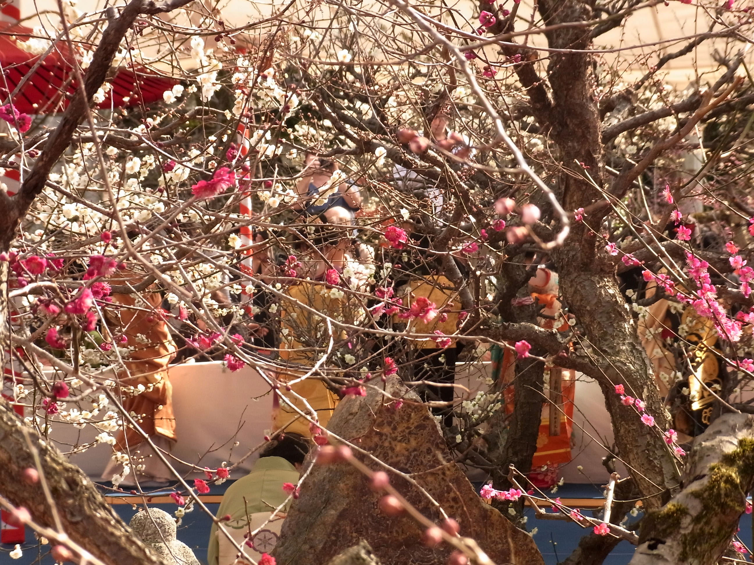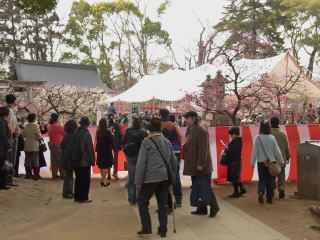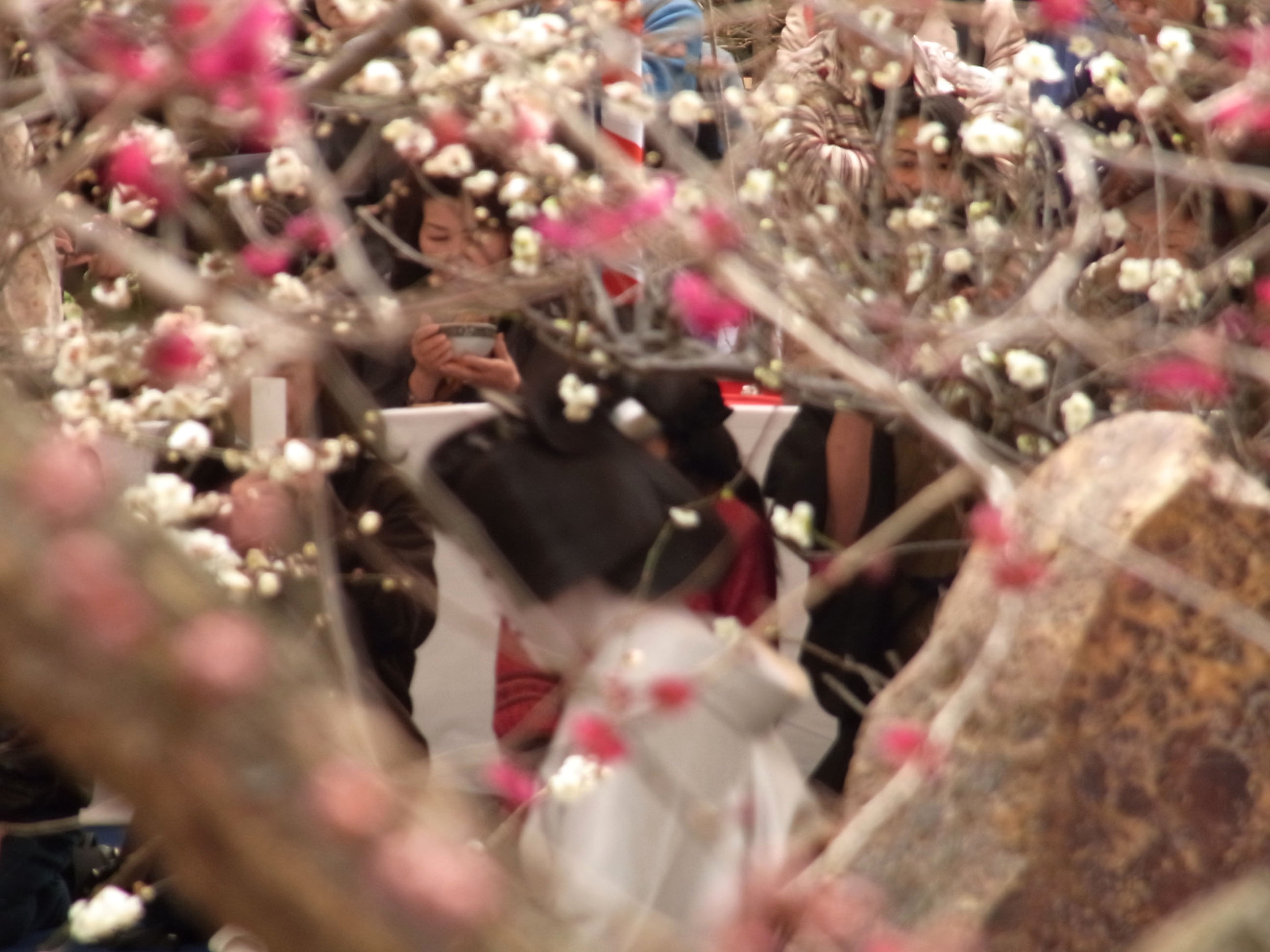 | 梅花祭に間に合うかなと思っていた梅も五分程度まで咲き、たくさんの人が天神さんに訪れて いました。肝心の梅花祭は、年々ガードが固くなって幔幕の中が見辛くなっているのが残念。 (写真をクリックすれば拡大されます) |