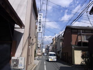 | 千本三条で、市電敷設のため明治の終わりに三条〜四条を結ぶ斜めの道、後院通が作られて 三条以南の千本通は昔のままの狭い道幅です。本来は市電を真直ぐ通す予定だったのが、 付近の住民の反対で、後院通が新たに作られたそうです。 地図 |