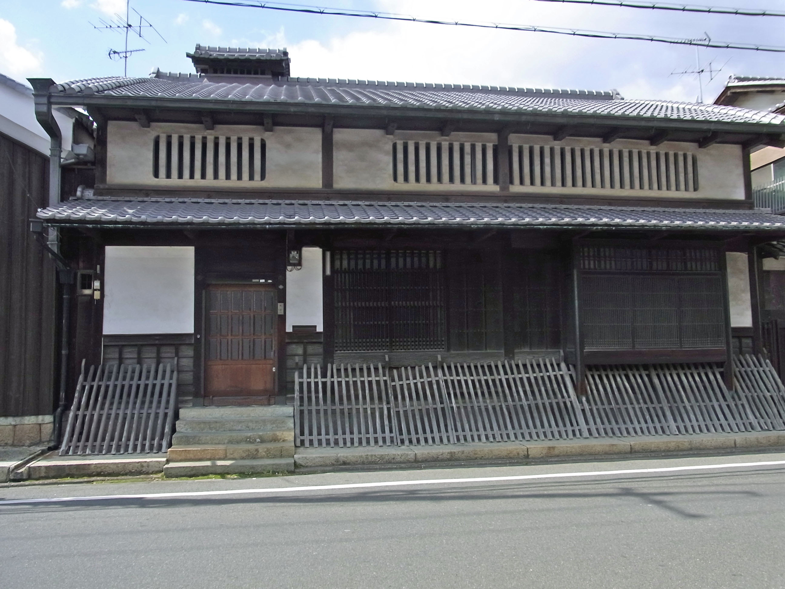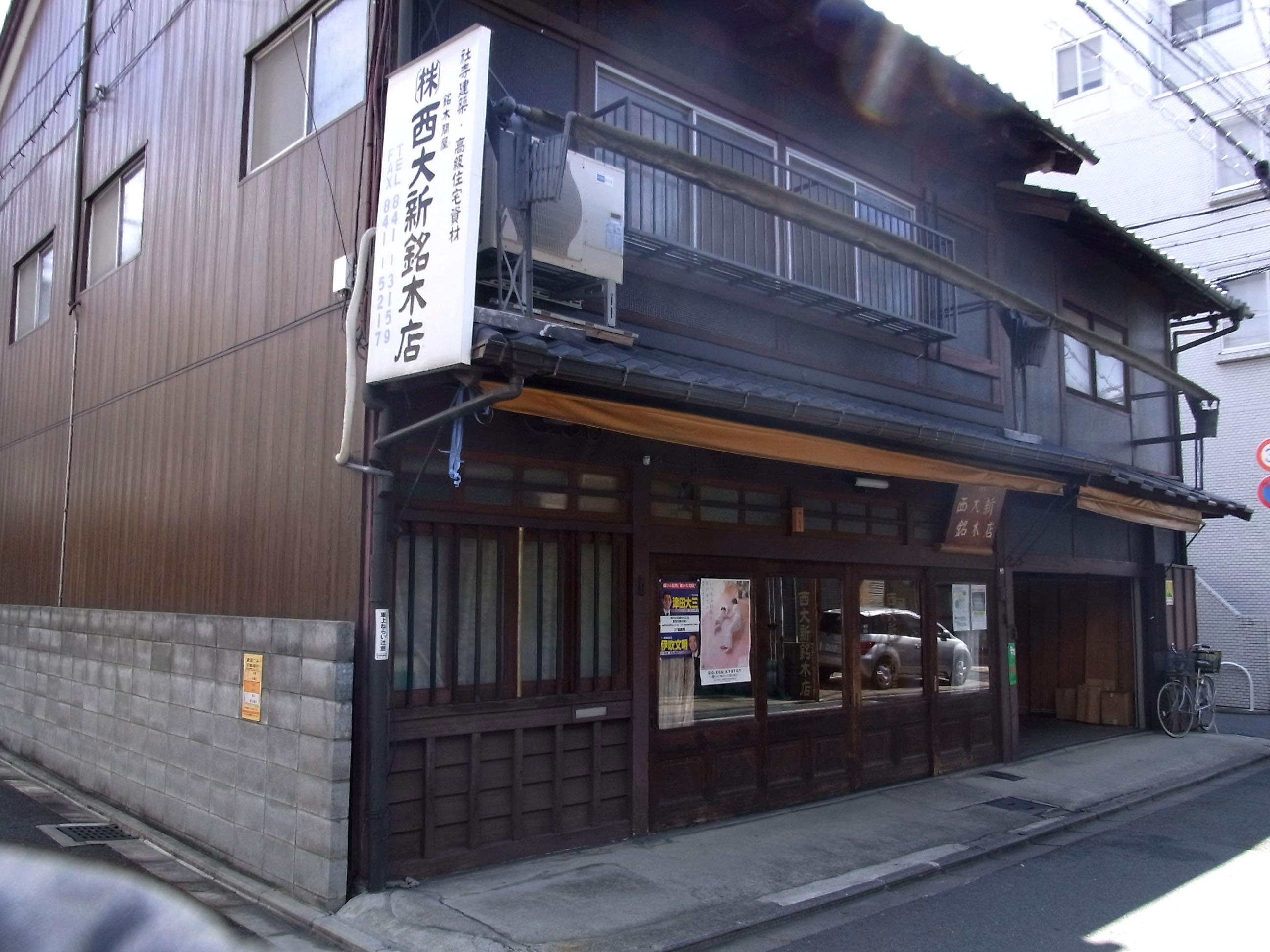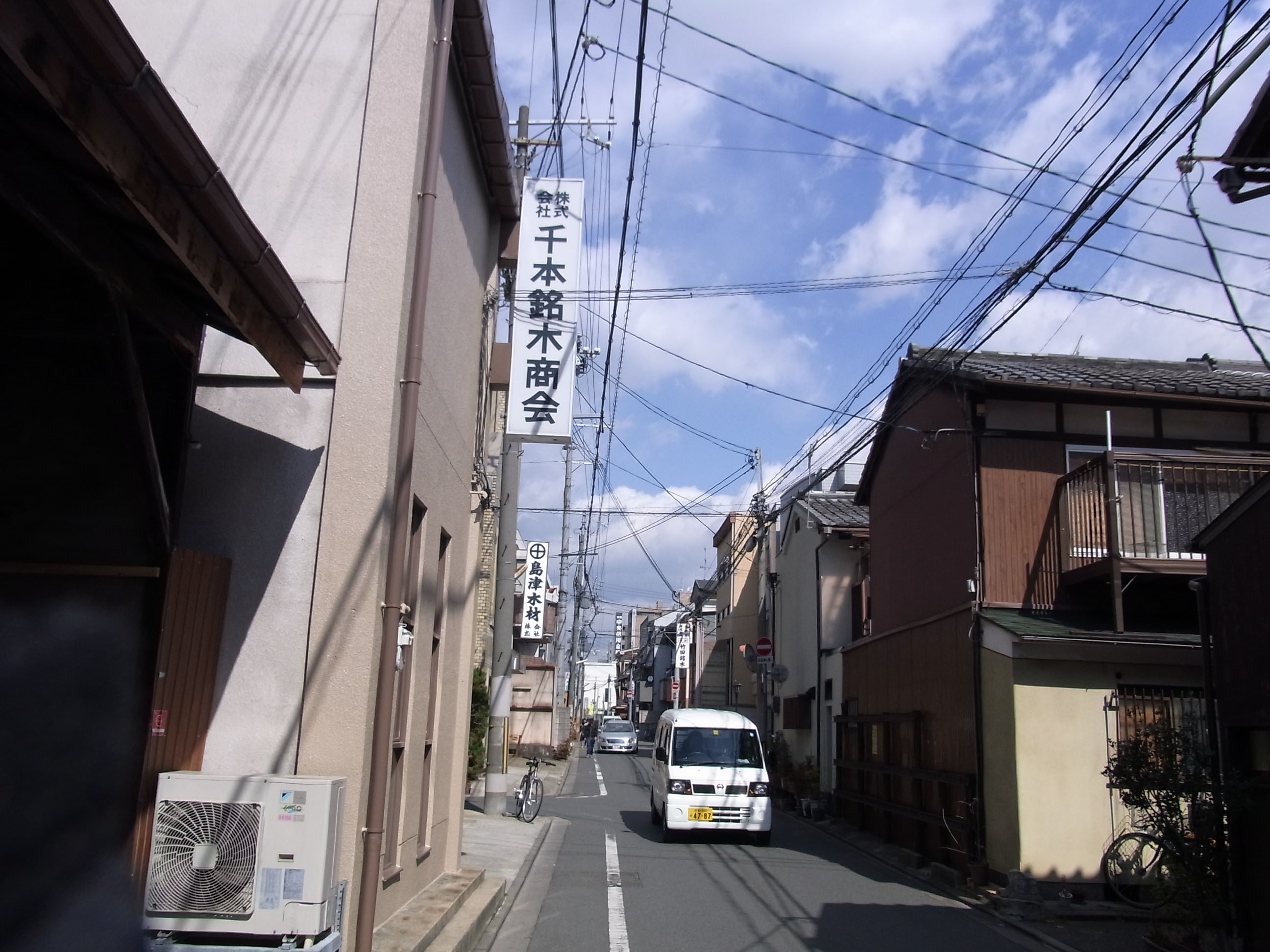| 千本三条下ル辺りは、材木商の店を多く見かけます。江戸時代末に嵯峨(渡月橋上流)〜千本三条 まで西高瀬川が開削され、丹波地方の木材の集積地だった名残です。 |