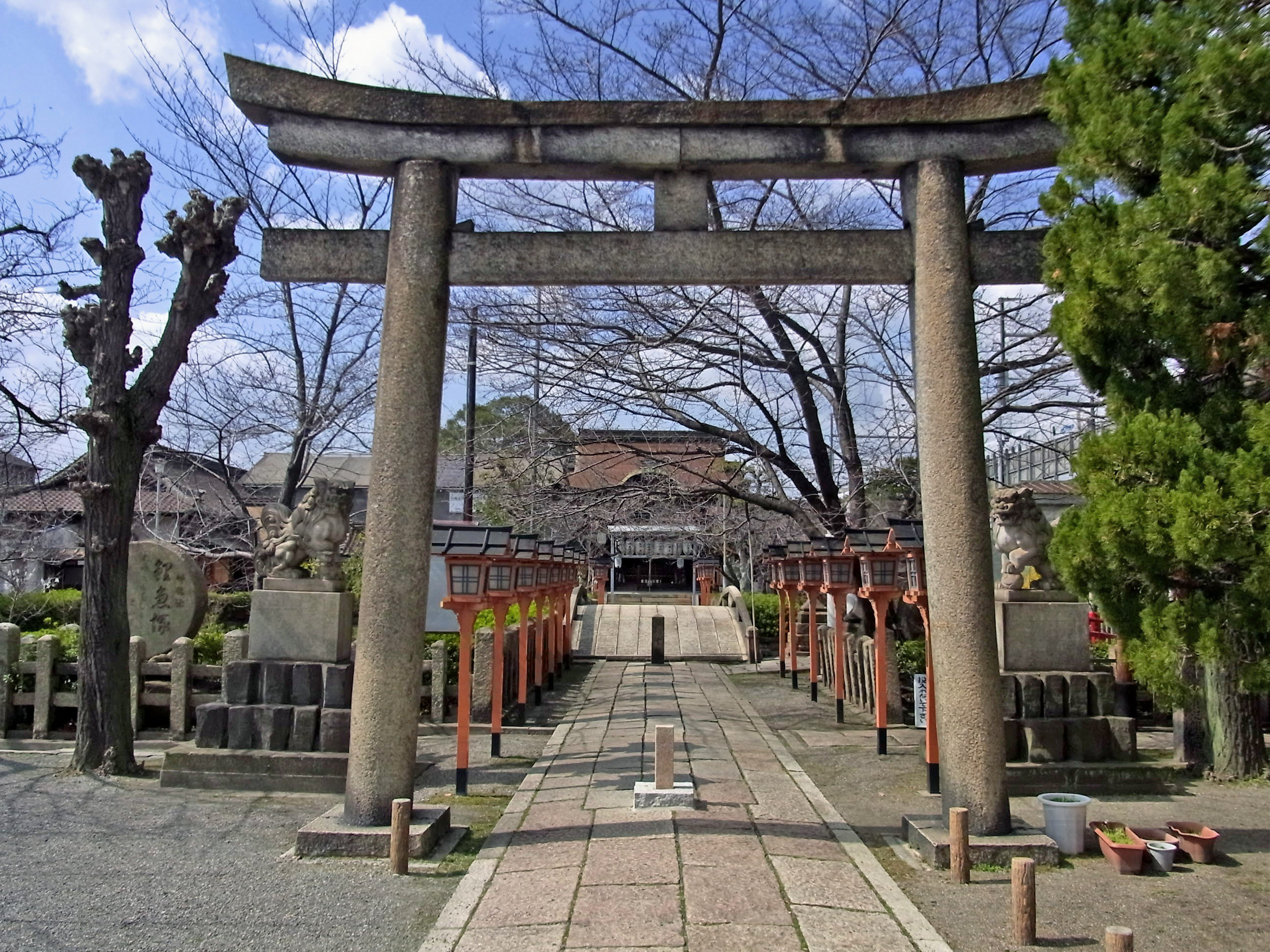 | 浄禅寺から少し南にある名神高速道路の下を越えると、戊辰戦争勃発の地である小枝橋が 見えてきて、そこに流れる鴨川を渡ると城南宮に着きます。 地図 |