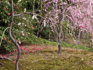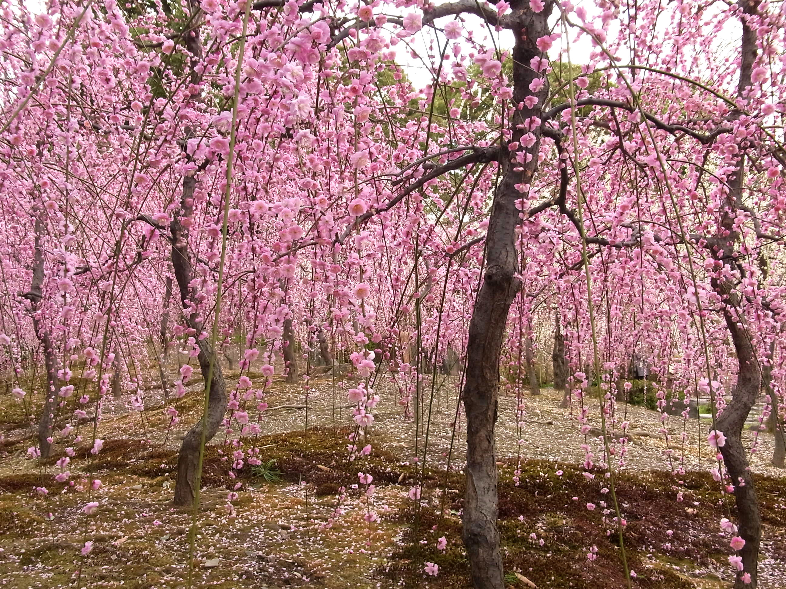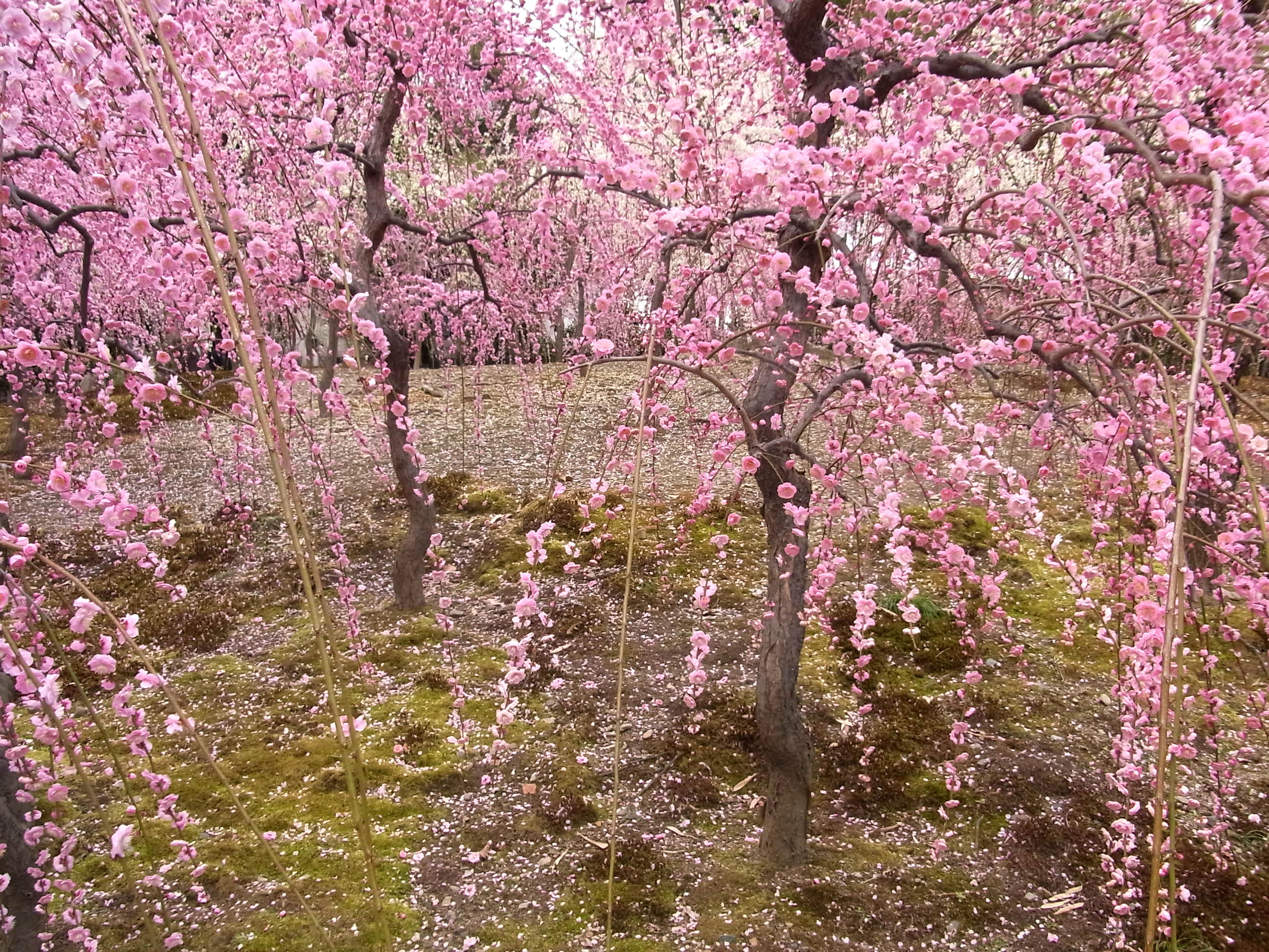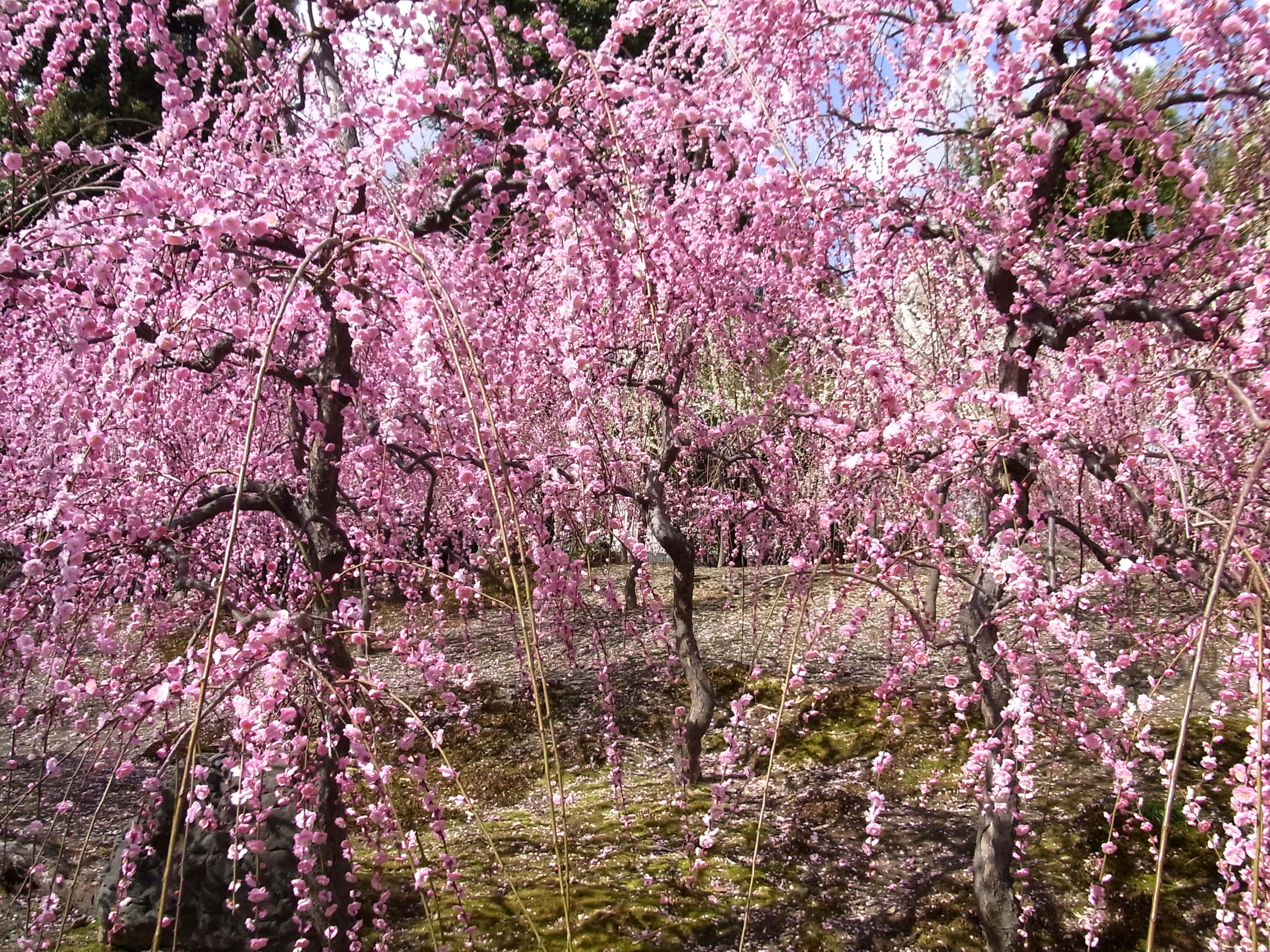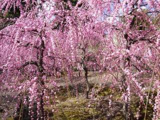 | 全庭満開のしだれ梅で埋め尽くされた見事な景色に、たくさんの観光客が魅了されていました。 |