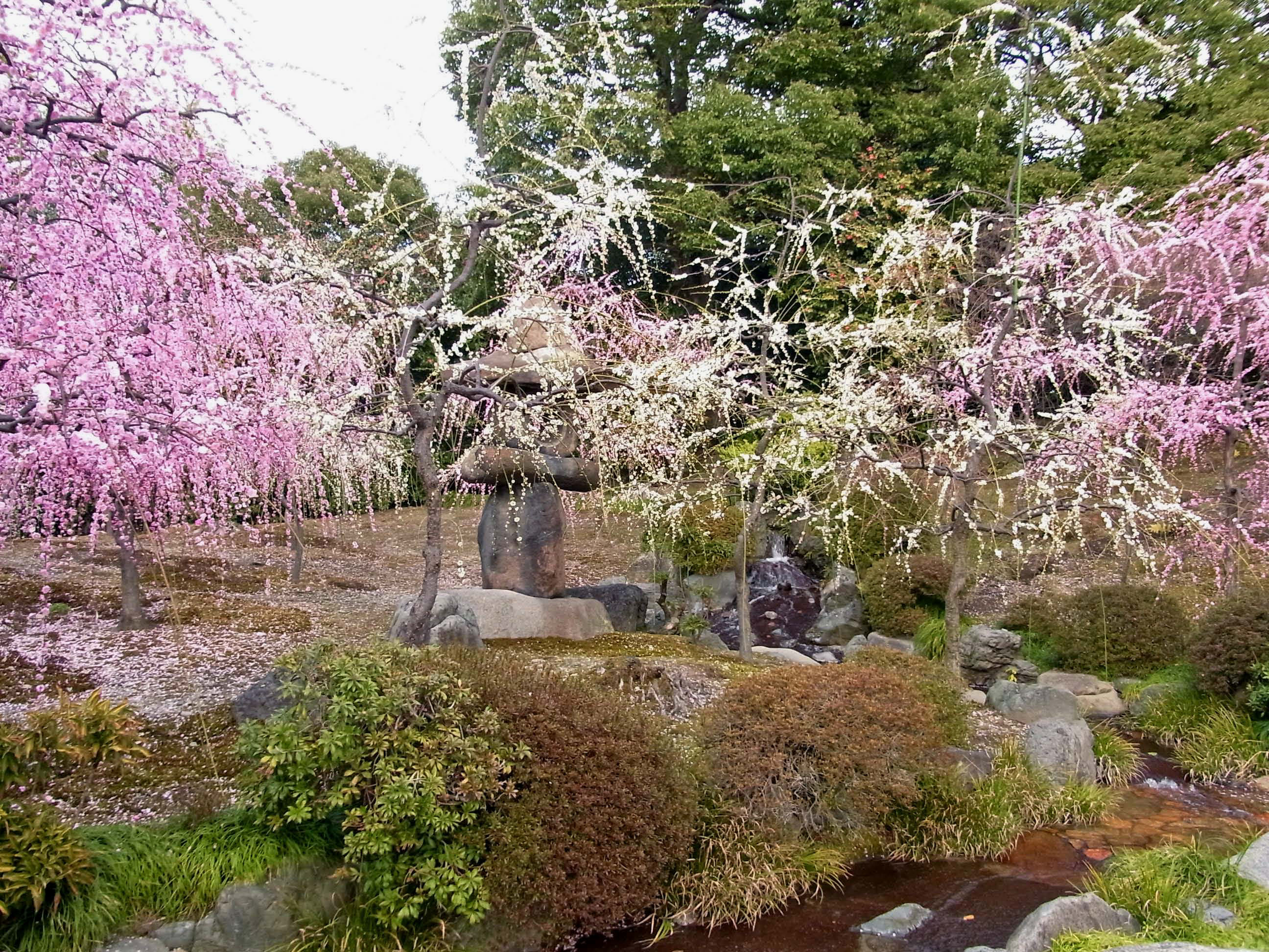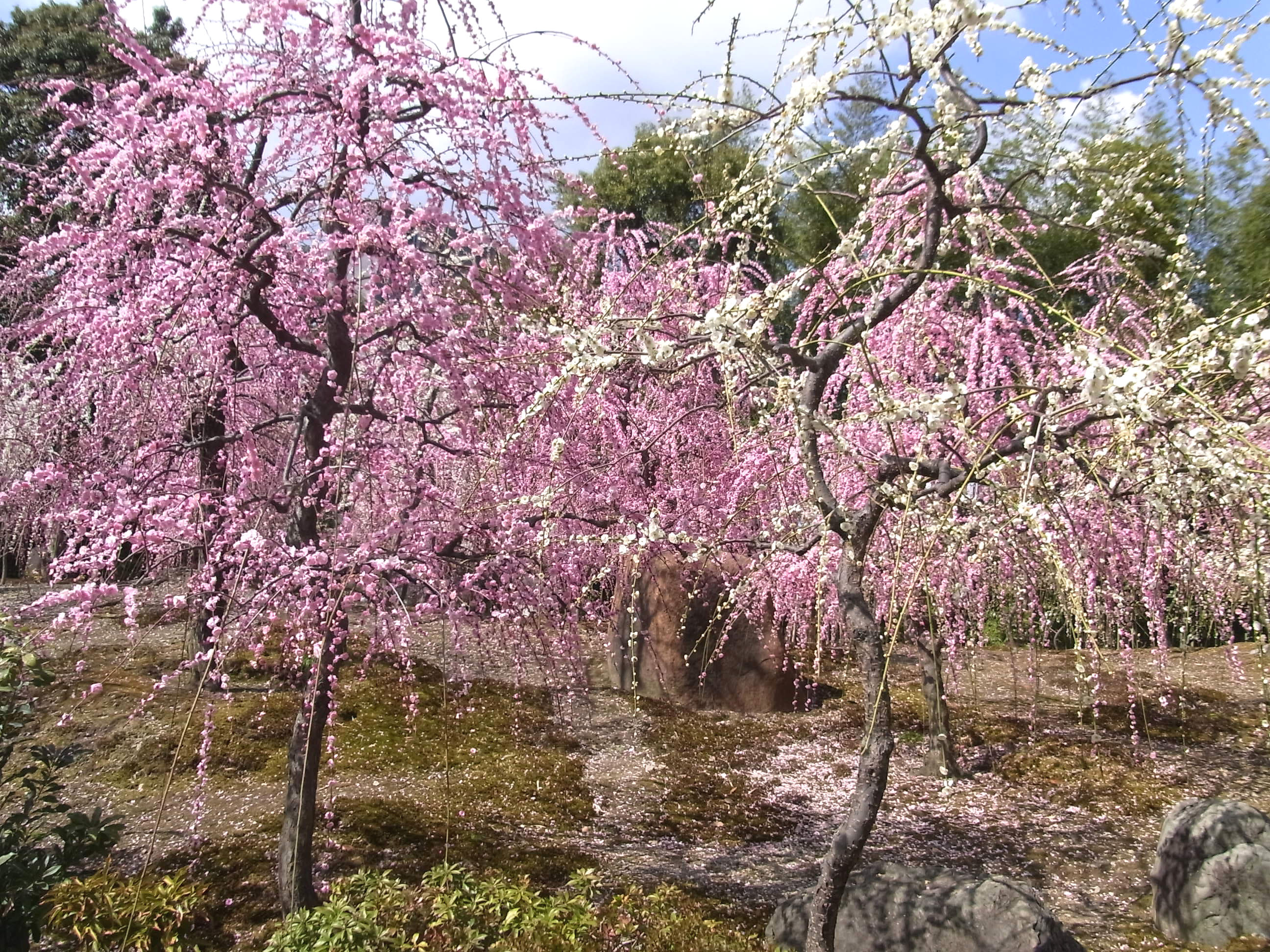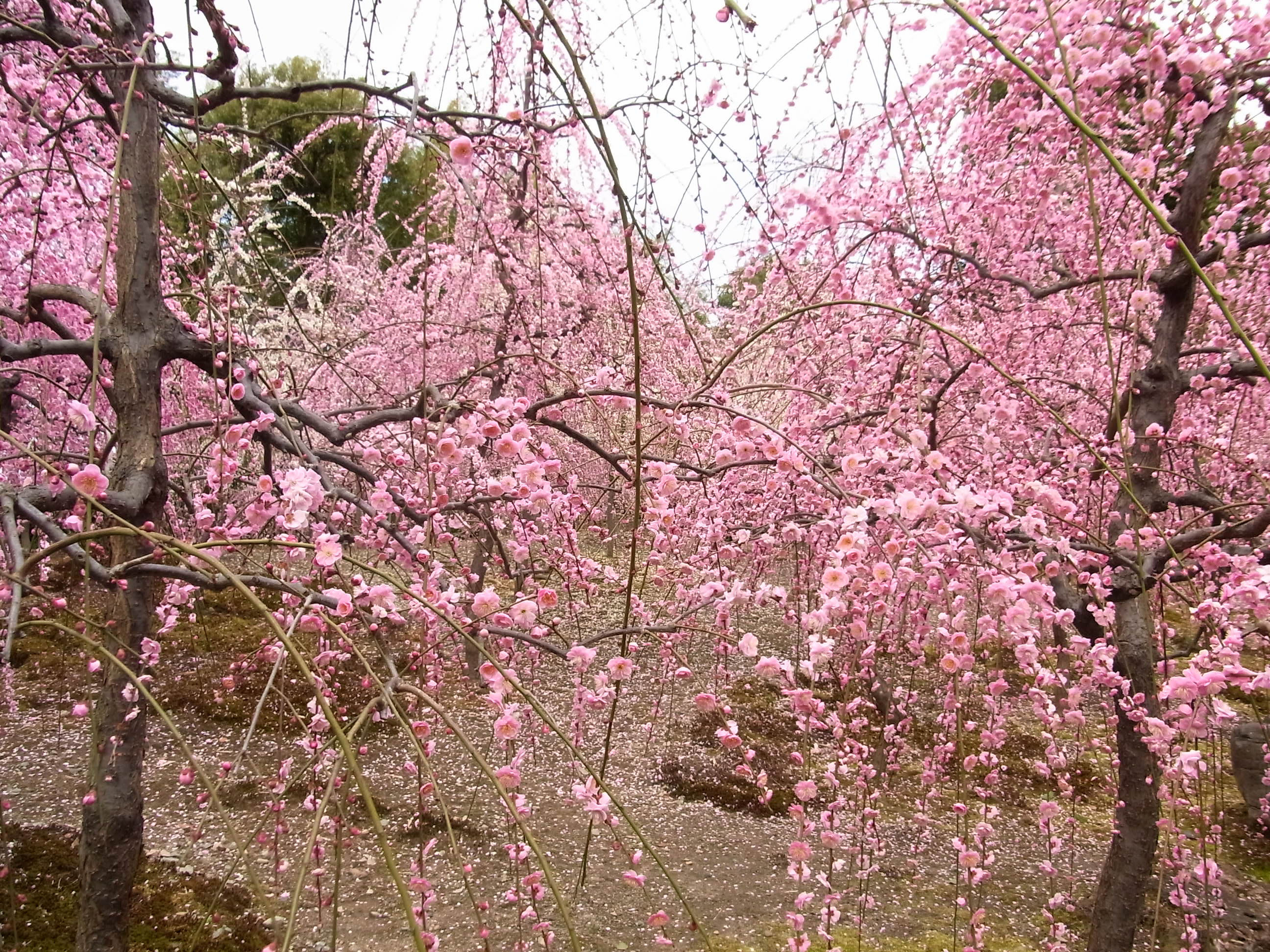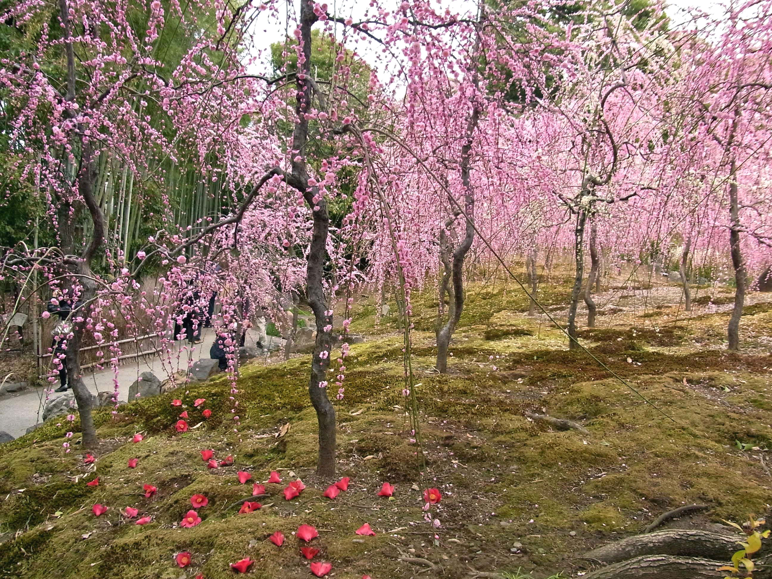 | 全庭満開のしだれ梅で埋め尽くされた見事な景色に、たくさんの観光客が魅了されていました。 |
