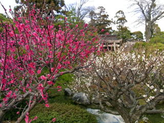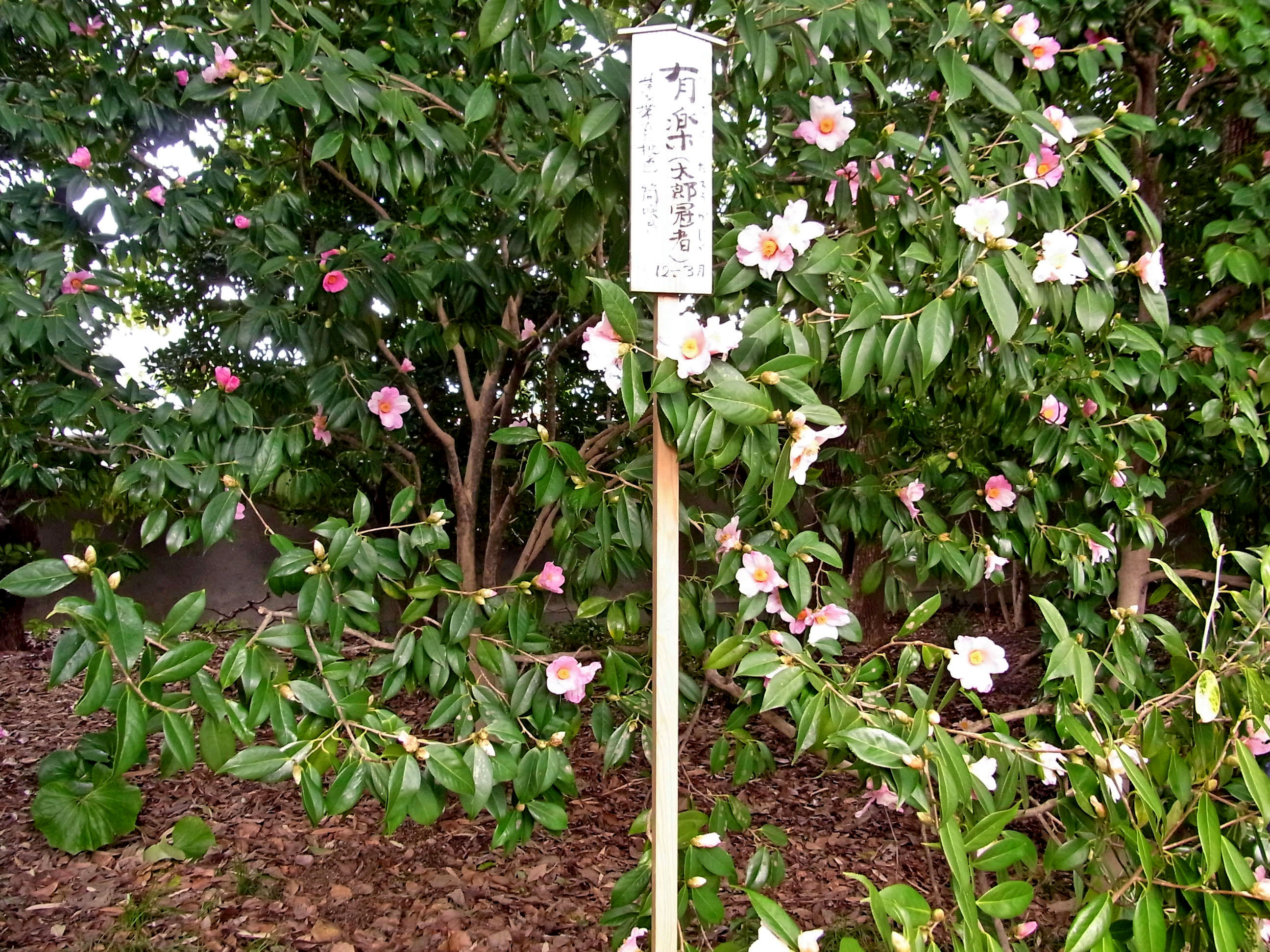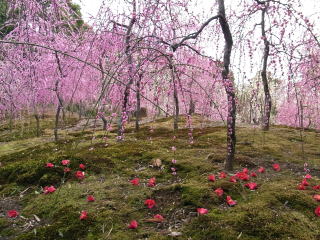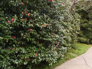 | しだれ梅を囲むように椿もたくさん咲いていました。 |