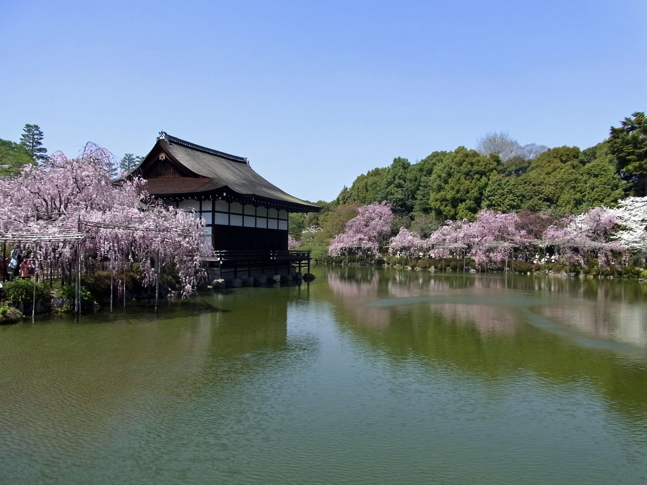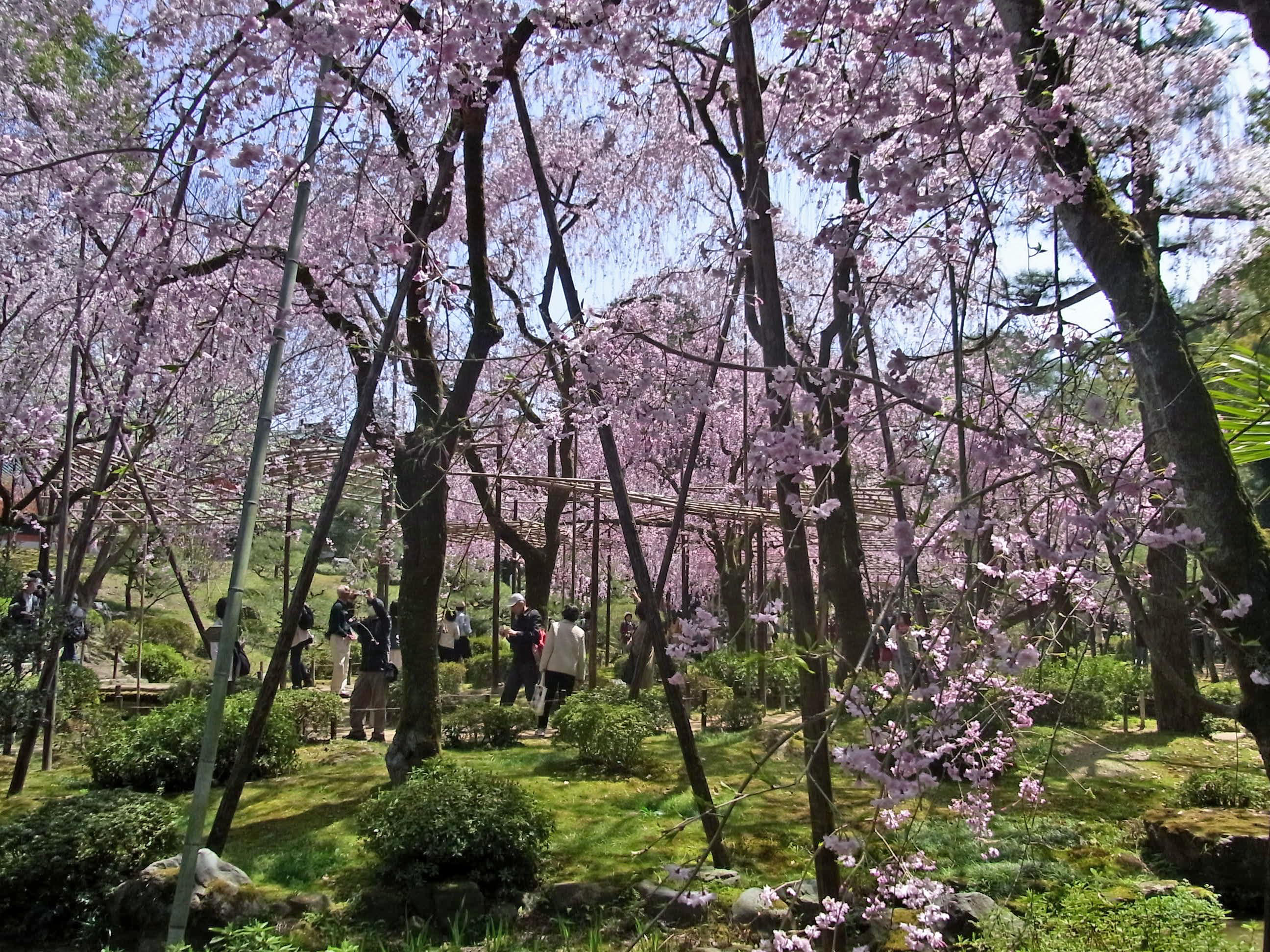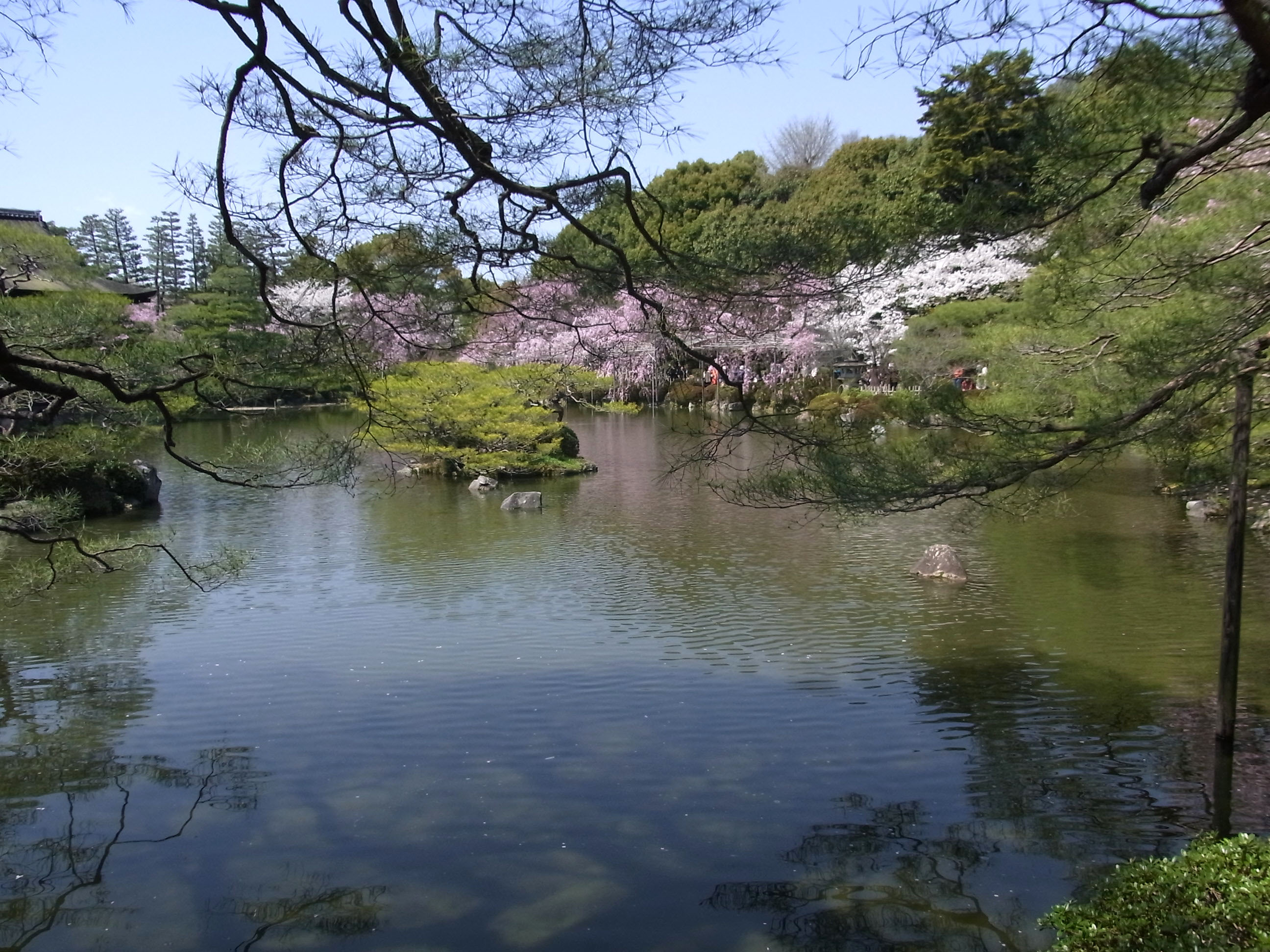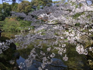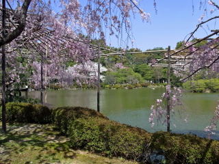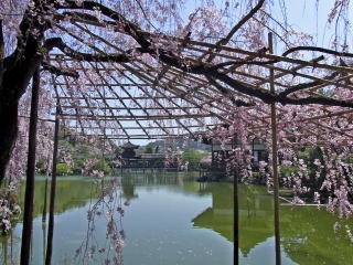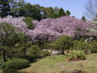 | 枝垂れ桜が満開の時季に、平安神宮に来たのは初めてでした。尚美館のある東神苑の美しさは 知っていたのですが、入口から入ってすぐの南神苑にこんなにたくさん枝垂れ桜があるのに、 初めて気付きました。 (写真をクリックすれば拡大されます) |