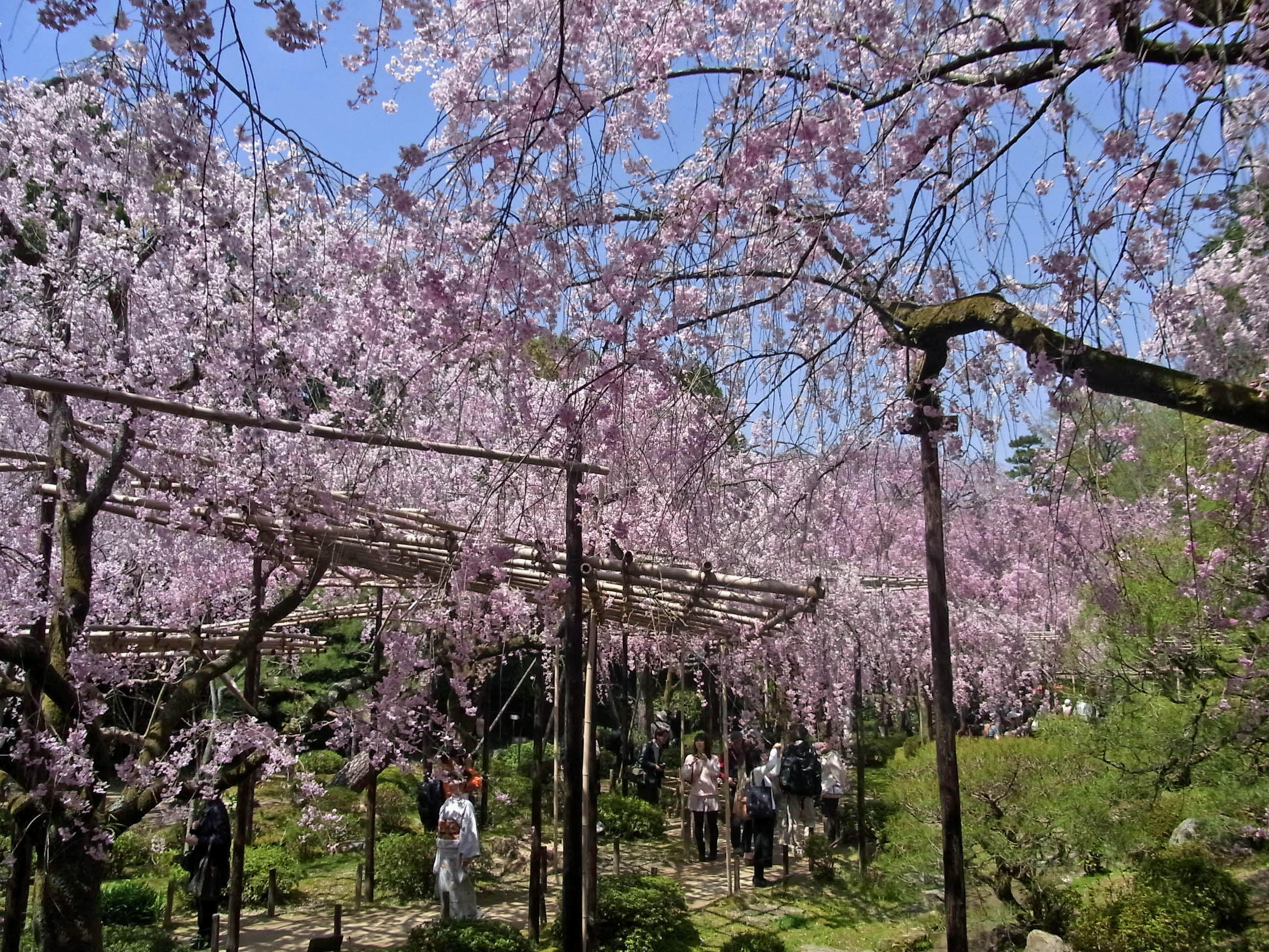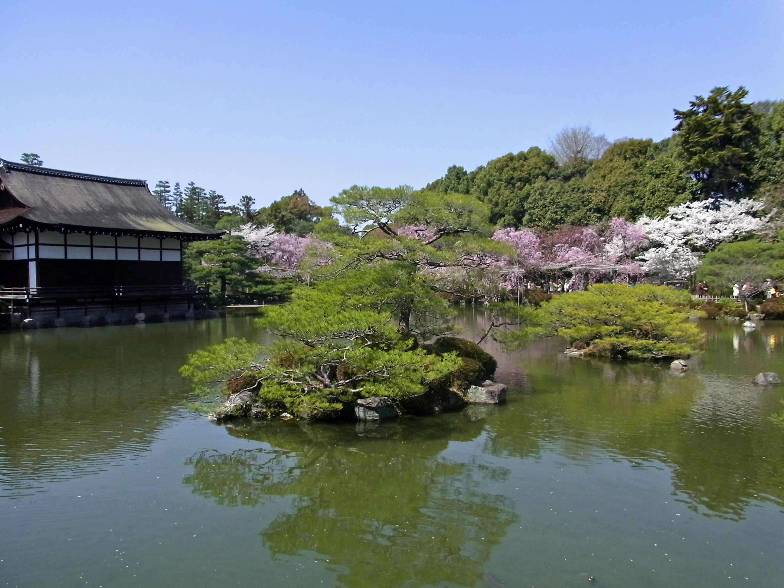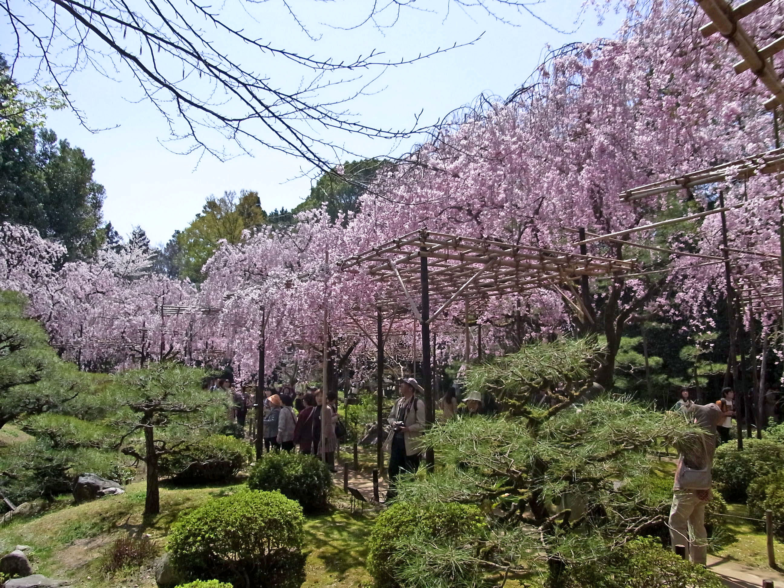 | 枝垂れ桜が満開の時季に、平安神宮に来たのは初めてでした。尚美館のある東神苑の美しさは 知っていたのですが、入口から入ってすぐの南神苑にこんなにたくさん枝垂れ桜があるのに、 初めて気付きました。 (写真をクリックすれば拡大されます) |