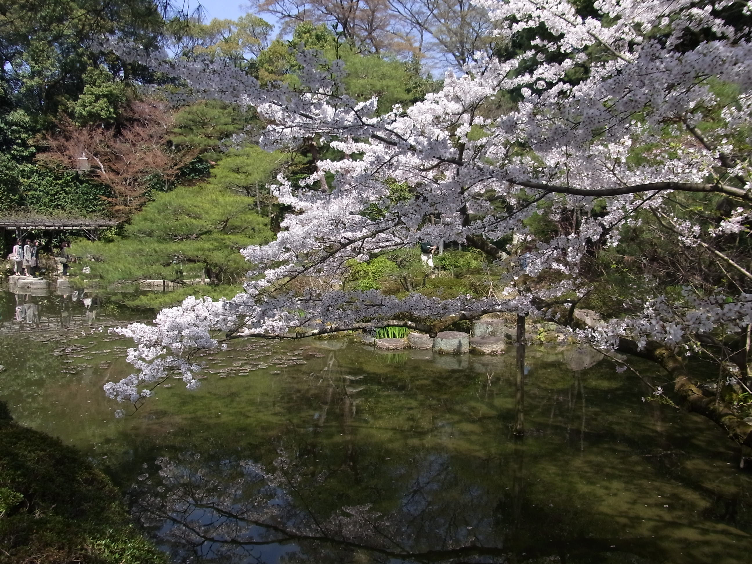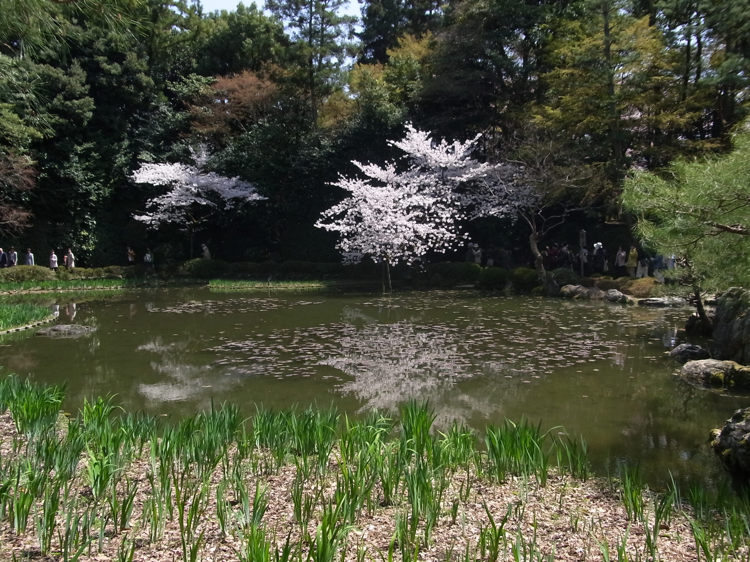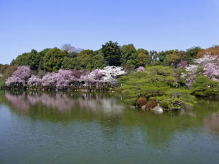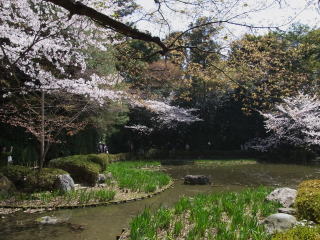 | この西神苑は、6月になれば花菖蒲の白・紫・江戸紫・京紫の色で華やかな池に変身します。 |
