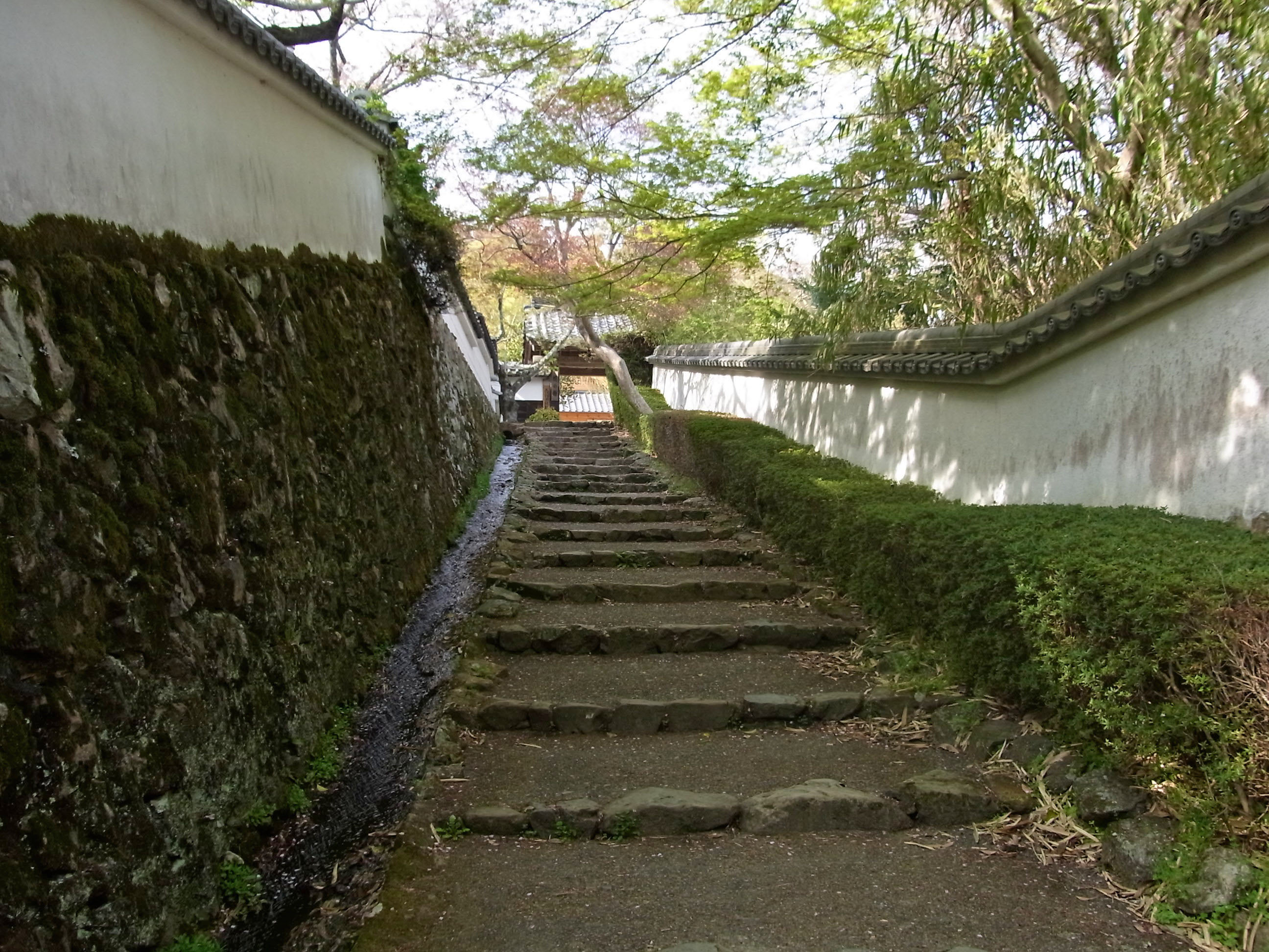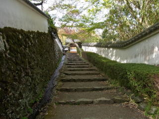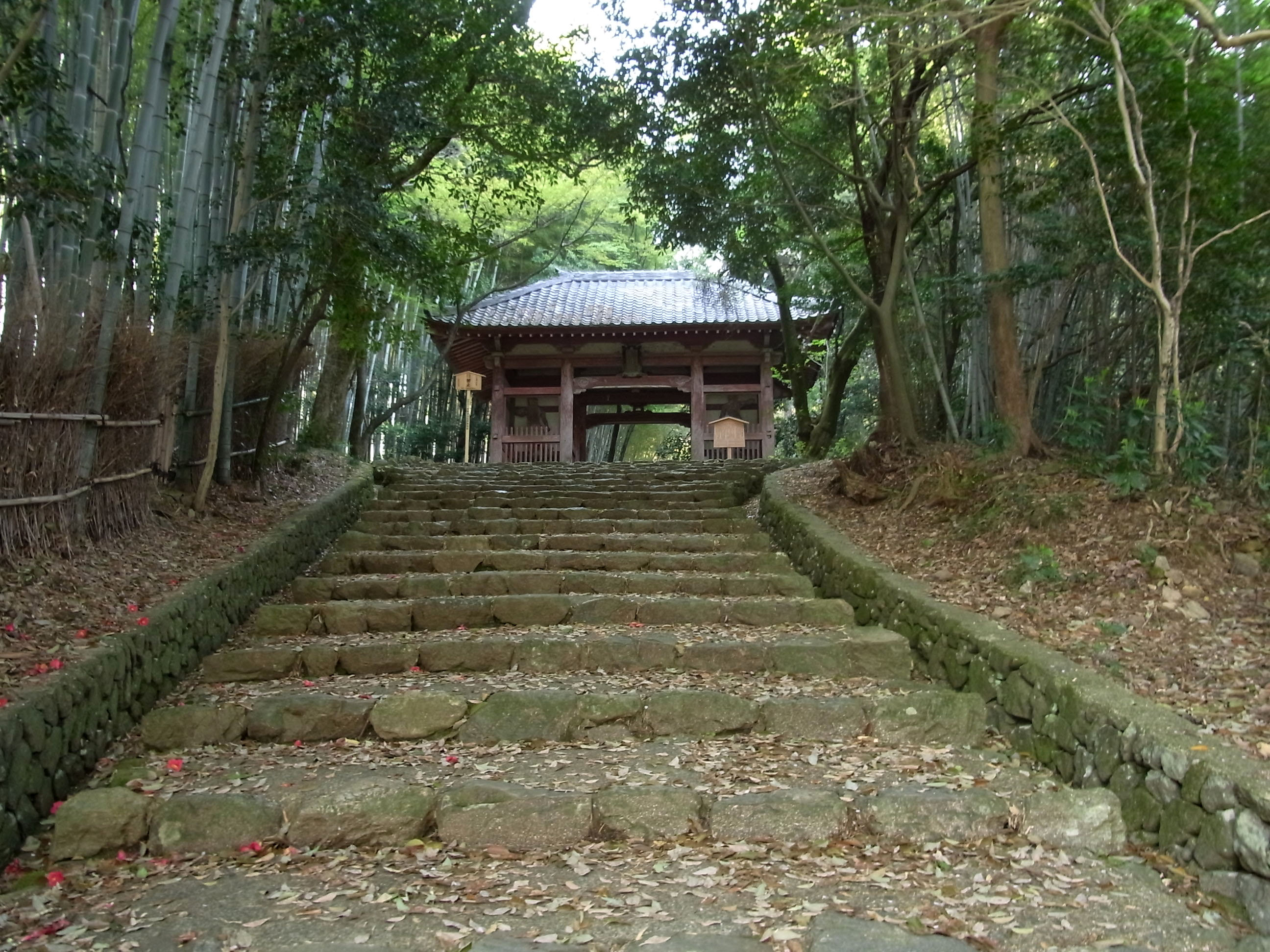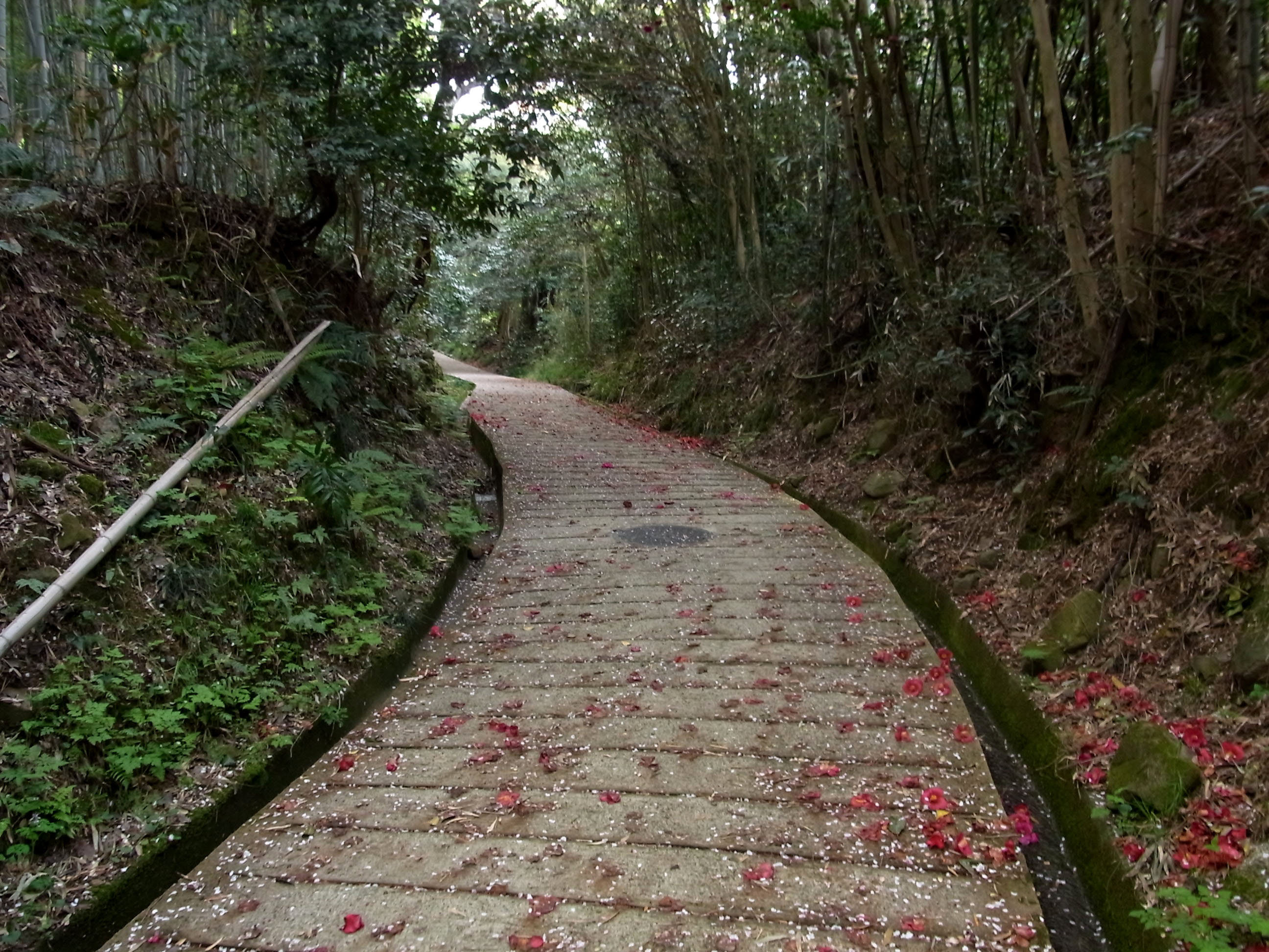 | 勝持寺に行くのに大原野神社から近道を通ることが多いのですが、本来の山門から入って 長い坂道の参道を歩くと、山寺の趣が感じられます。参道の両脇には、椿の落花が一杯でした。 |