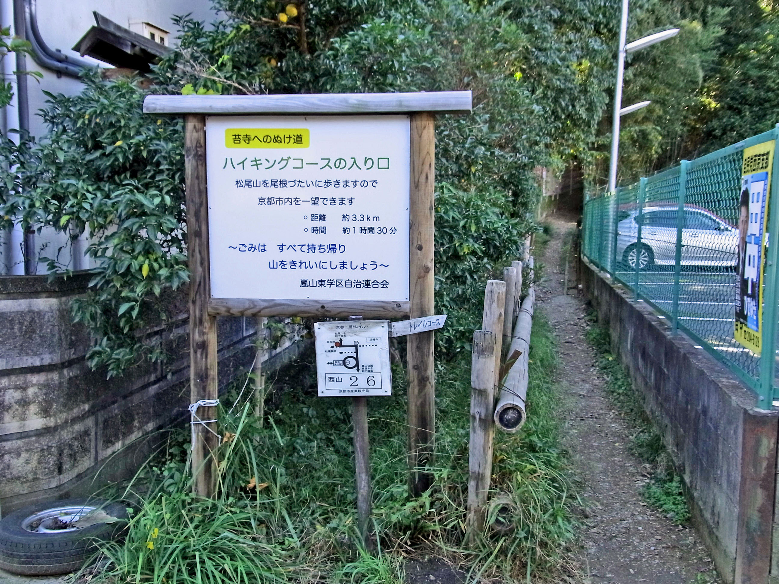 | 春、松尾大社に山吹を見に行った帰り、西山トレイルの入口を見つけてから、近い内に歩こうと思 っていた嵐山〜苔寺までの尾根道を歩いてきました。嵐電嵐山駅から渡月橋を渡って十三参りで 有名な法輪寺の前を通って、旧道を少し行ったところの駐車場と廃屋の隙間に入口があります。 (写真をクリックすれば拡大されます) 地図 |