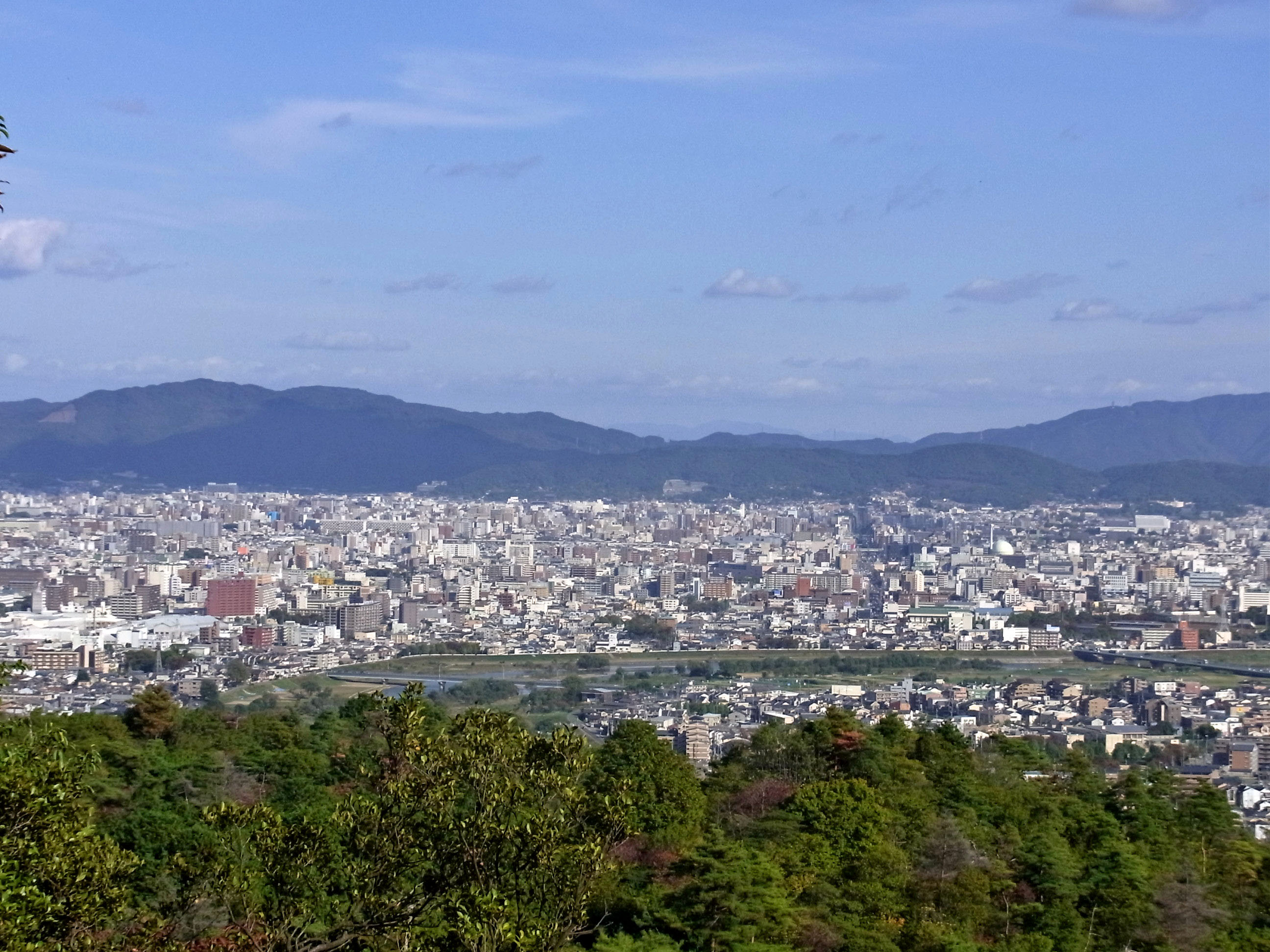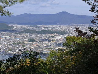 | 三つ目の展望出来る場所で、東山の左端に右大文字、真中に東大谷さんの墓地が見えます。 |