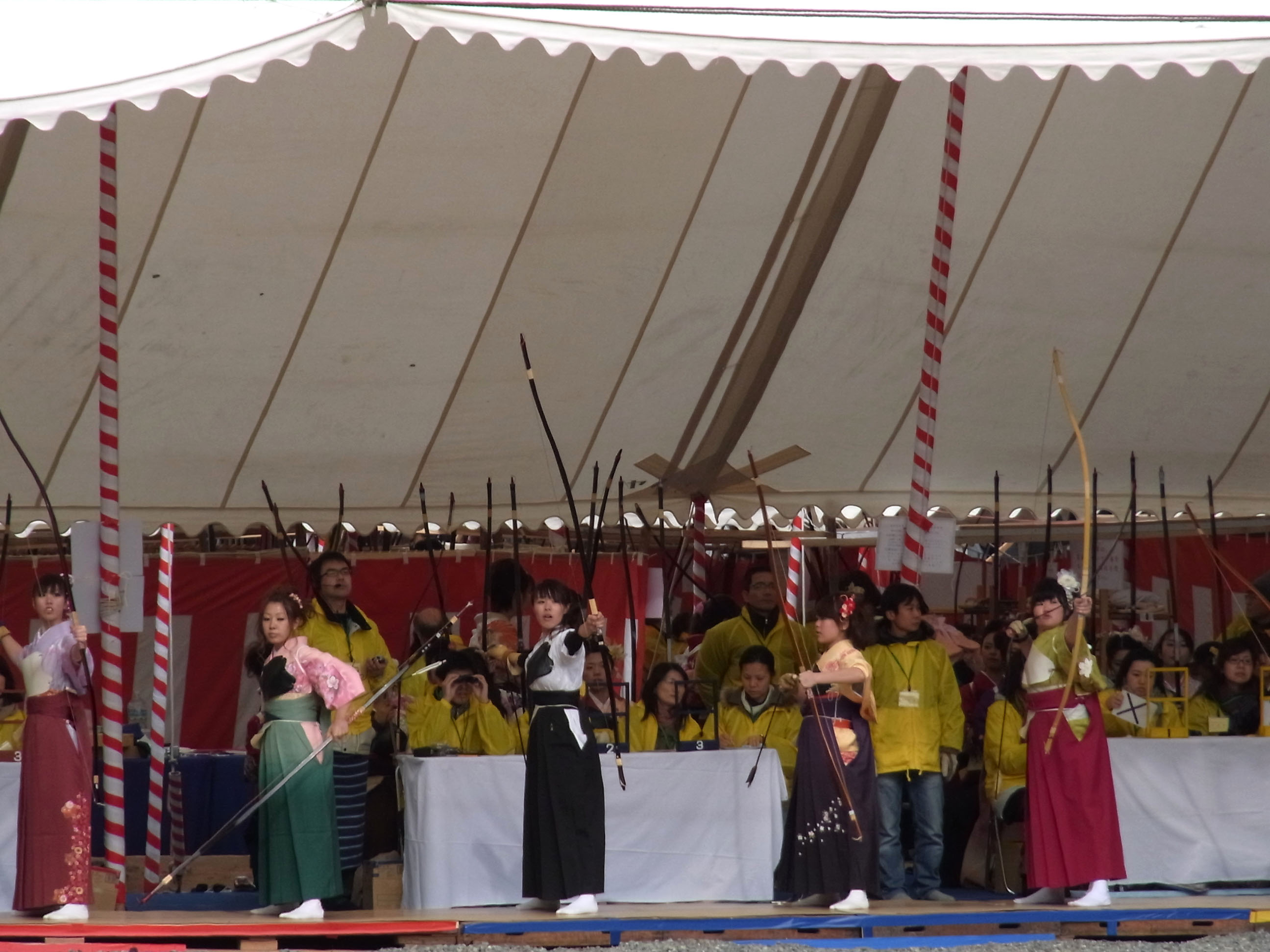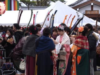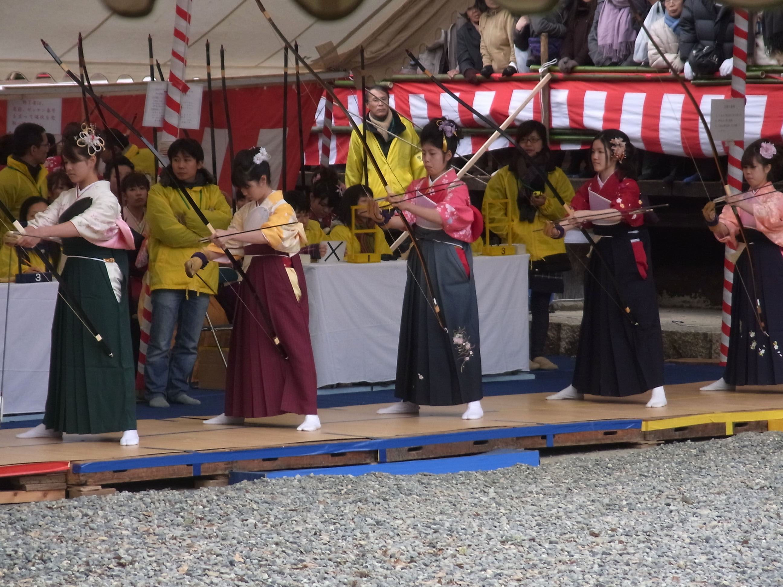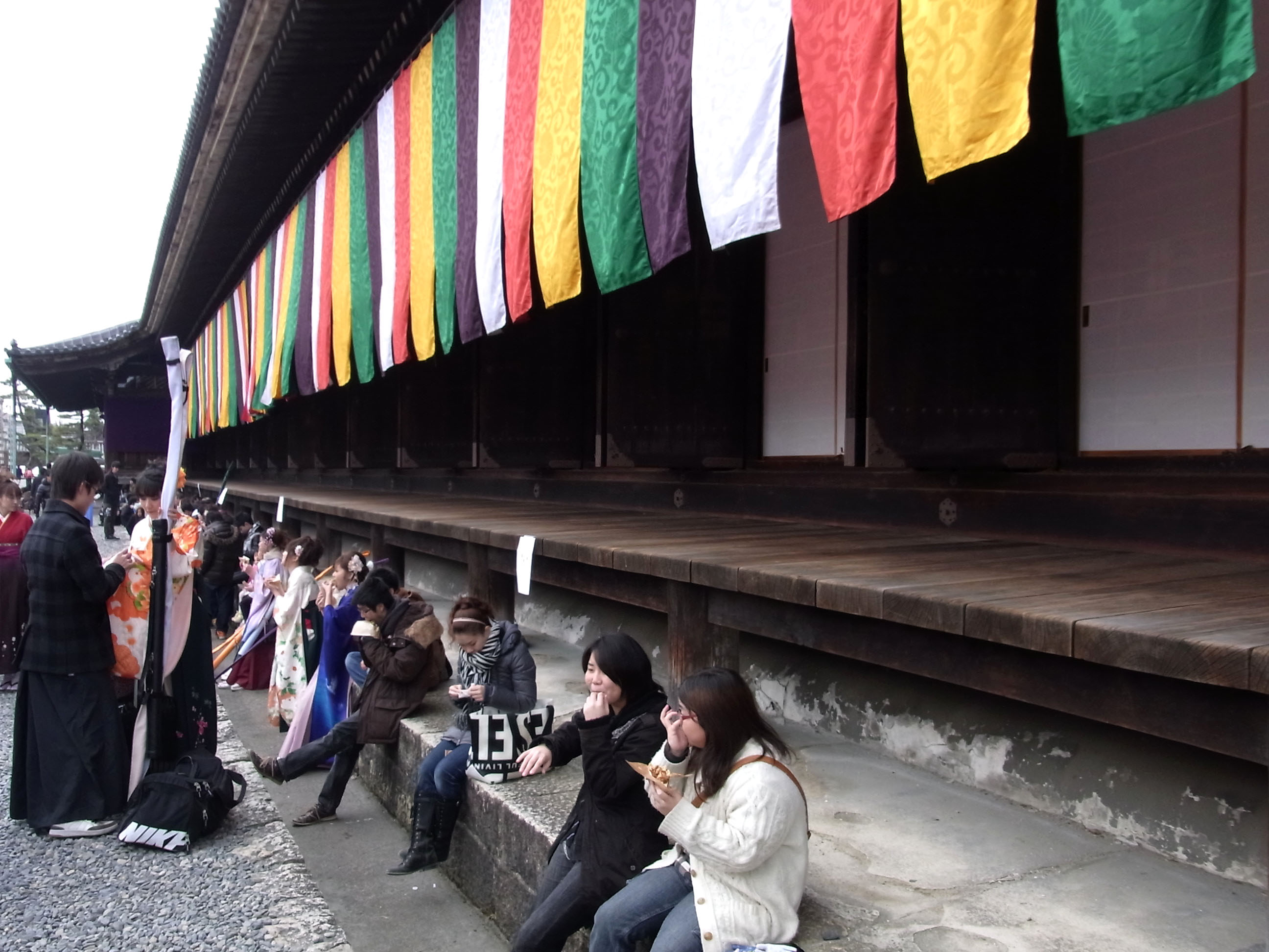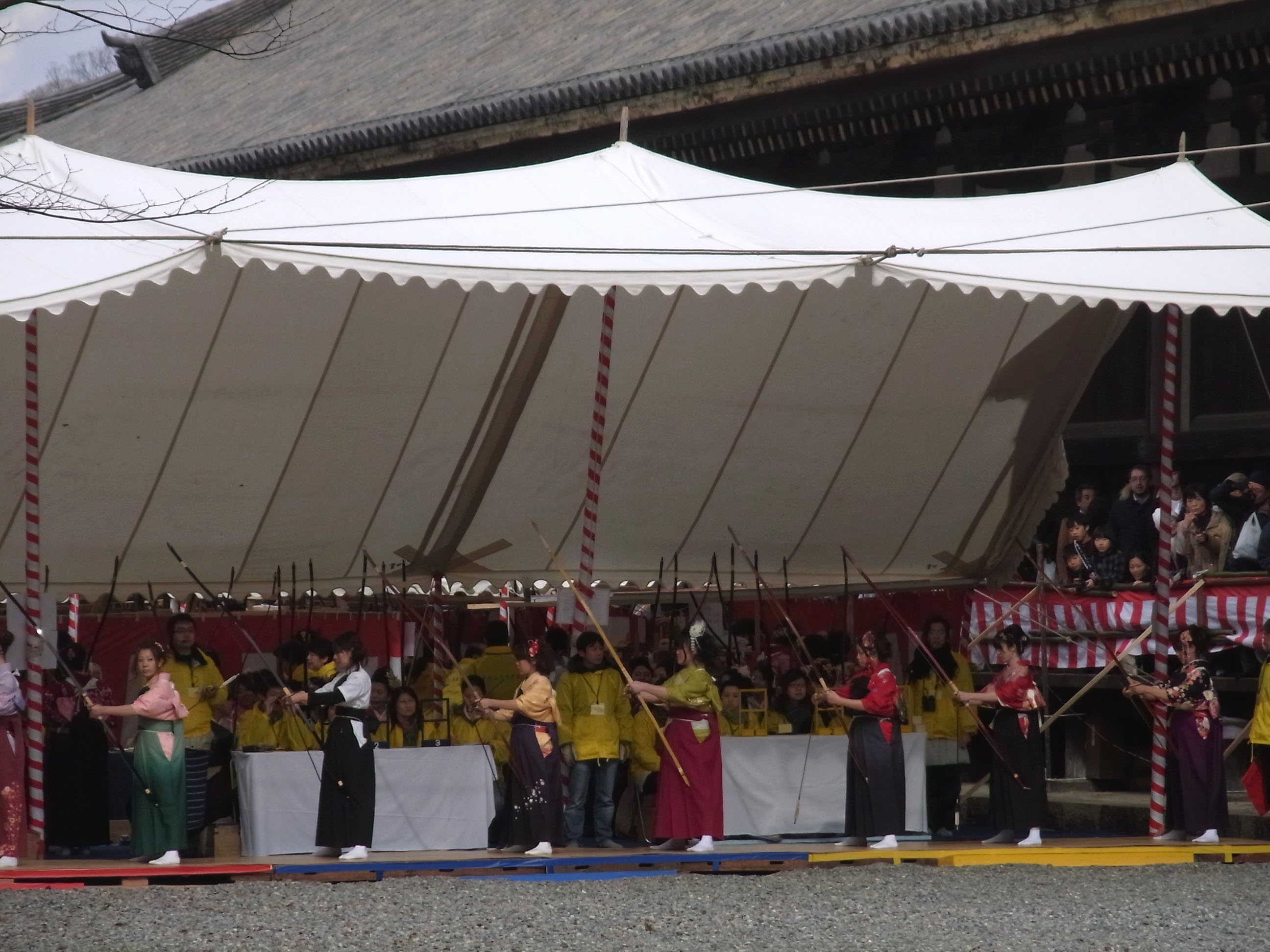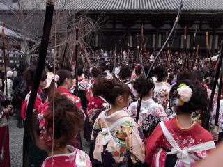 | 五年振りに三十三間堂の通し矢を見に行きました。弓を持った振袖姿の女子と羽織袴の男子が 以前と全く同じ風景で、タイムスリップした感覚になりました。 (写真をクリックすれば拡大されます) |