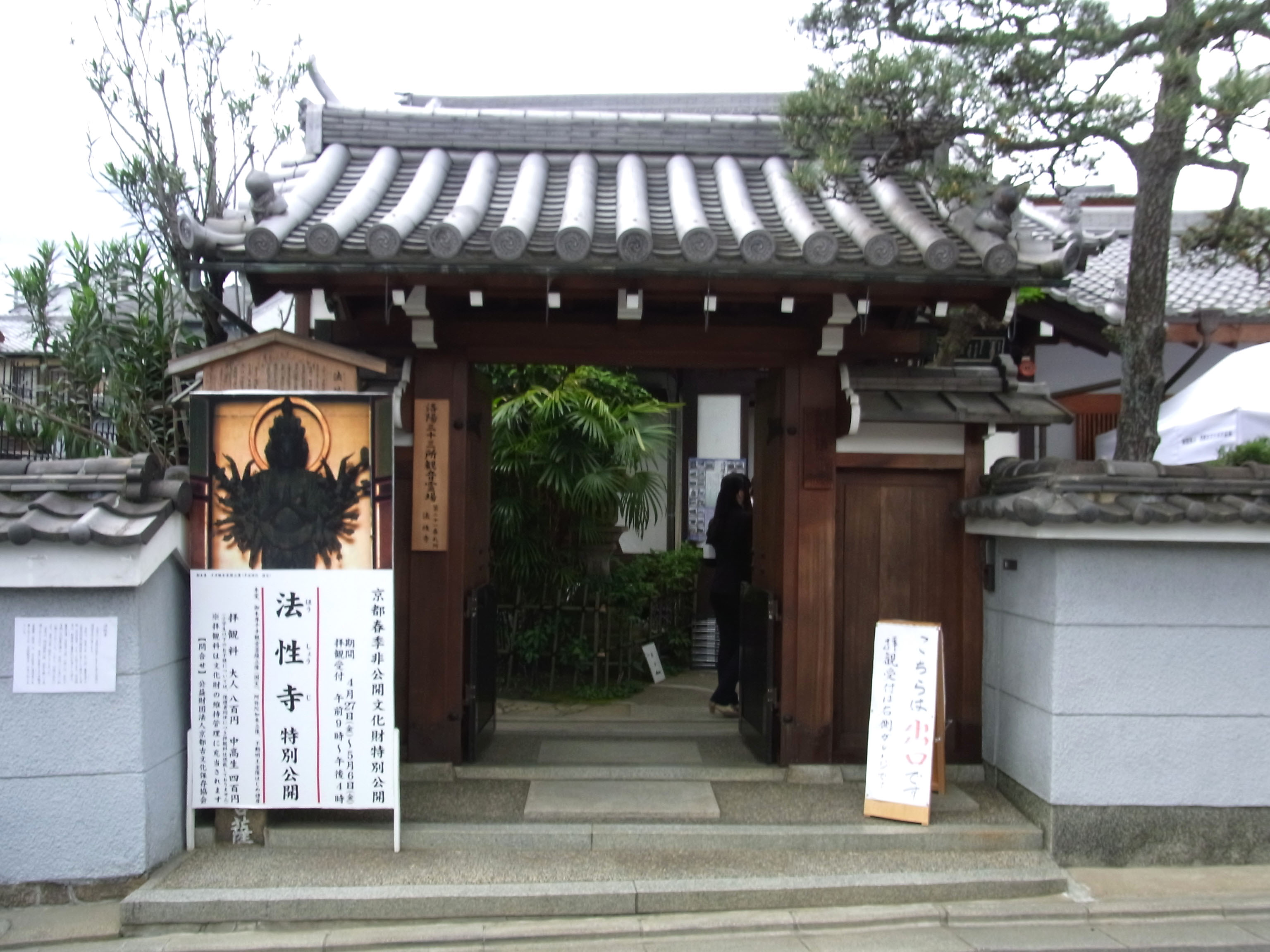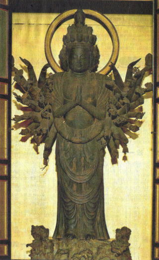 京都にある国宝の仏像は殆ど見ているのですが、 ここは普段公開されていないので、以前から気 になってました。今年の「非公開文化財特別公 開」に初めて参加したので、やっと見る事が 出来ました。 知らずに前を通ると、民家と区別が付かない程 小さなお寺ですが、平安中期には有名な大寺院 でした。 京都新聞に載った写真を見た時、大阪藤井寺市 の道明寺にある国宝の十一面観音を連想しまし た。 同じ一木素木造りの平安初期木彫仏と全然違う 精緻な所謂檀像様の仏像です。 像高約110cmで桜の一木造りです。 通常の千手観音は十一面なのですが、 こちらは、正面と左右に憤怒面・菩薩面の 三面、頭上に二十五面、計二十八面もある 頭上面が有名です。 小さくて異形にもかかわらず、精緻さと均整の 取れた姿は見事です。 唯、遠くからしか見られなかったので、細部が 解らず、時間と人数制限までしているのであれば、 内陣まで入れて貰いたかったのが、本音です。 地図 |