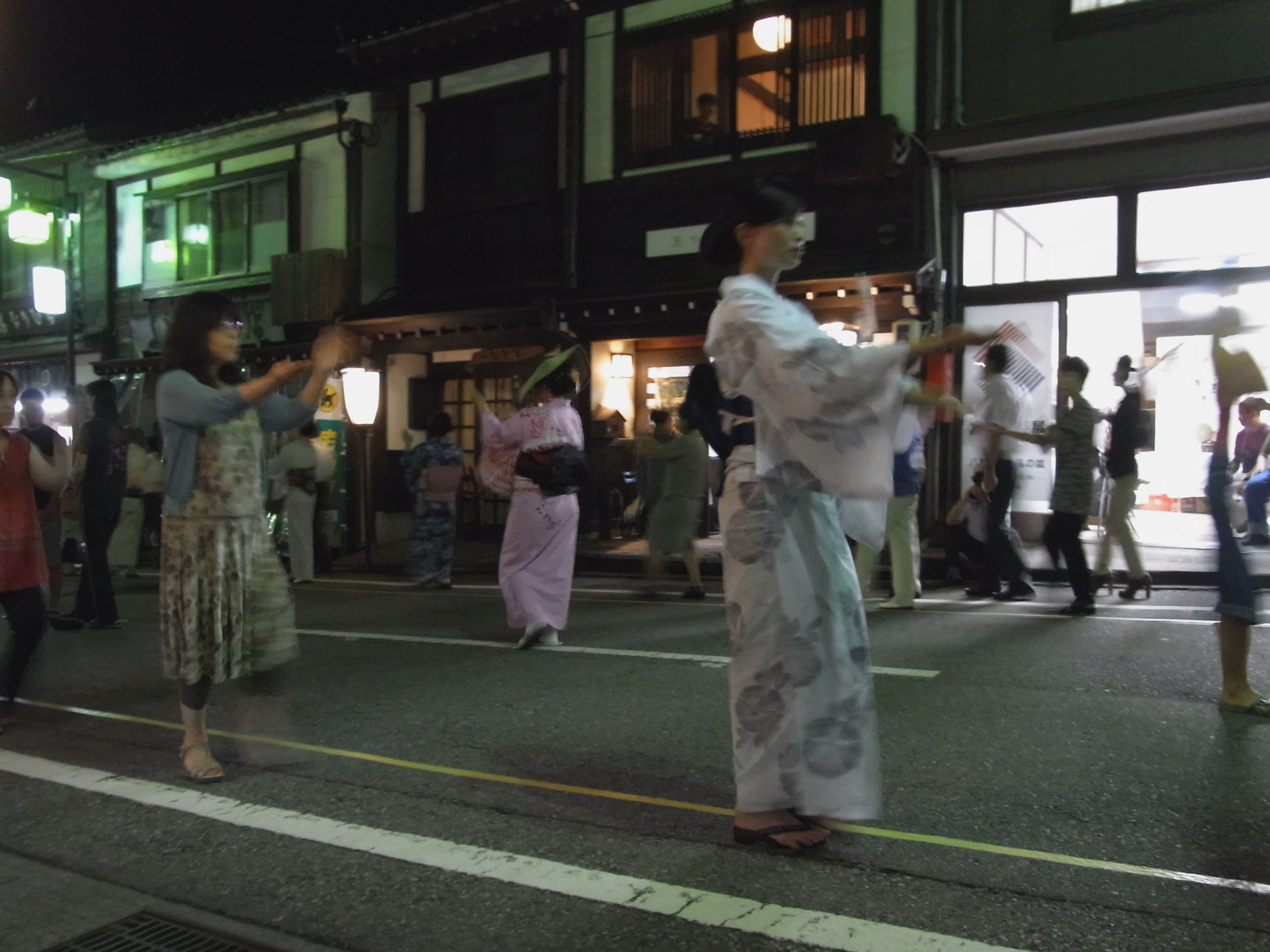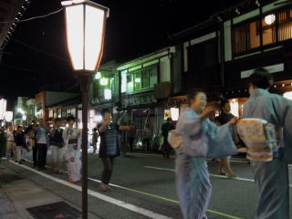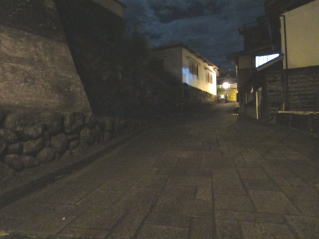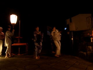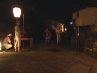 | 午前2時過ぎに真っ暗な坂の上から胡弓が聞こえて来て、先頭に手だれの二人の踊り手が静かに 前を通り過ぎました。一番見たかった町流しをやっと見られたと思いました。 昔見た町流しをもう一度なんて、望むべくもないのは判っていますので・・・ 地図 |