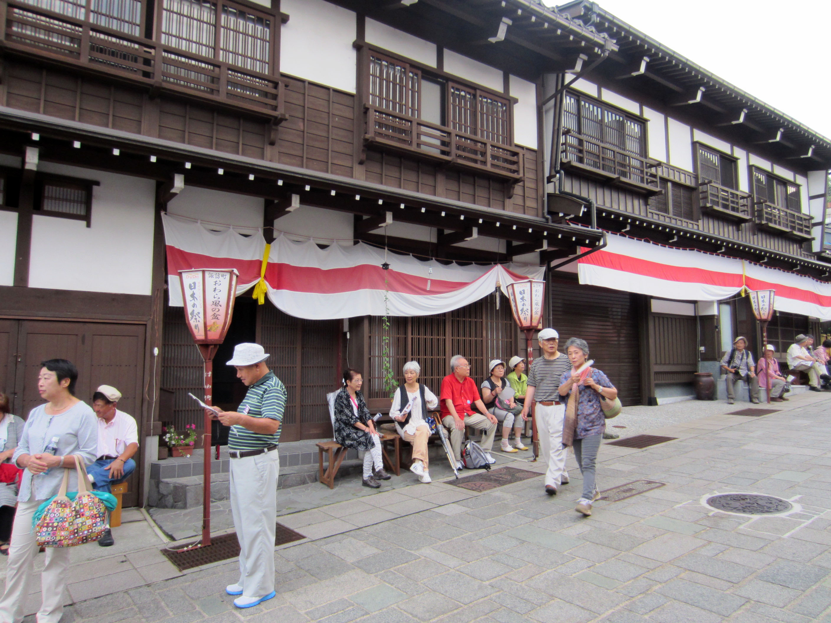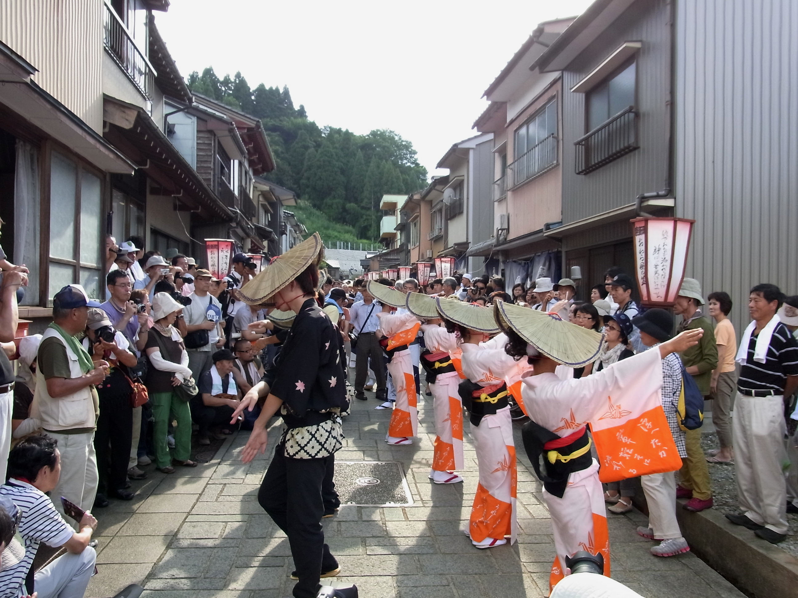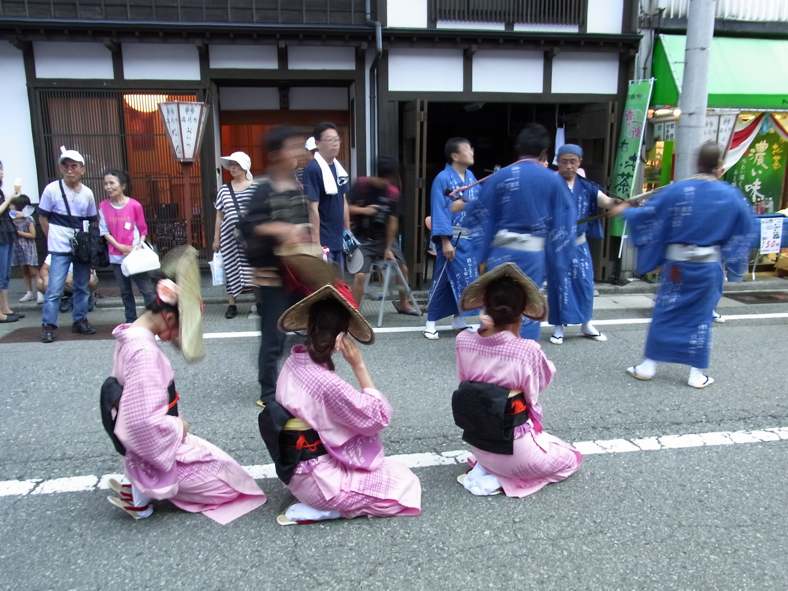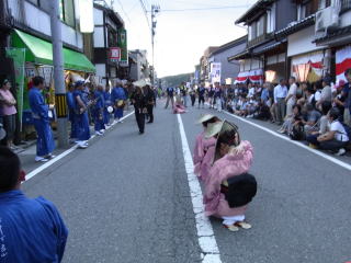 | 花付の踊りの時だけは、完全に道を遮断します。そして胡弓が鳴り出すと、それまでの騒々しさが すっと静かになり、胡弓と三味線と太鼓の音だけになって粛々と踊りが始まります。 正面に座って居る者がカメラを構えるのが憚られるような、厳かな雰囲気さえありました。 |