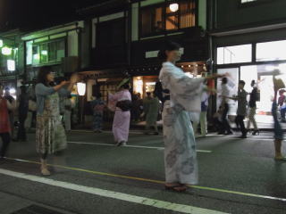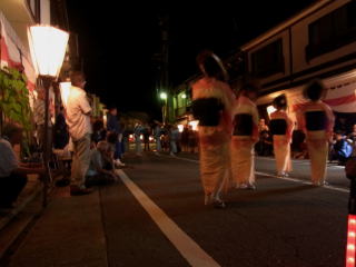 | 12時まで各町内で大小の輪踊りが行われます。初めての人、揃いの浴衣のグループ、地の人と 超初心者から熟練の人まで一緒になって踊り続けます。 こちらは上新町の輪踊り |