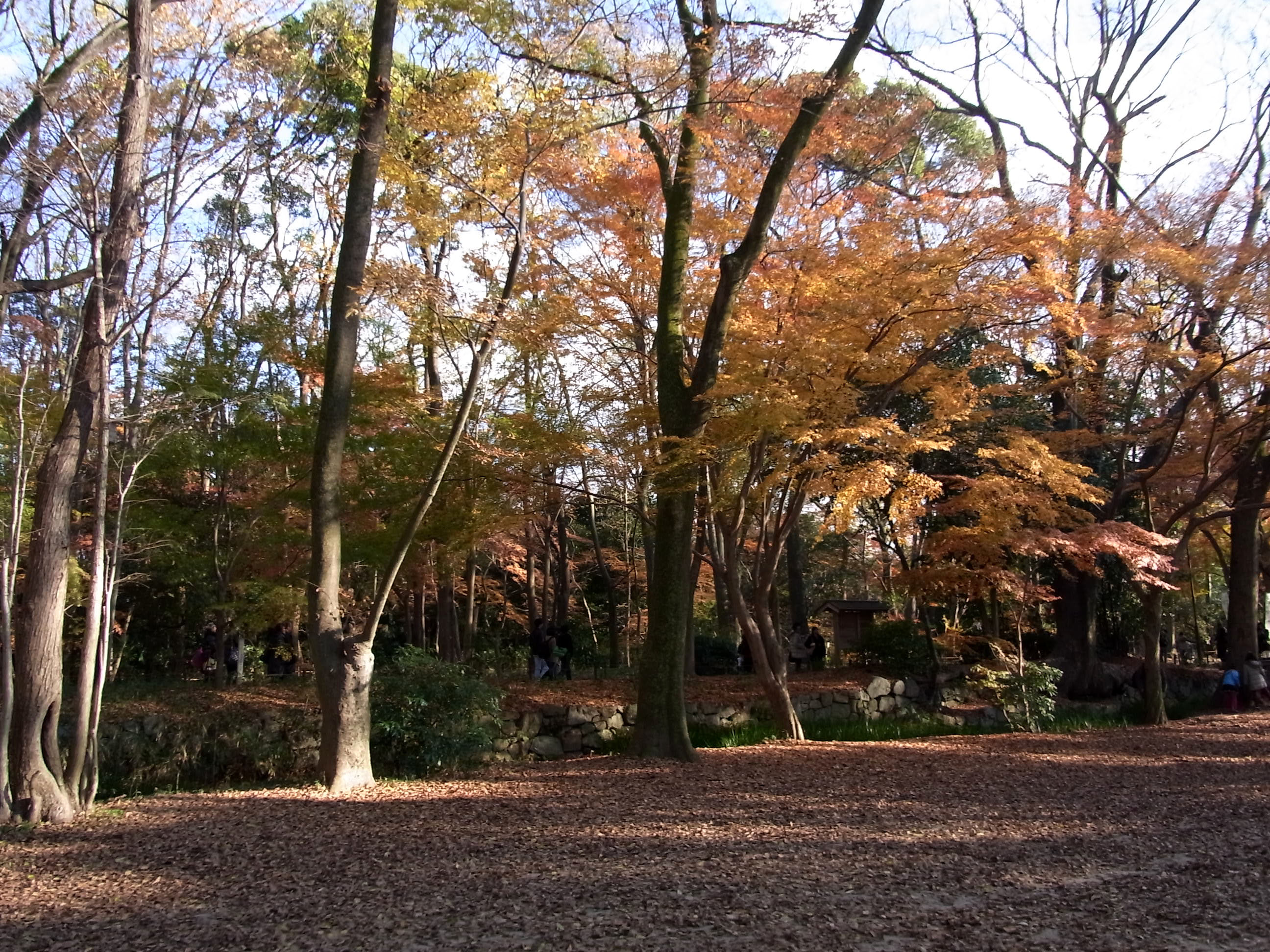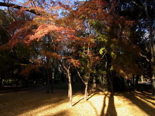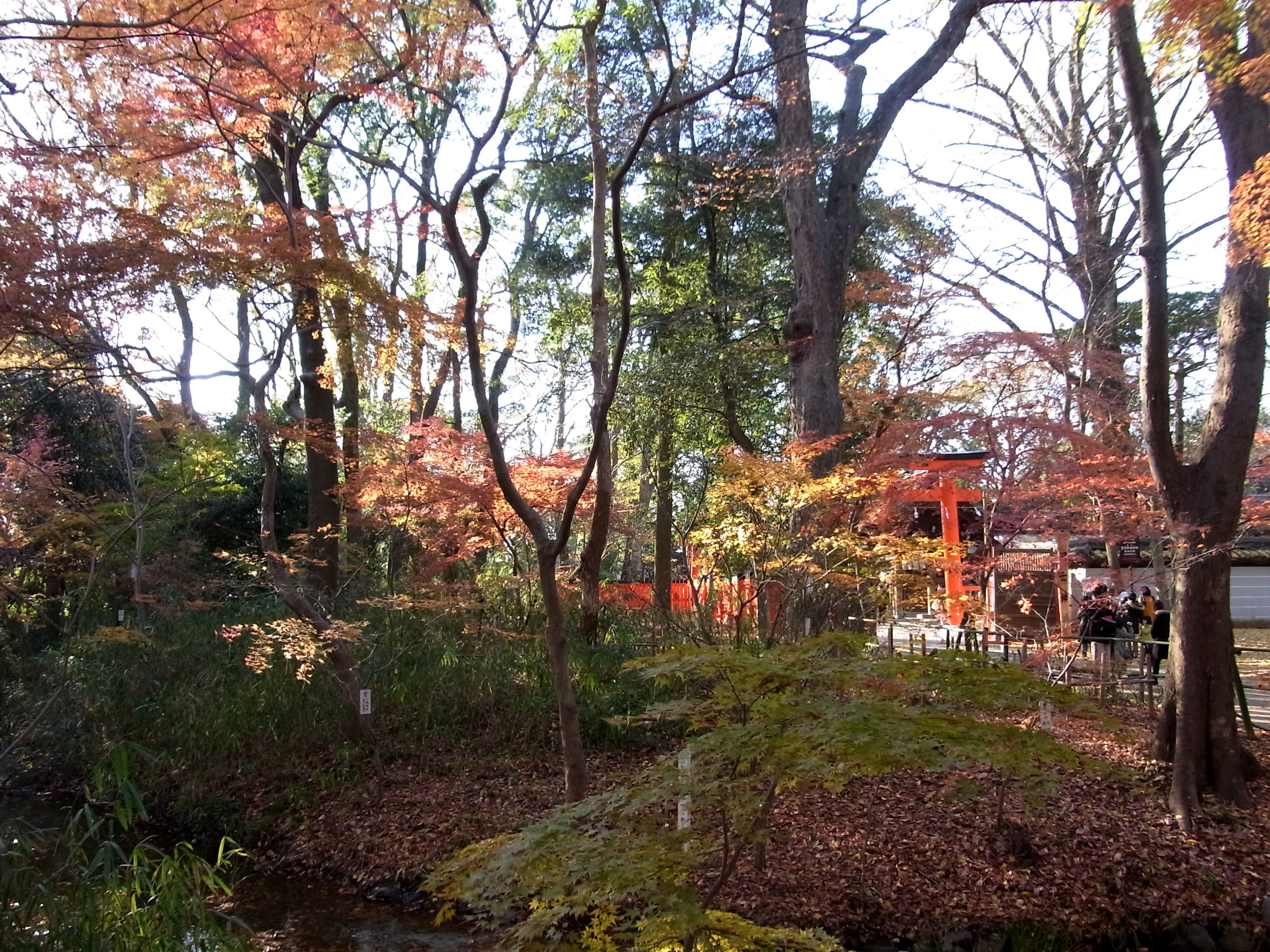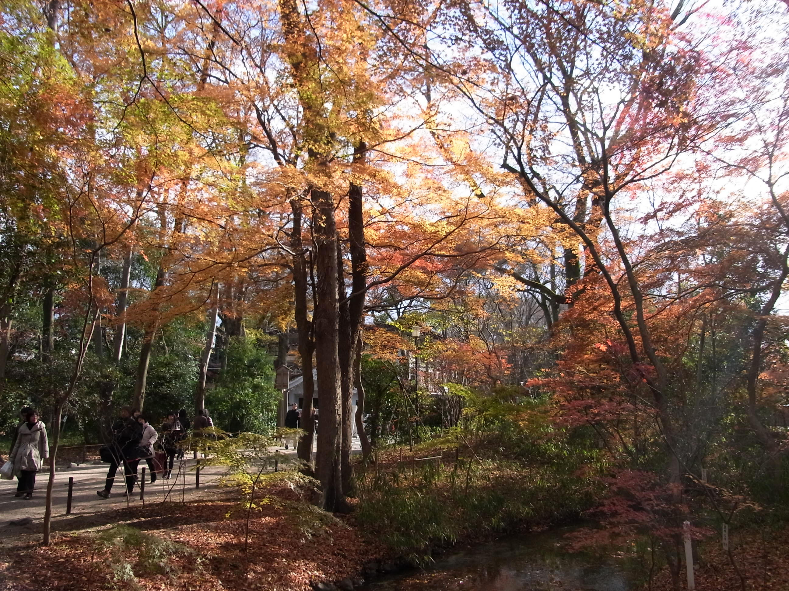 | 12月上旬なのに底冷えのする真冬の寒さでしたが、下鴨神社はたくさんの人が来ていました。 京都で一番遅く紅葉するので期待して行ったのですが、未だ紅葉する途中なのか赤く染まった 樹が少なくて、少し期待外れでした。 (写真をクリックすれば拡大されます) |