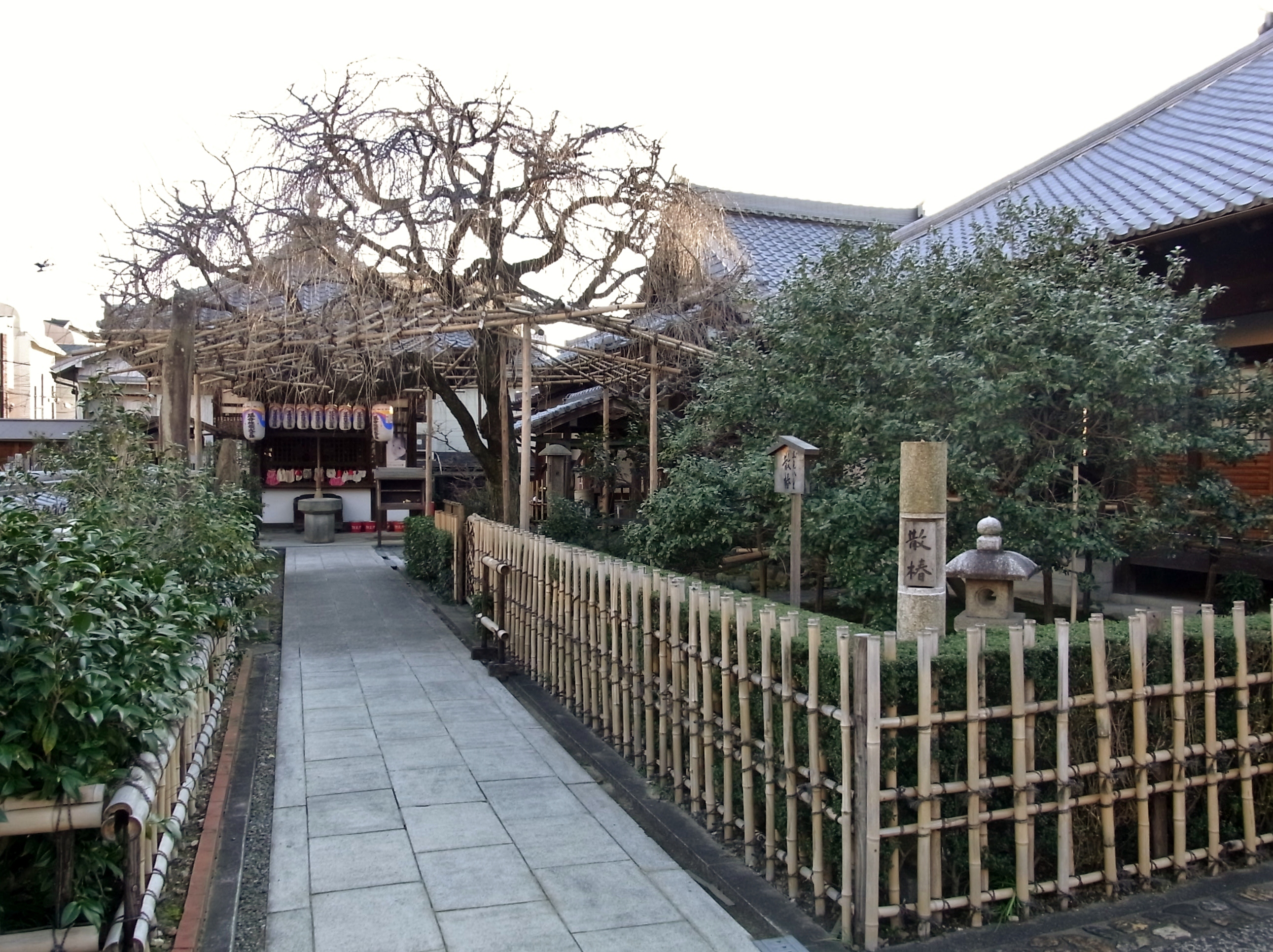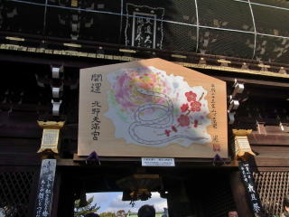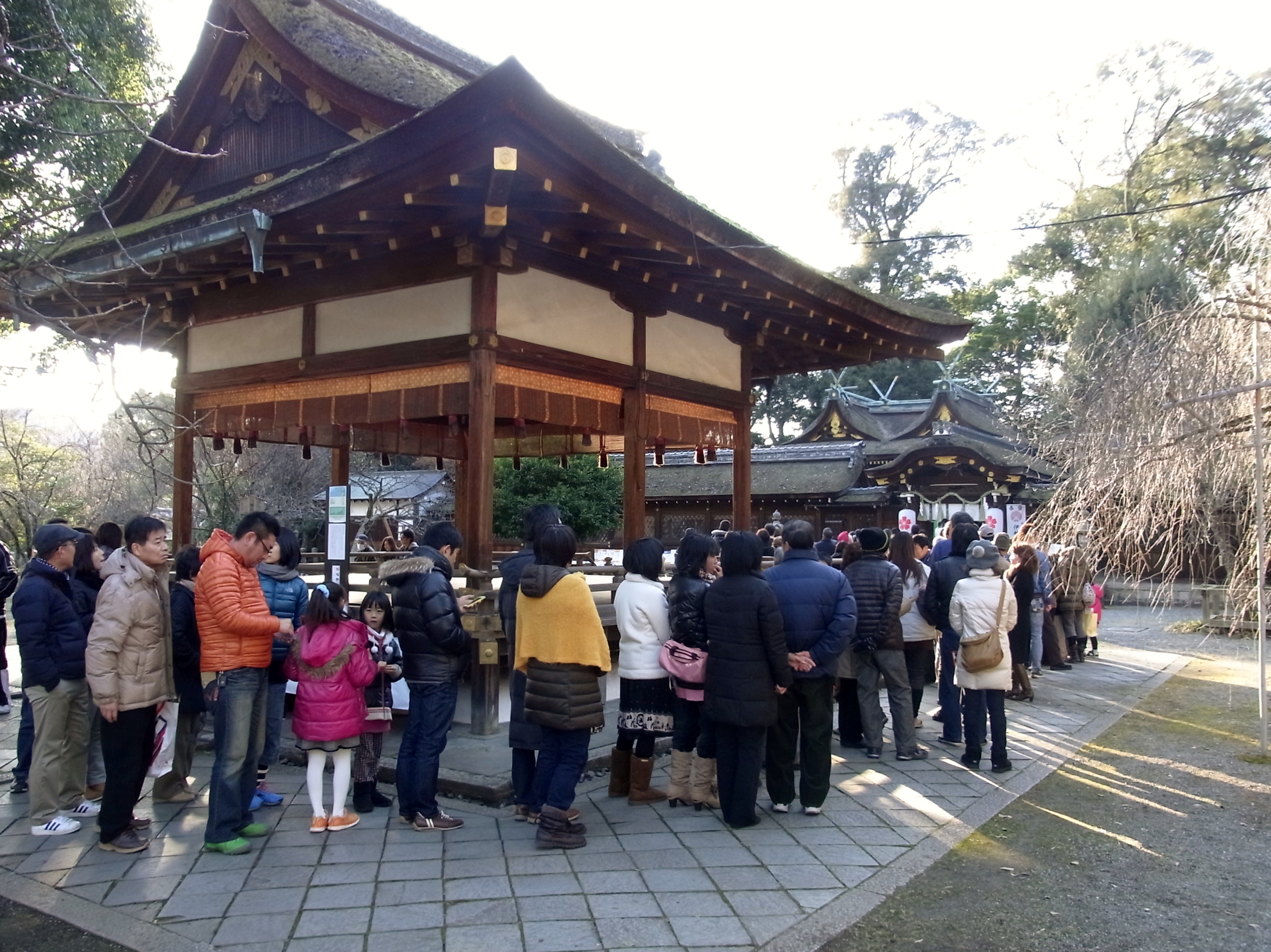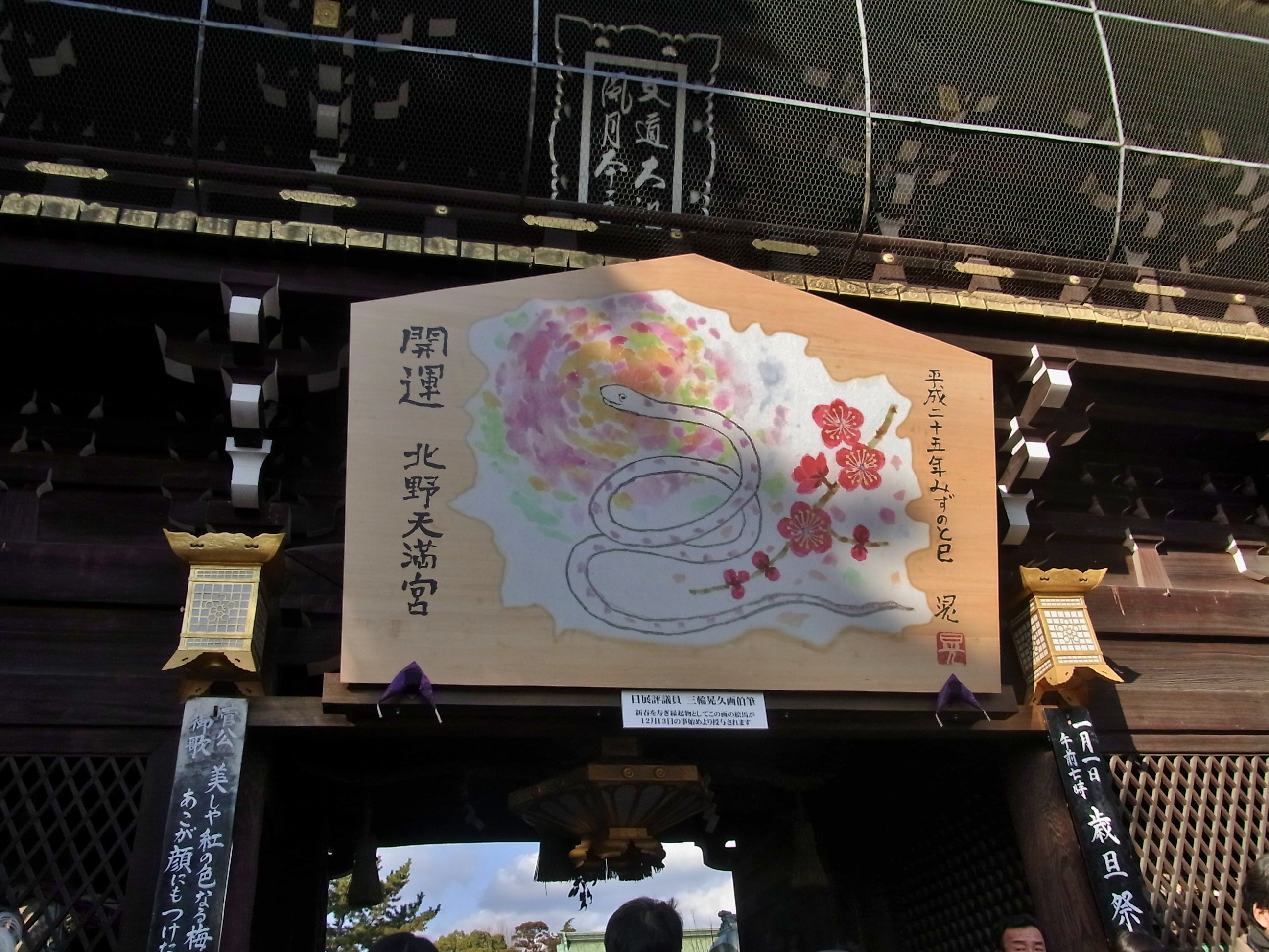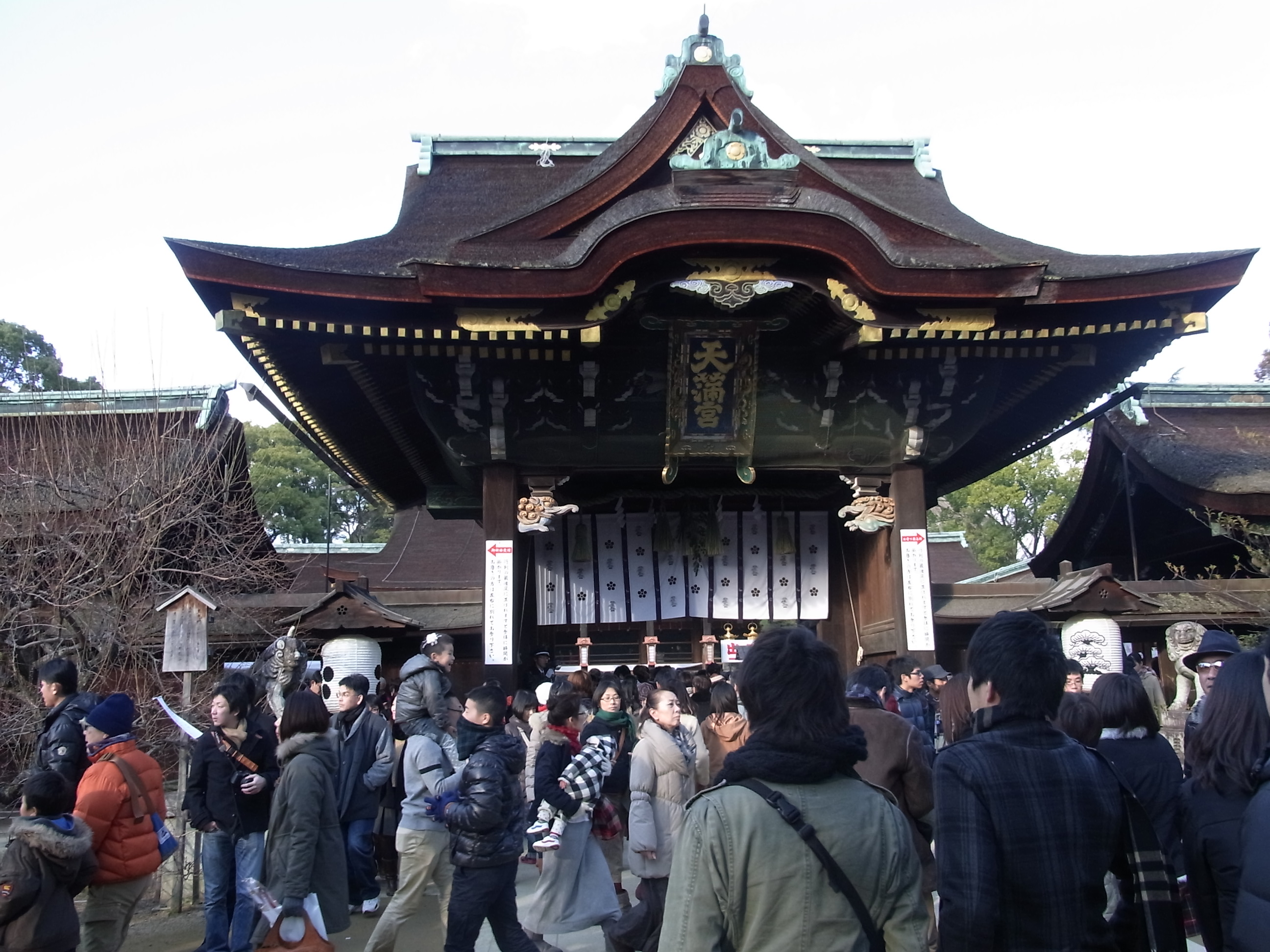 | 一番近い北野天満宮に初詣に来るのは何十年振りでした。参道は物凄い人でなかなか本殿まで 着く事が出来ないので、脇道から行きました。昔は正月三ヶ日でもガラガラだったのですが・・・ |