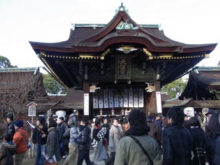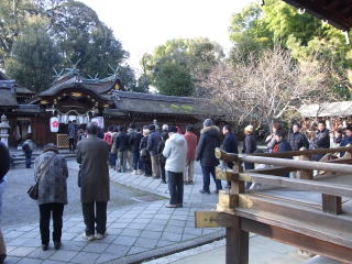 | 何時頃からか参拝するのに行儀よく一列に並ぶようになったんですねぇ〜!皆さん辛抱ずよくて 感心します。並ぶのが苦手な私は、舞殿の賽銭箱に入れてサッサと参ってきました。 ここ平野さんは賽銭箱も小さいので分かる気もします?が、先に行った天神さんは本殿の幅ずっと お賽銭をあげるようになっているのに、中央にだけ並んで長蛇の列をつくっているのは解せません。 |