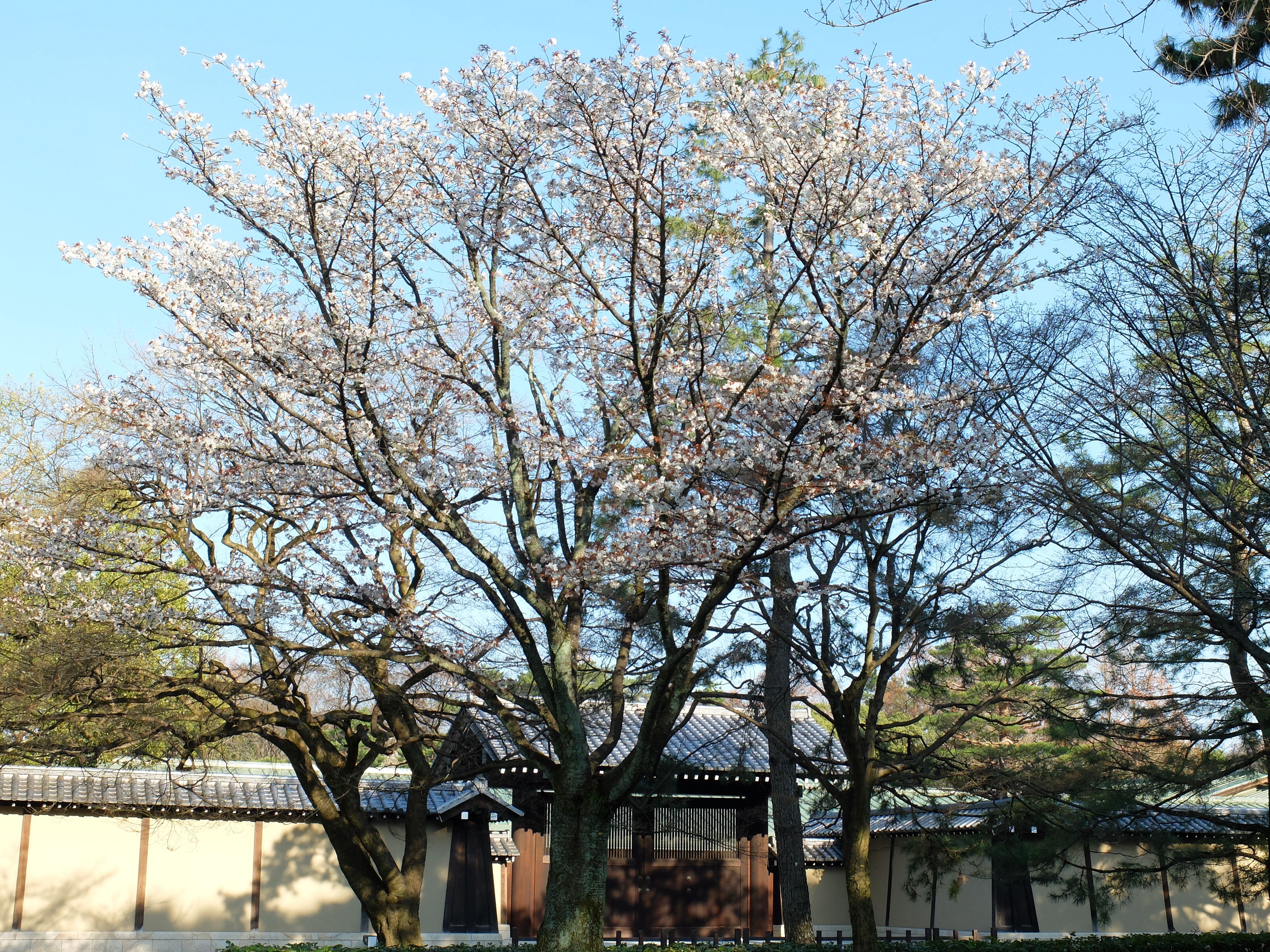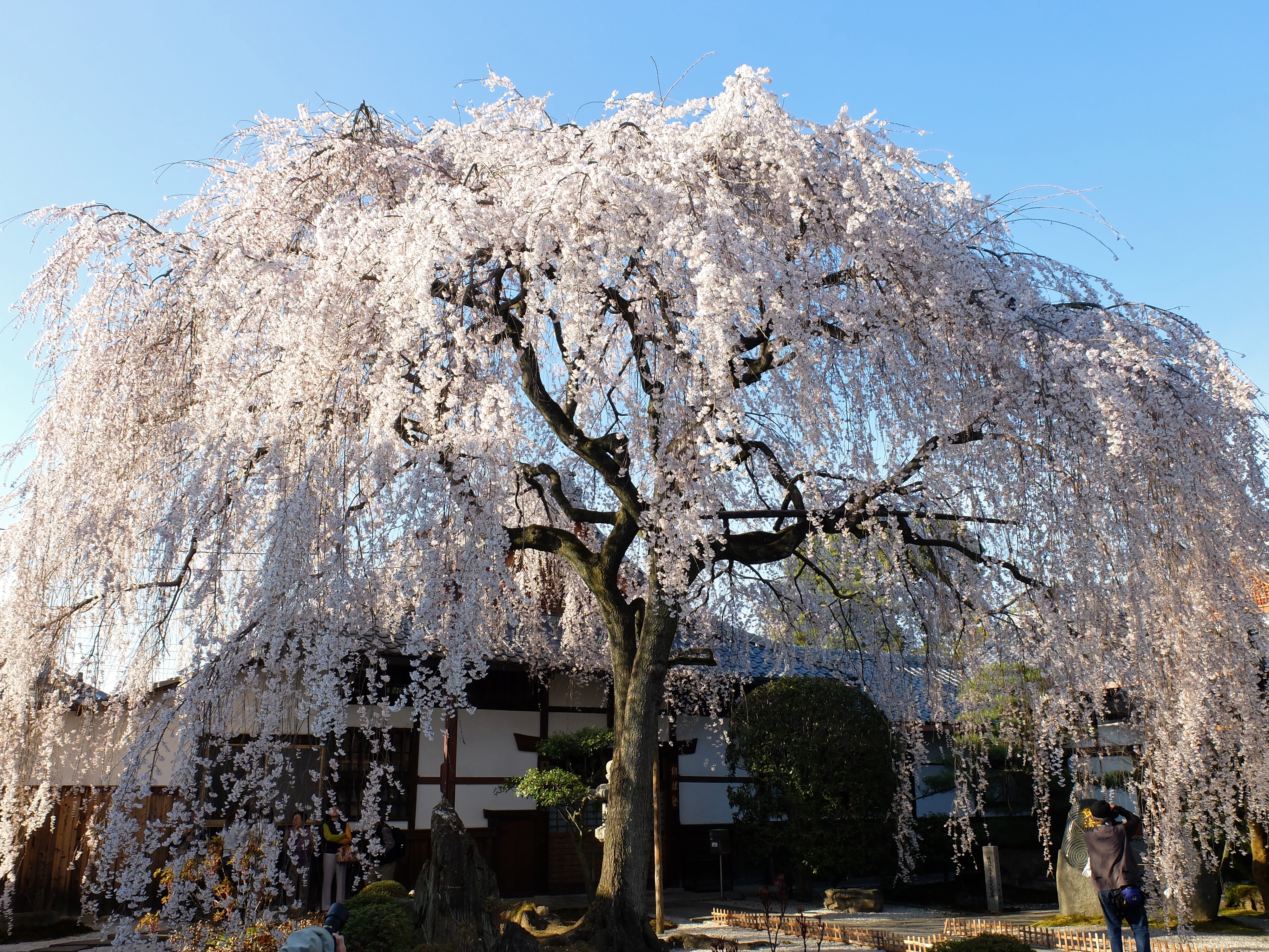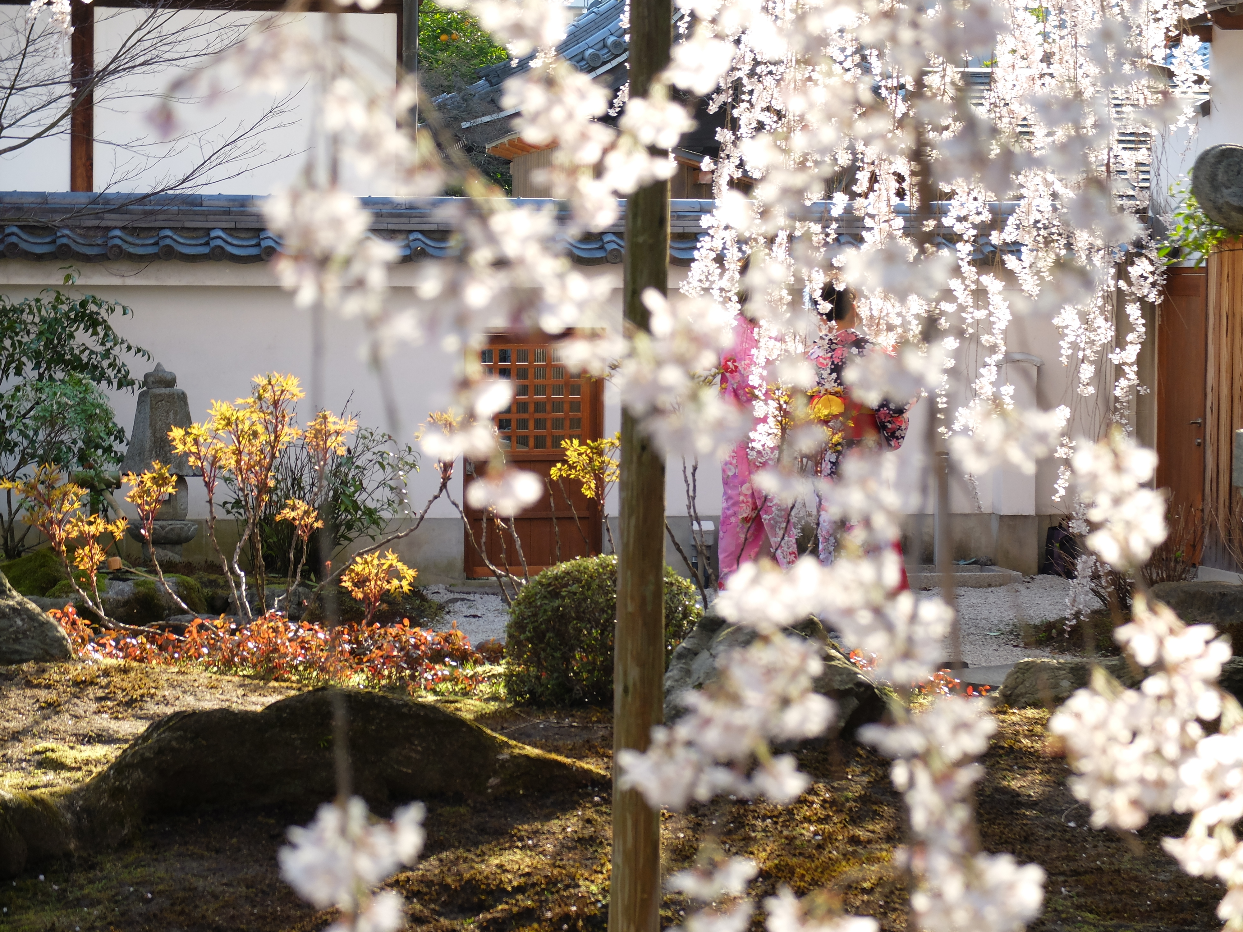 | 本満寺の桜は如何かなと思って行ったら満開で、ラッキーでした。丁度京都の桜を撮る カメラツアーの集団が来ていて、結局人が入らない写真が撮れなかったのが残念です。 此処の着物姿の二人も、中国語を話していました。 |