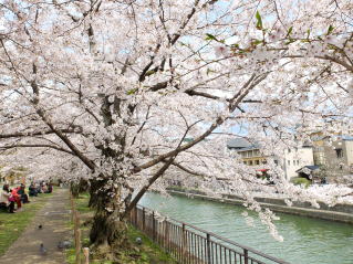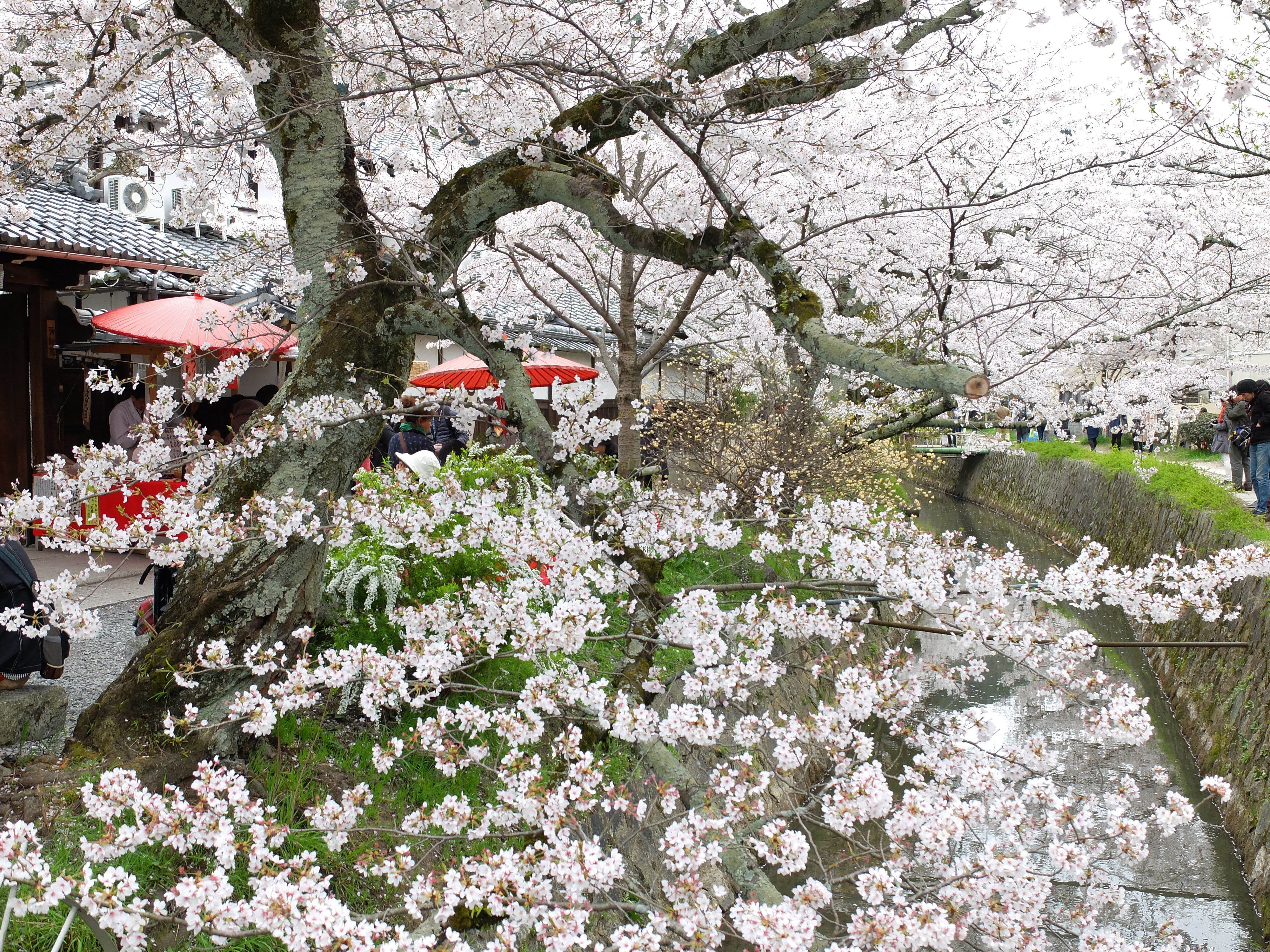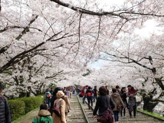 | 南禅寺の水路閣から疎水沿いに歩いてインクラインに出たら、満開の桜と凄い人が現れました。 |