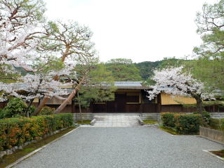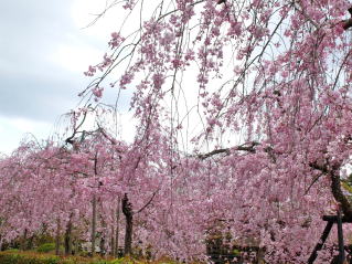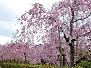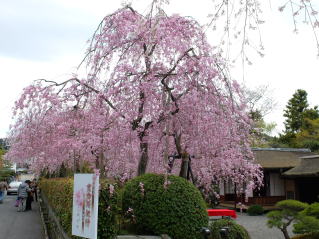 | 清流亭の紅枝垂れは満開で、高価な着物を着た上得意のお客がたくさん中に入っていきました。 向かいの野村碧雲荘はひっそりとした玄関の桜を遠望して、あの噂の庭園を想像するだけでした。 |