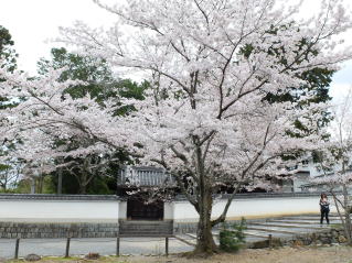 | 2年振りに修理が終わった山門の桜が見られましたが、山門の前には竹垣で囲いがしてありました 。 何時もこの場所で、近所の若いお母さんと幼い子供達が楽しそうに花見の宴をしていたのです が・・・・ 去年は大河ドラマ「八重の桜」で人がたくさんいた会津墓地もひっそりとしていました。 |