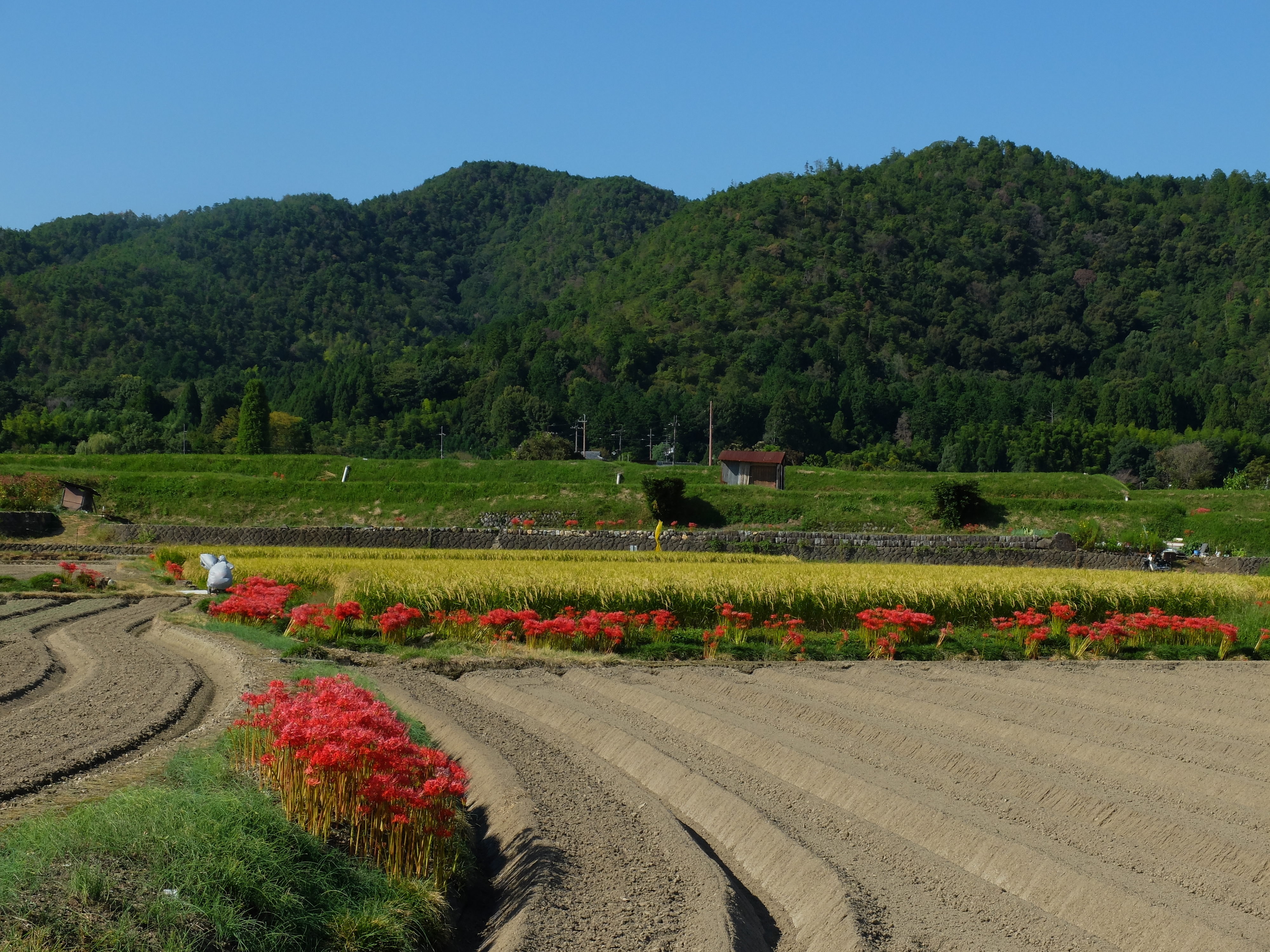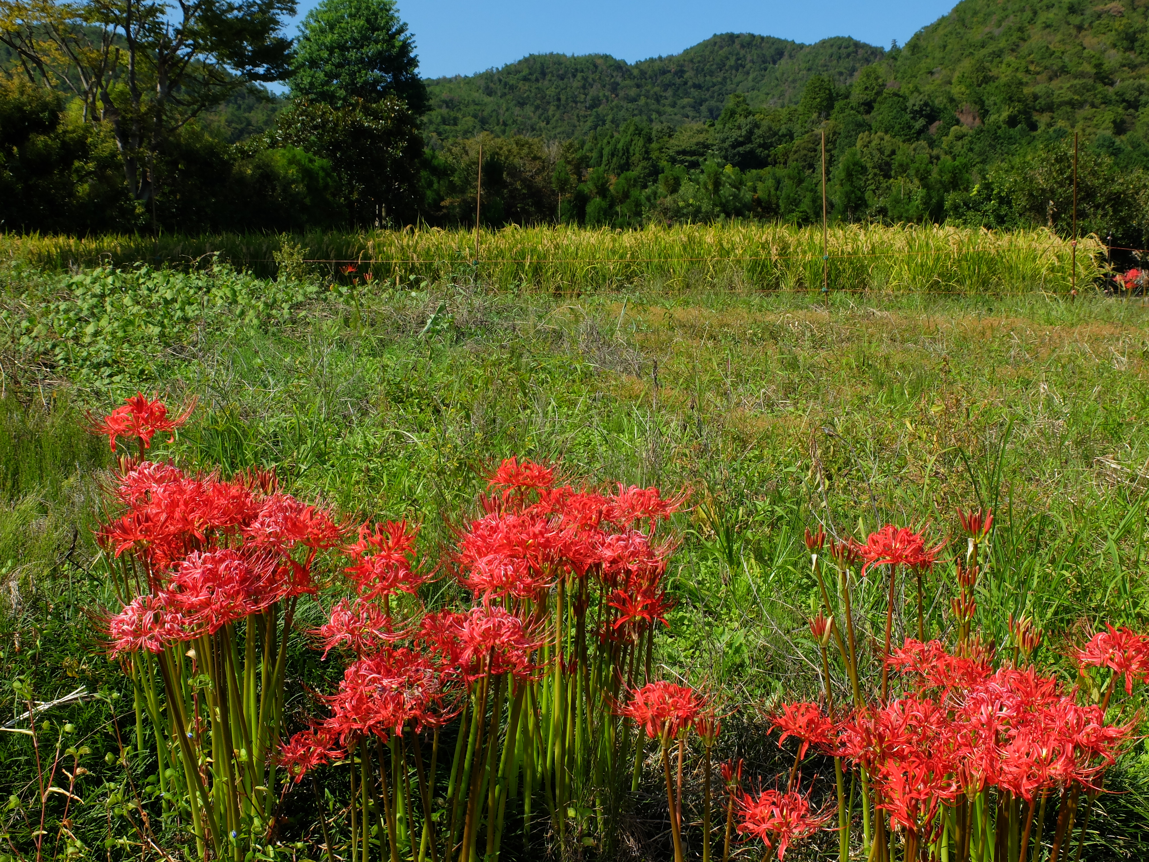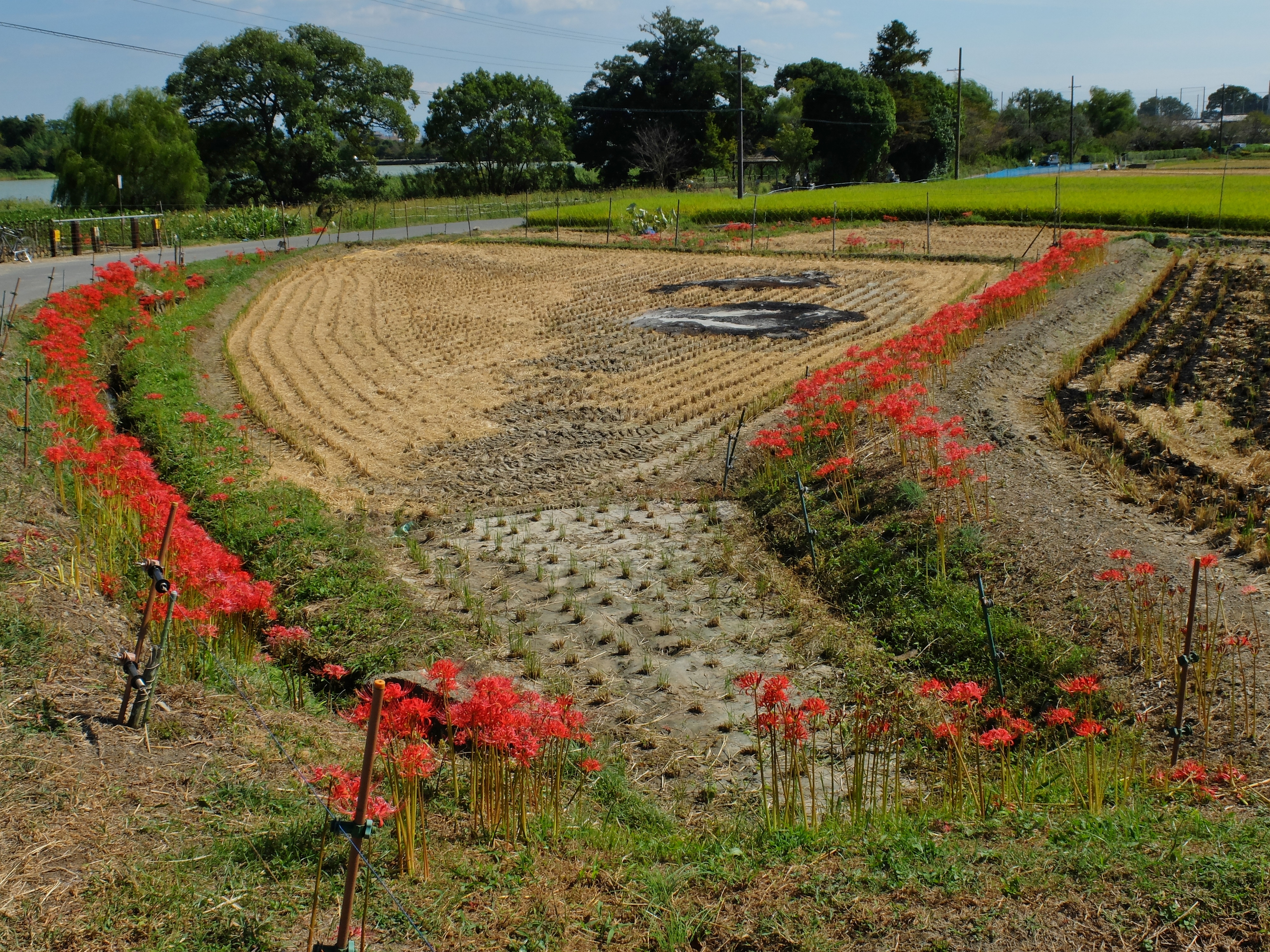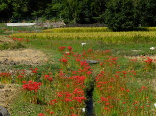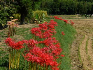 | 長閑な田園の中、本来の畦道に彼岸花の風景が見られます。 |
