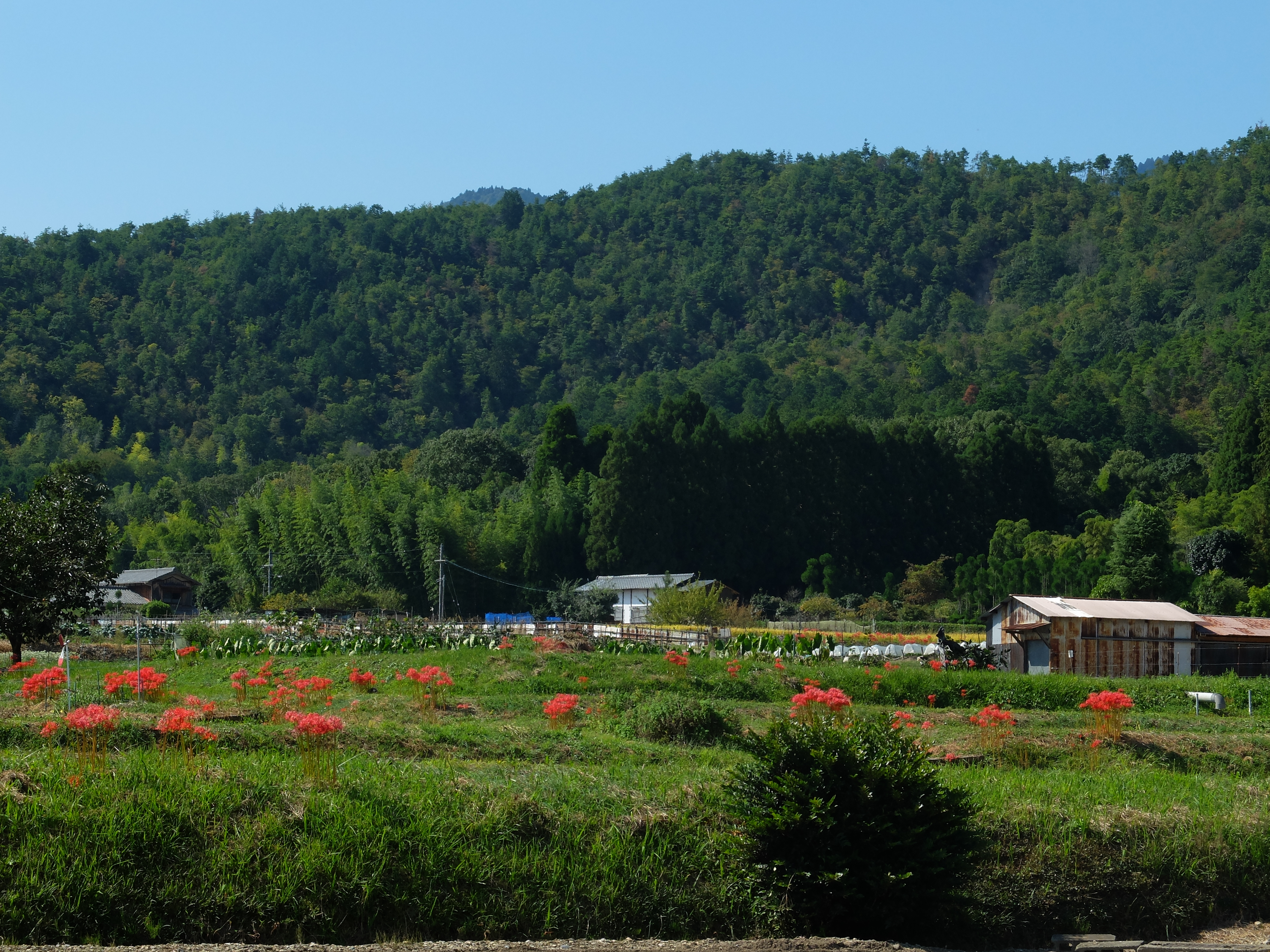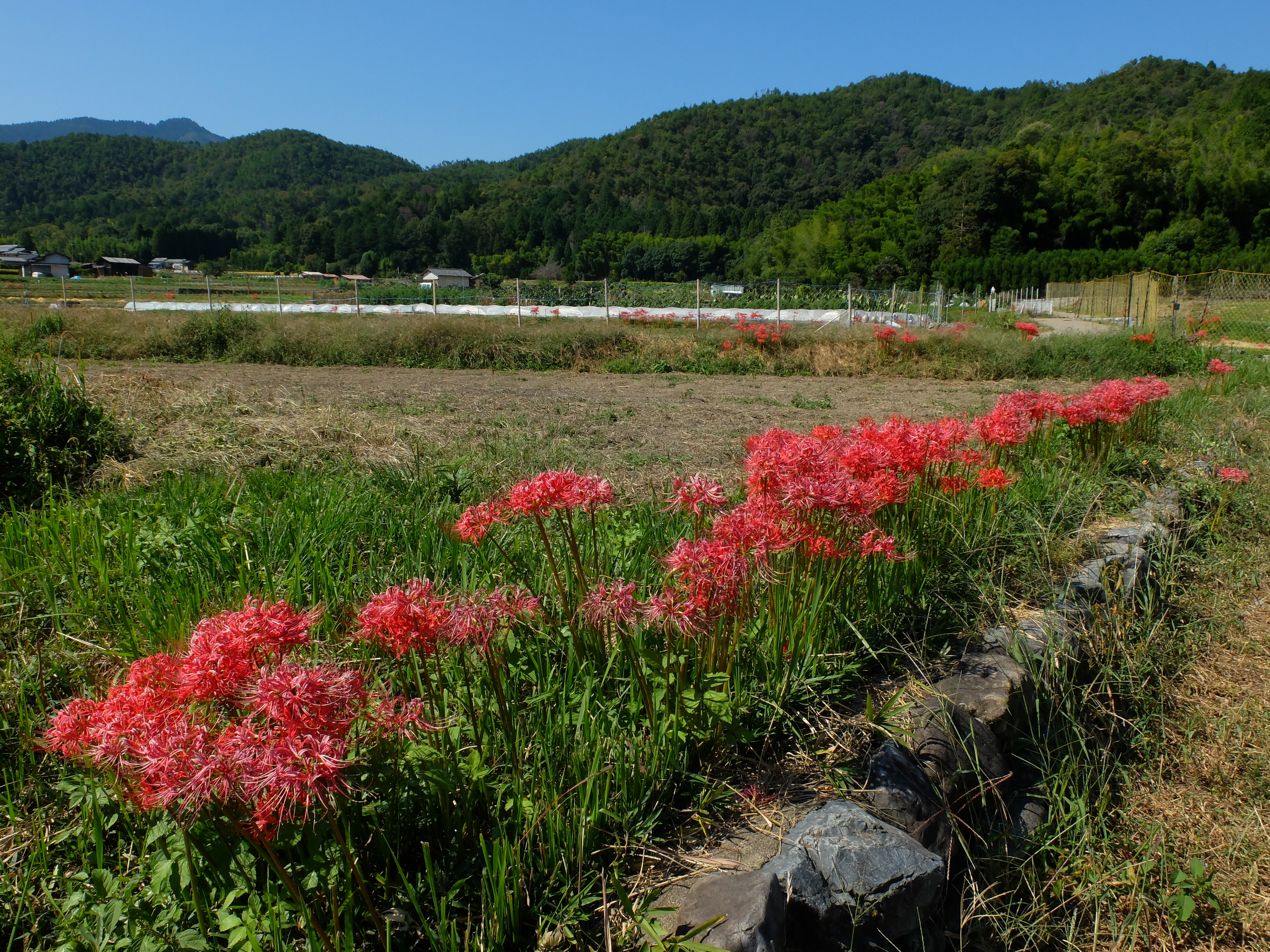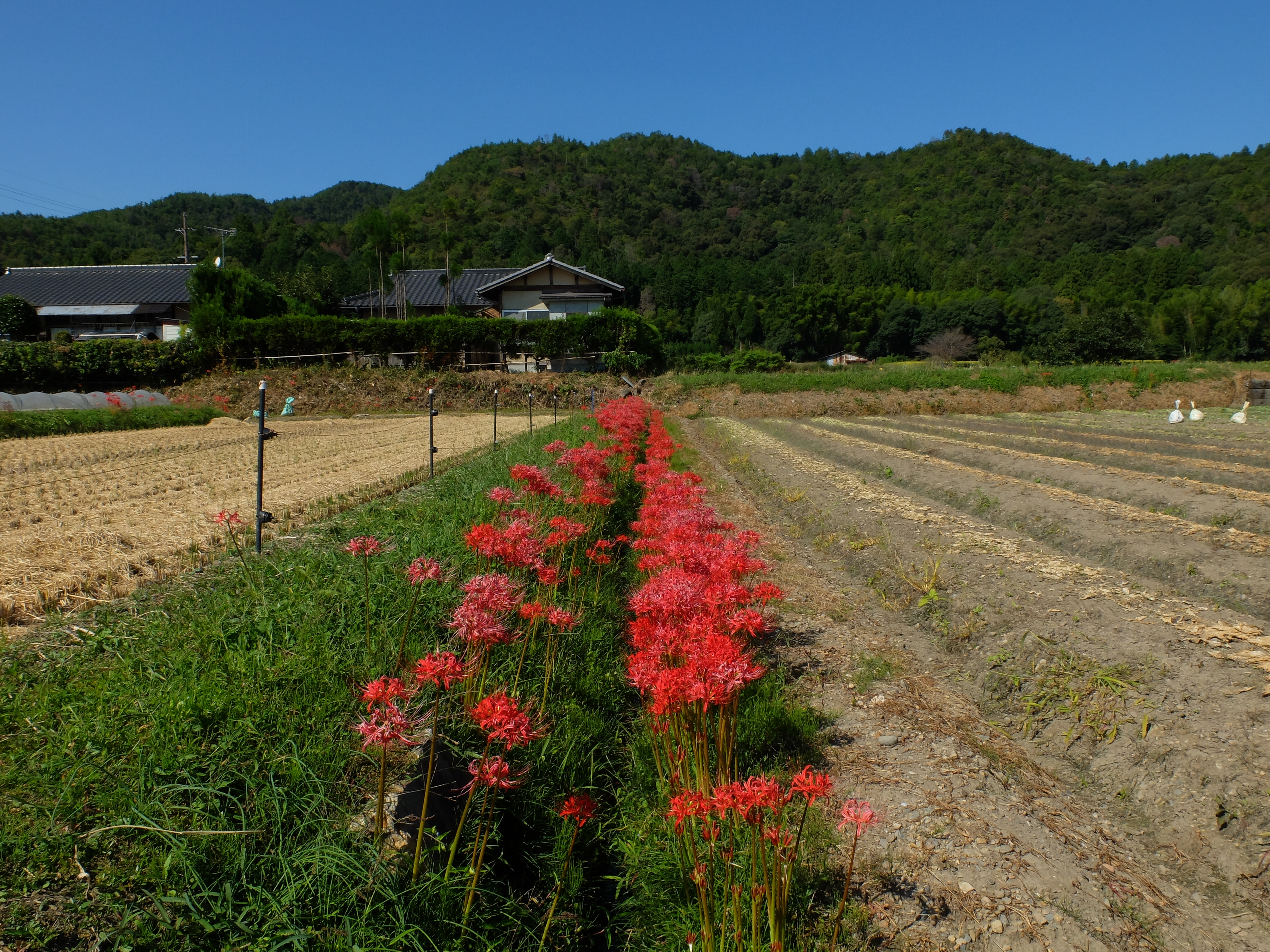 | 長閑な田園の中、本来の畦道に彼岸花の風景が見られます。 |