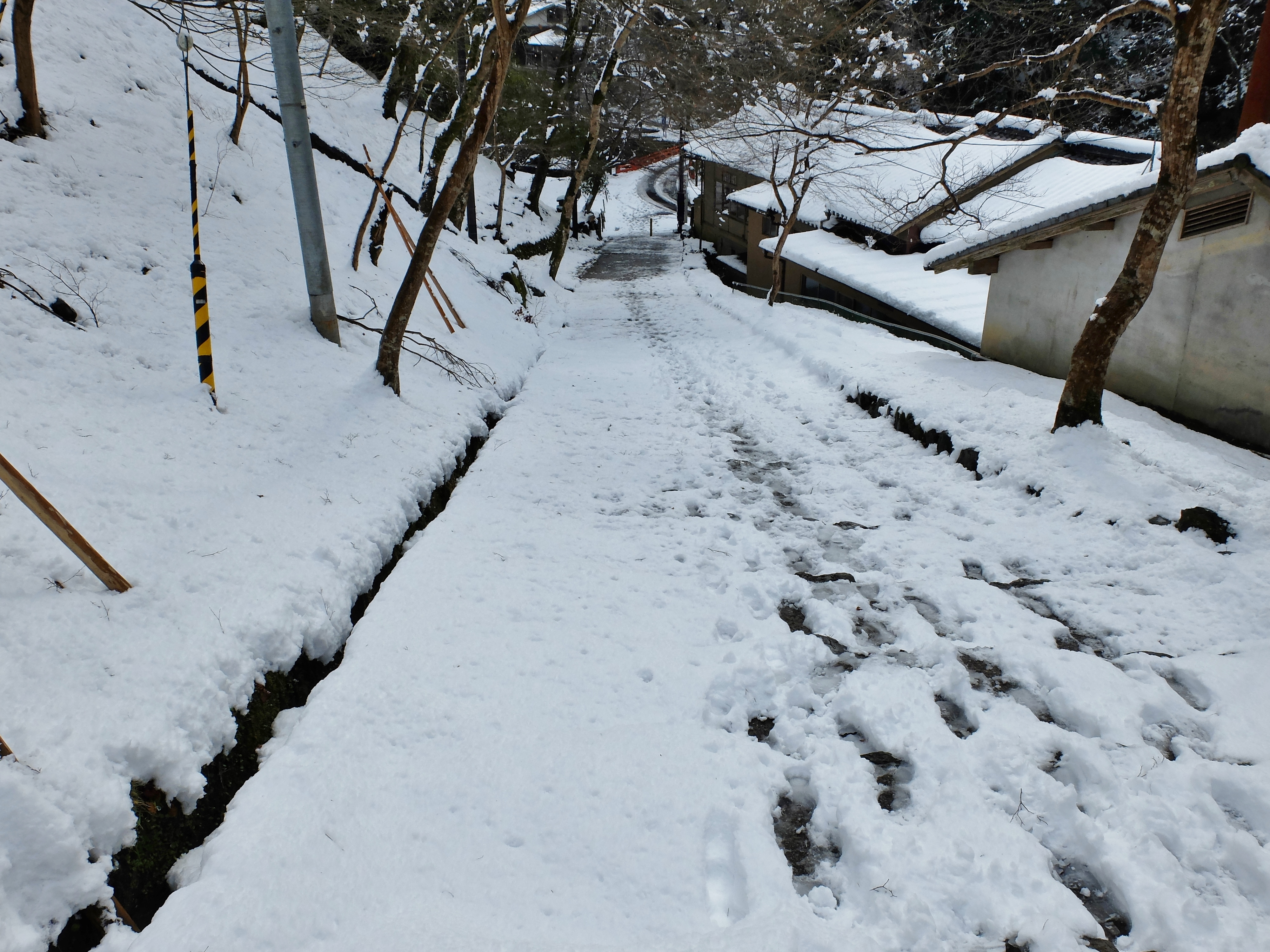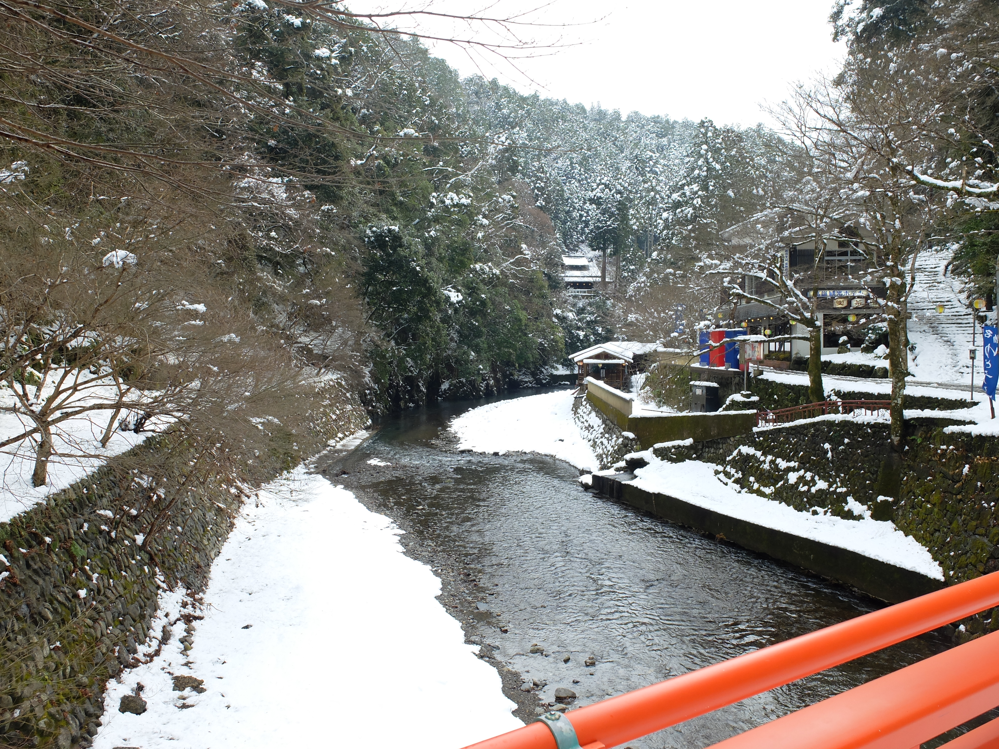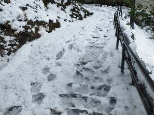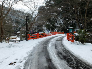 | バス停から参道登り口の清滝川までの下りは、石段も見えない程積もっていて、滑べらないよう 新雪に靴を突っ込んで、恐る恐る降りて行きました。 |