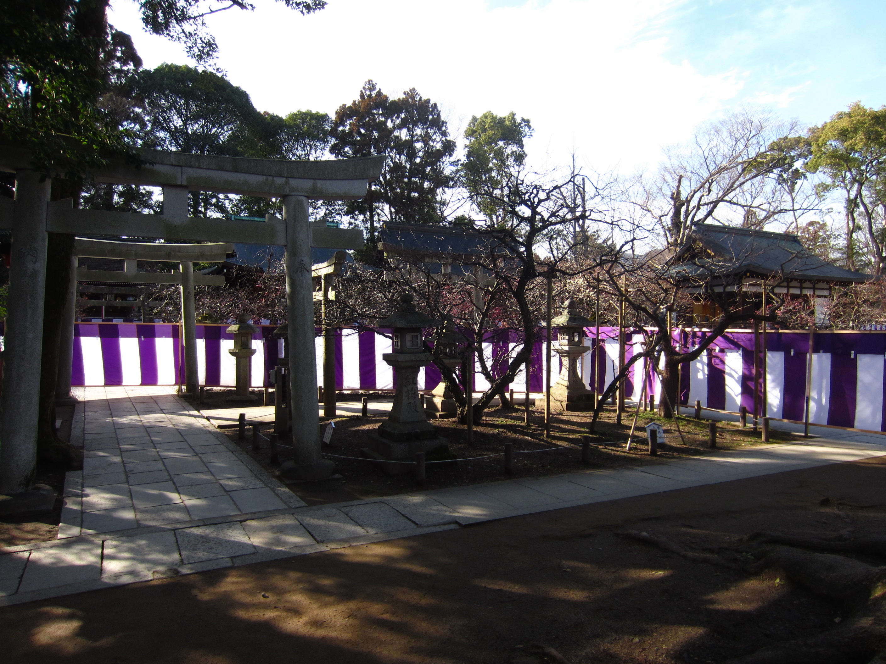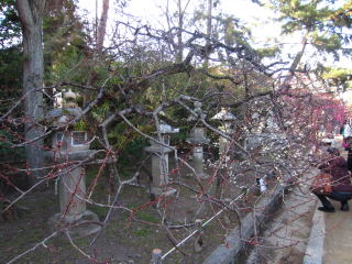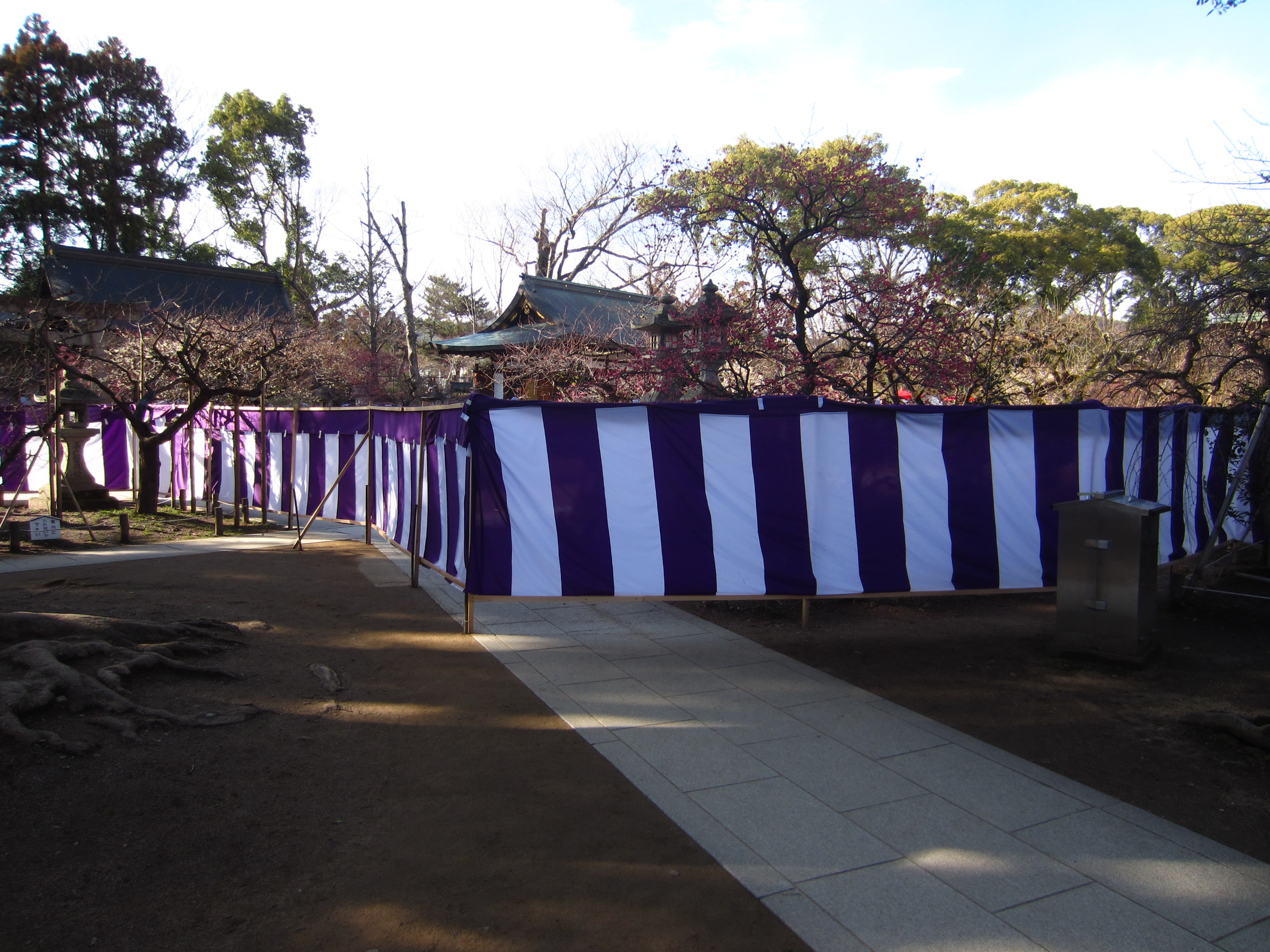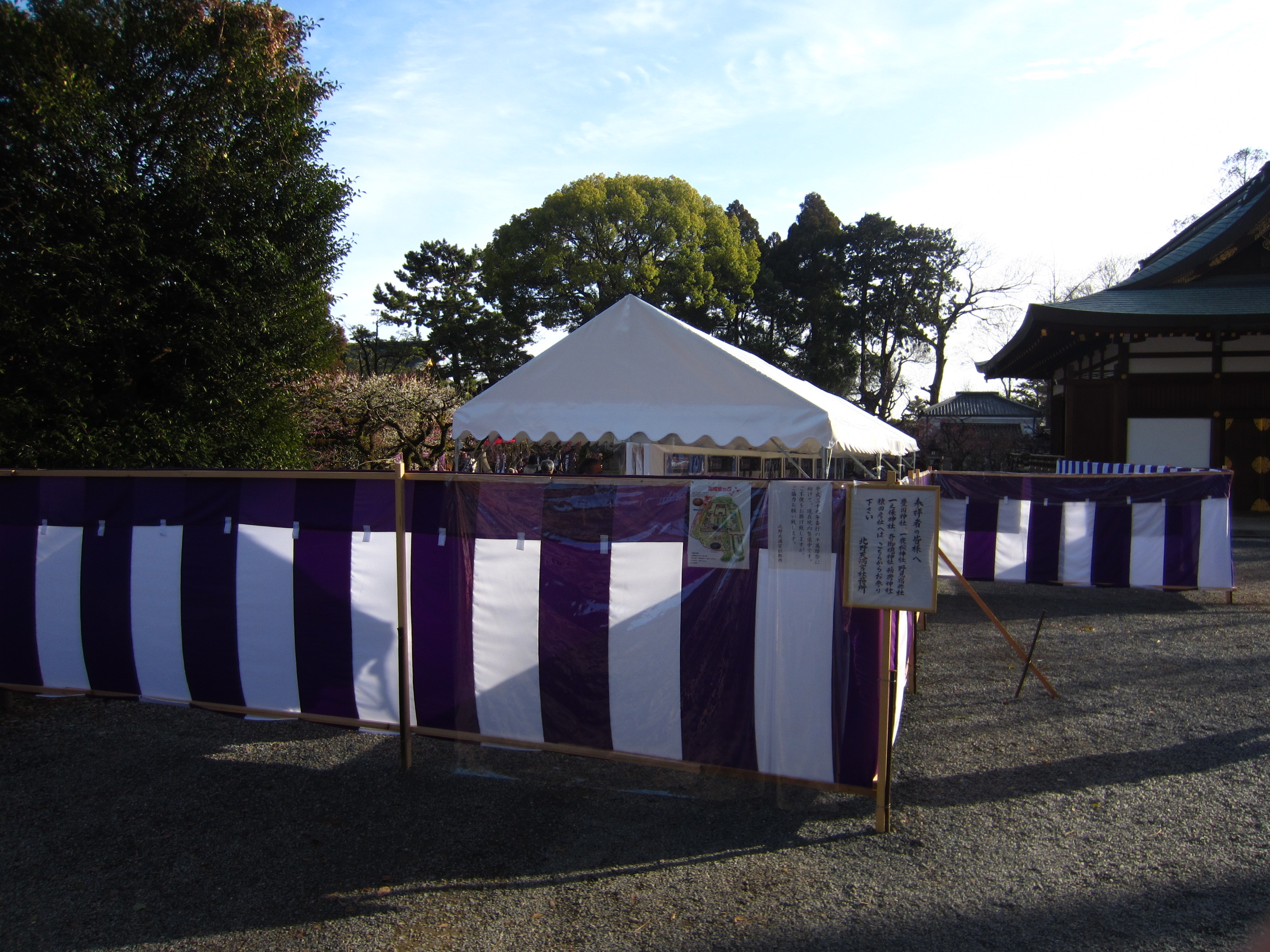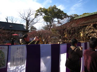 | 今まで自由に境内の梅を楽しめた北野の天神さんは、今年からこんな風になってしまいました。 毎年、梅花祭当日の1日だけ幕を張って規制していたのが、今年から有料の梅林に入らなけ れば見られないようになりました。 自由に見られる梅の数も大分減りました。 (写真をクリックすれば拡大されます) |