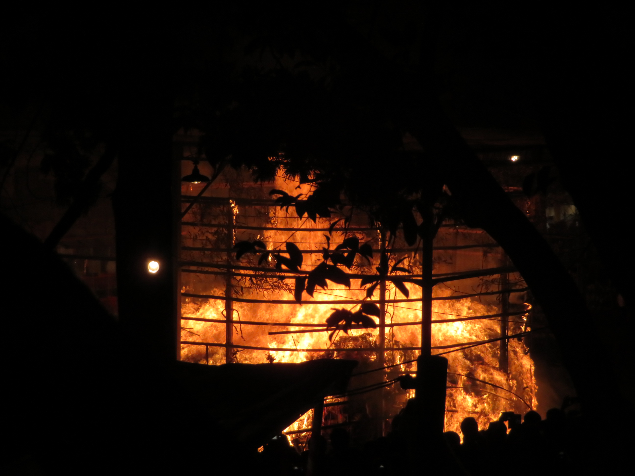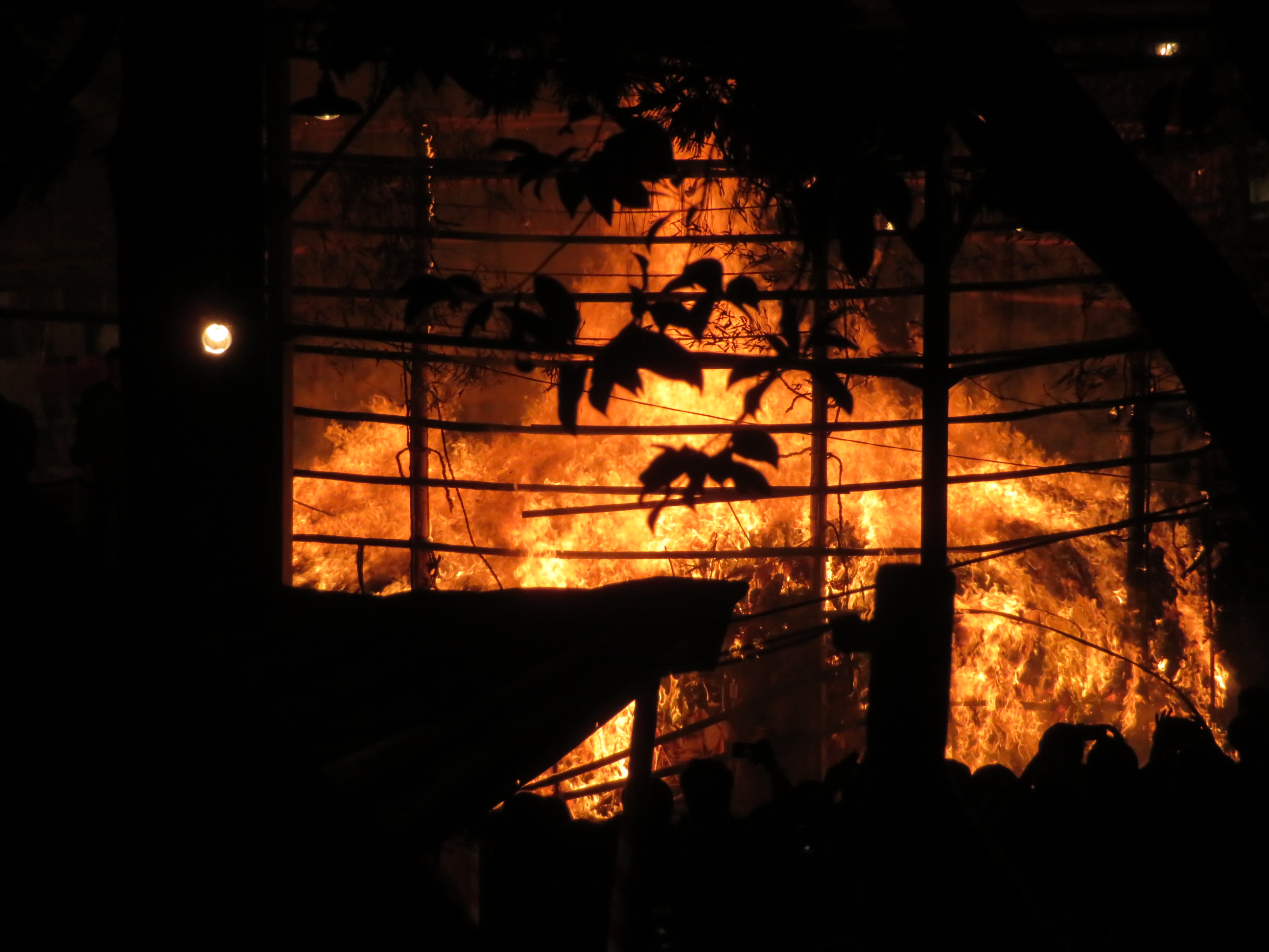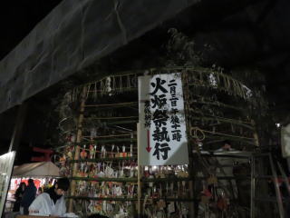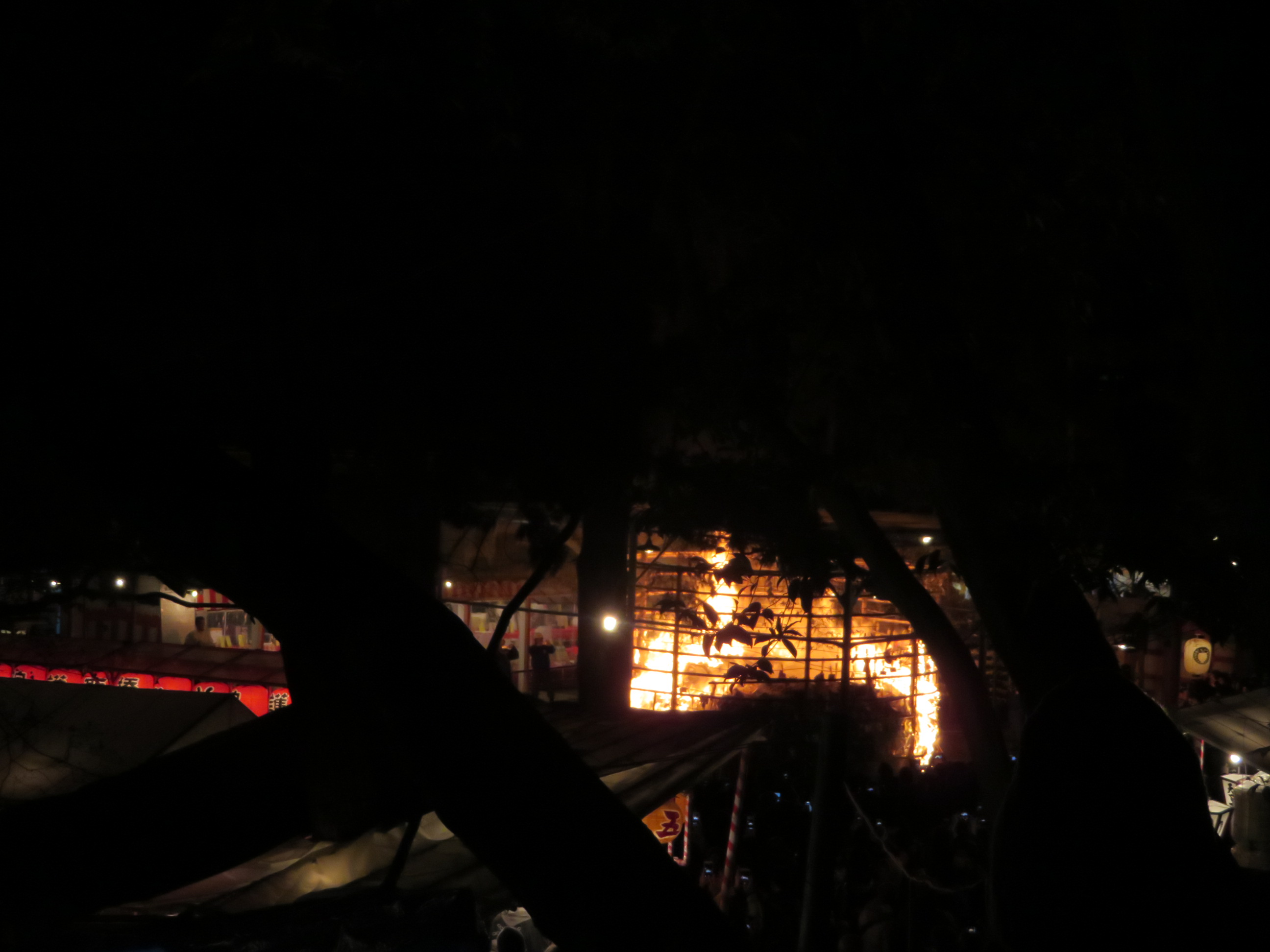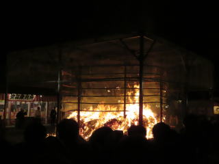 | 前に見た時は、炎がごぉうごぉうと天高く燃え上がり迫力が凄かったのですが、今年は 小貧で残念でした。来年は元通りの迫力ある火炉祭が見られることを願っています。 |