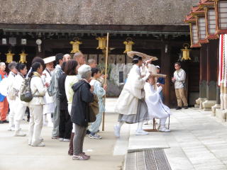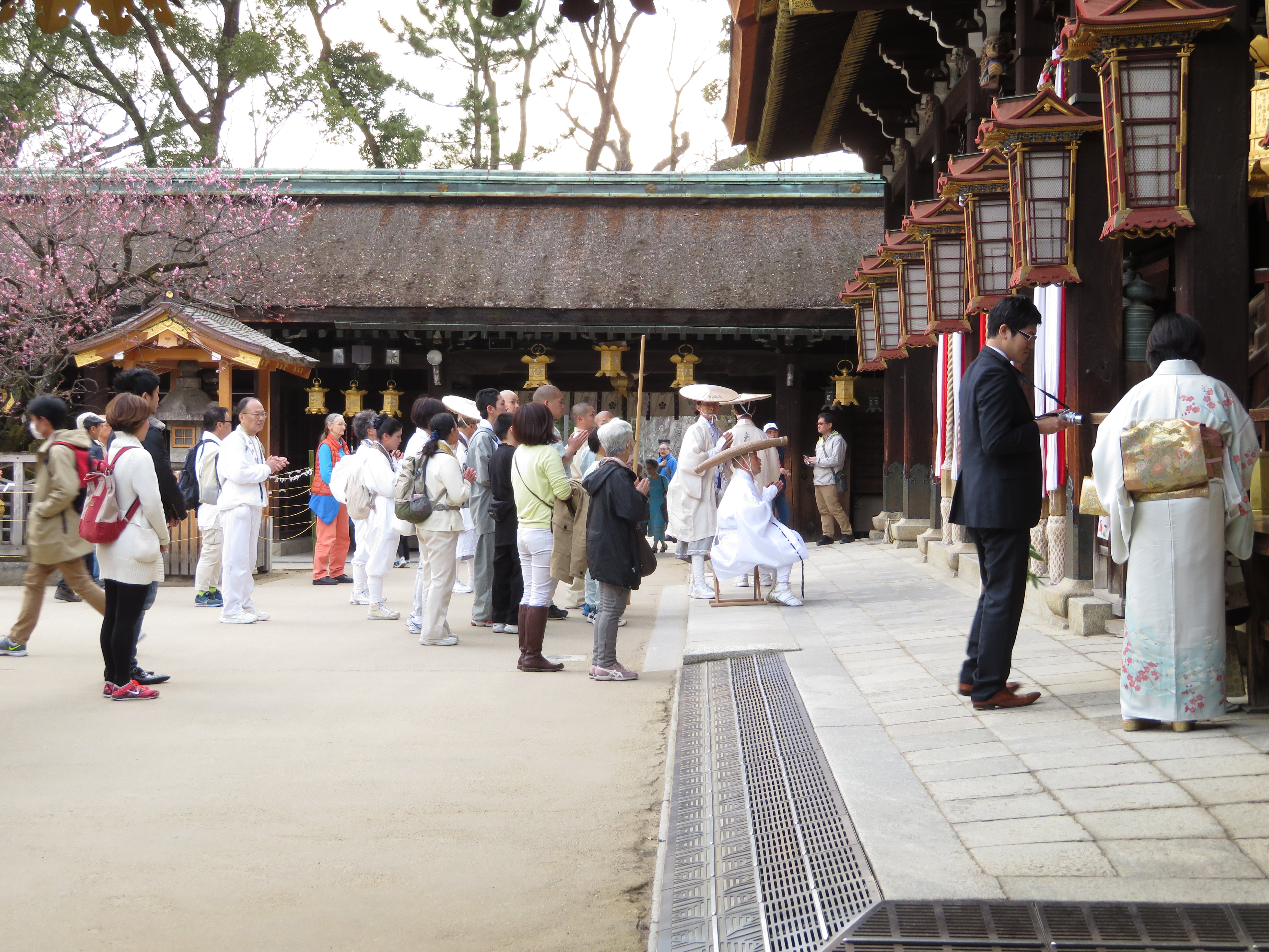 | 天神さんで突然この光景に遭遇して、思わずカメラを向けてしまいました。すぐに気が付いて カメラをしまい神妙に脇に退きました。去年から比叡山千日回峰市中大廻が今年始まるとは 聞いていましたが、まさか早々に出くわすとは思ってなかったので吃驚しました。 戦後13人目の阿闍梨さんのお名前は釜堀浩元師とおっしゃいます。 わたしは今回で7人目の市中大廻りの行者さんに会いましたが、皆身体の周りがオーラみた いなものに包まれていて、近づき難く感じます。 |