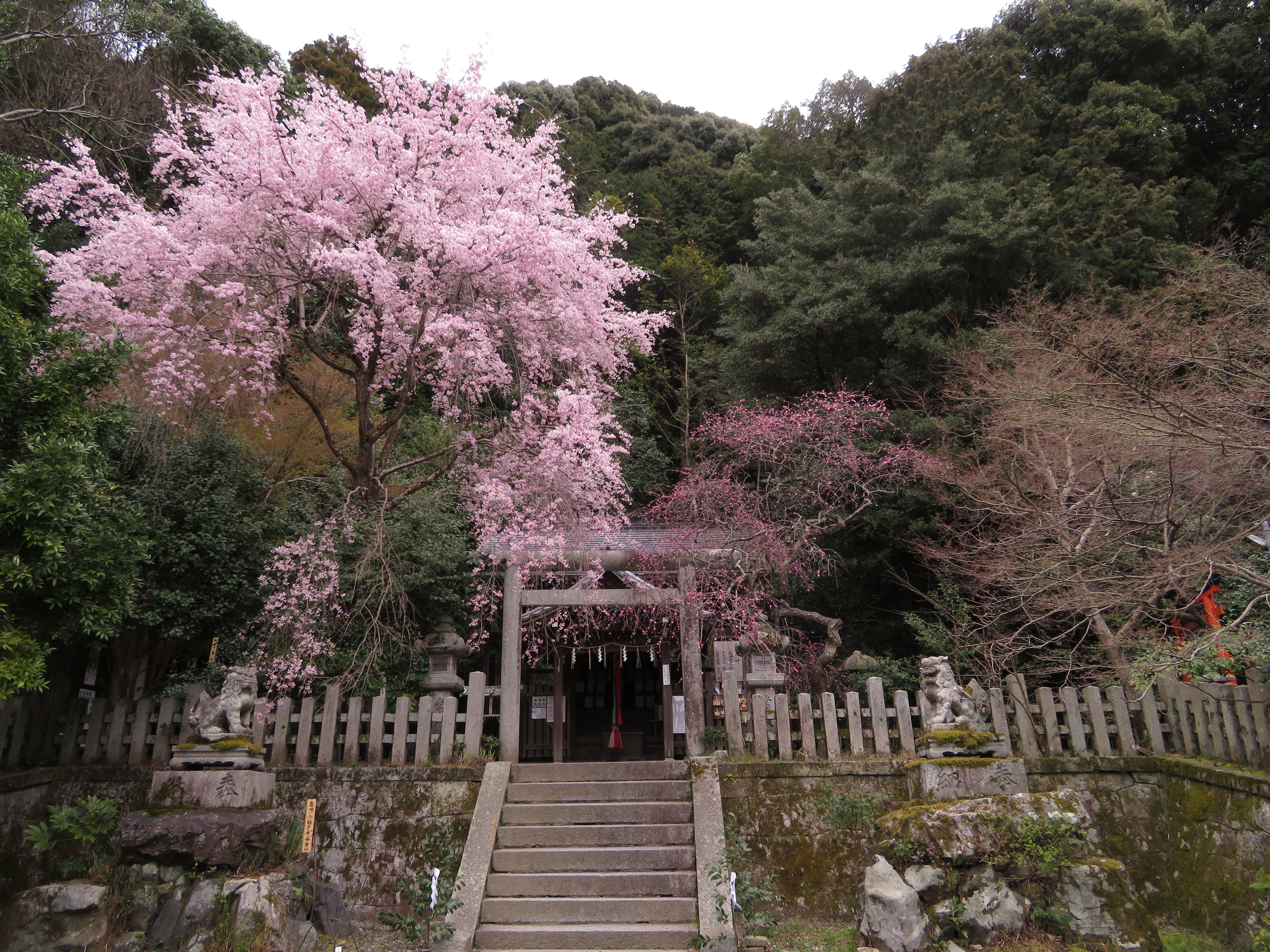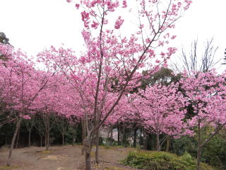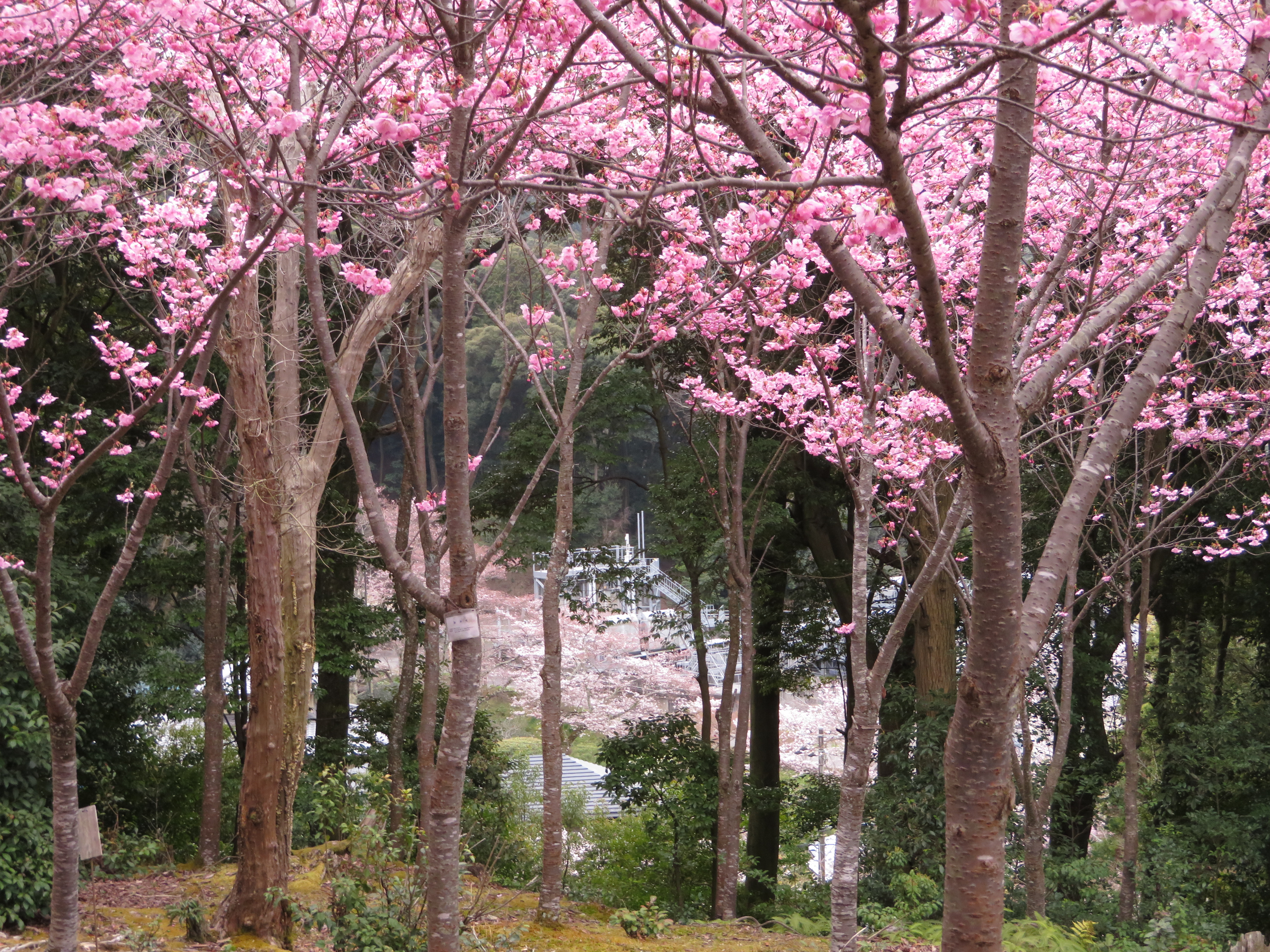 | 本殿裏山桜花苑の早咲きの陽光桜は満開なのに、下の喧騒が嘘のようです。 |