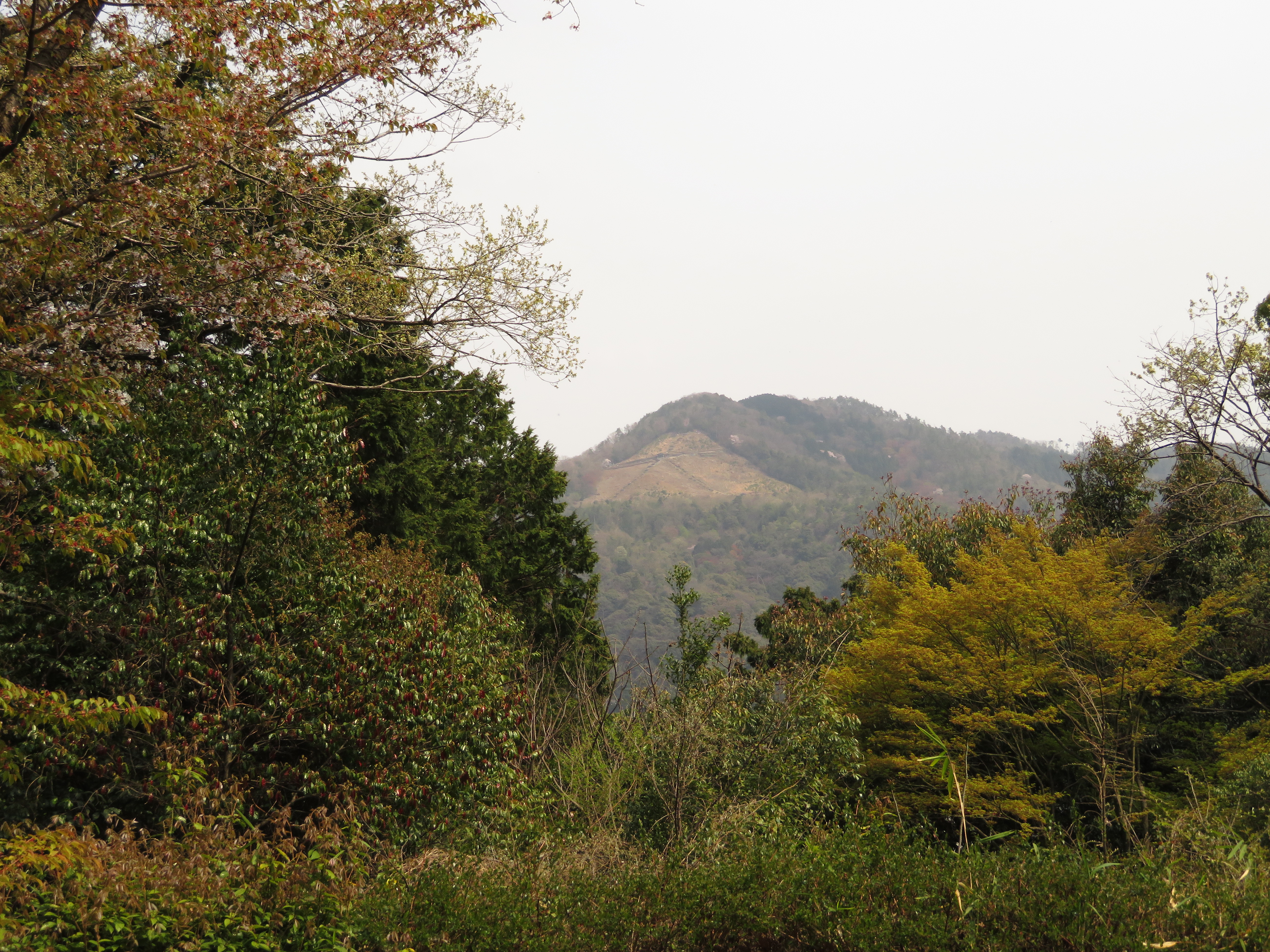 | 山桜越しに見る大文字は素敵なのですが、今年は残念でした。此処で初めて 人と遭遇しました。しかも外国人一家で楽しそうに昼飯を食べてました。 |