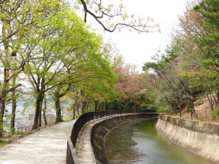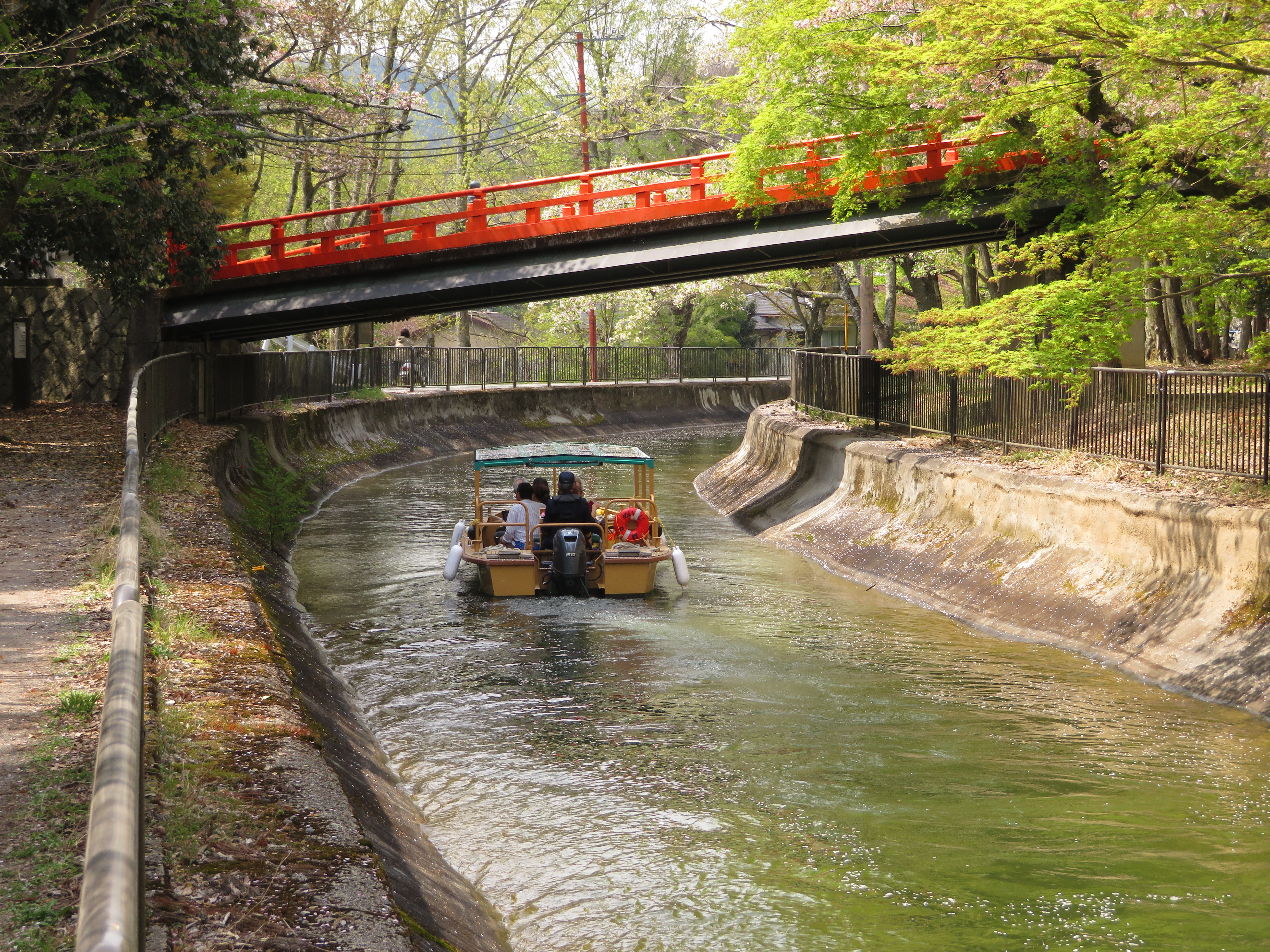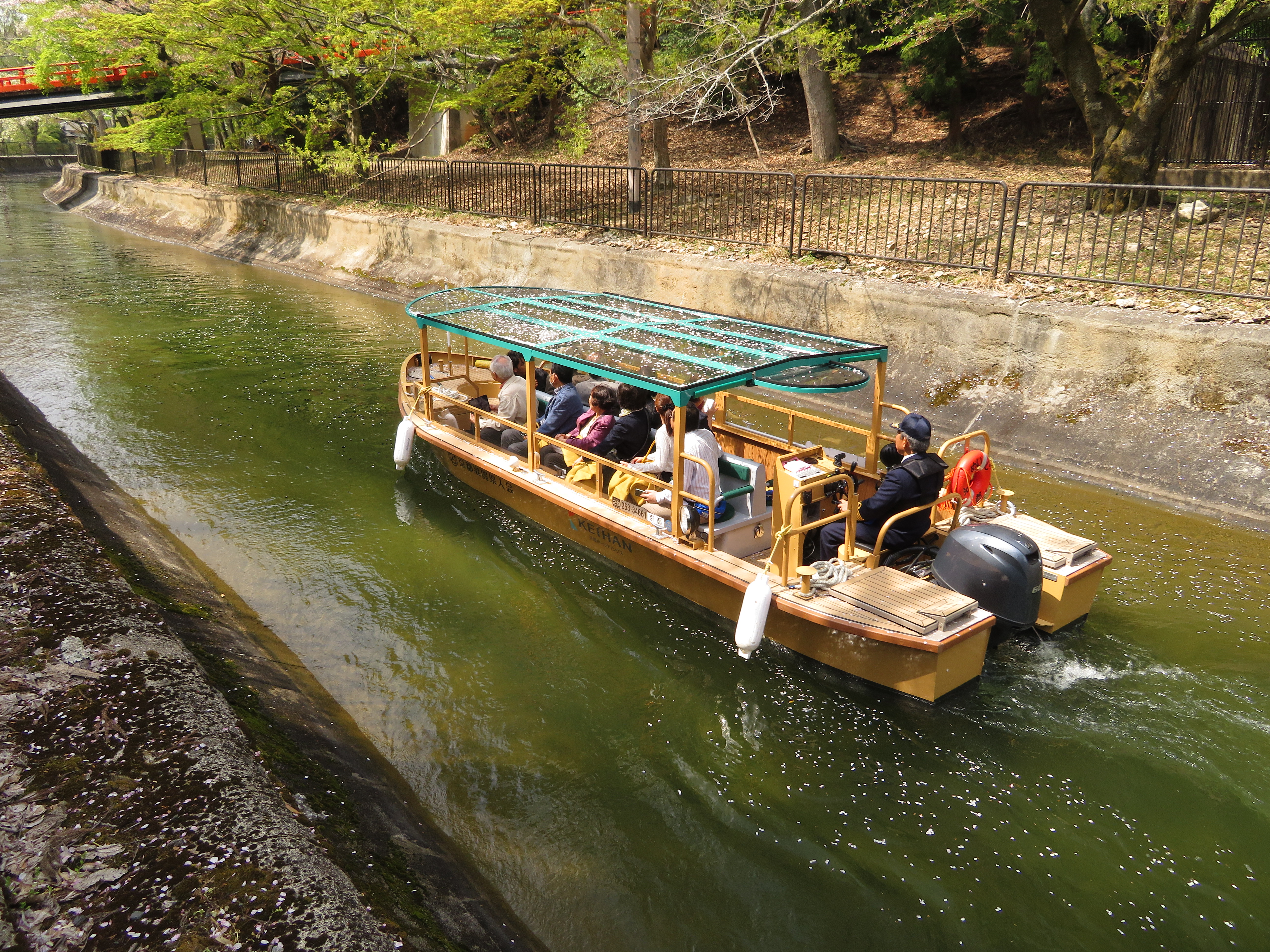 | 後ろから観光案内の声が聞こえて振り返ると、疎水に船が走っているので 吃驚しました。すぐにニュースに出ていた64年振りのびわ湖疏水船だと気付 いたのですが、早速遭遇してラッキーでした。 |