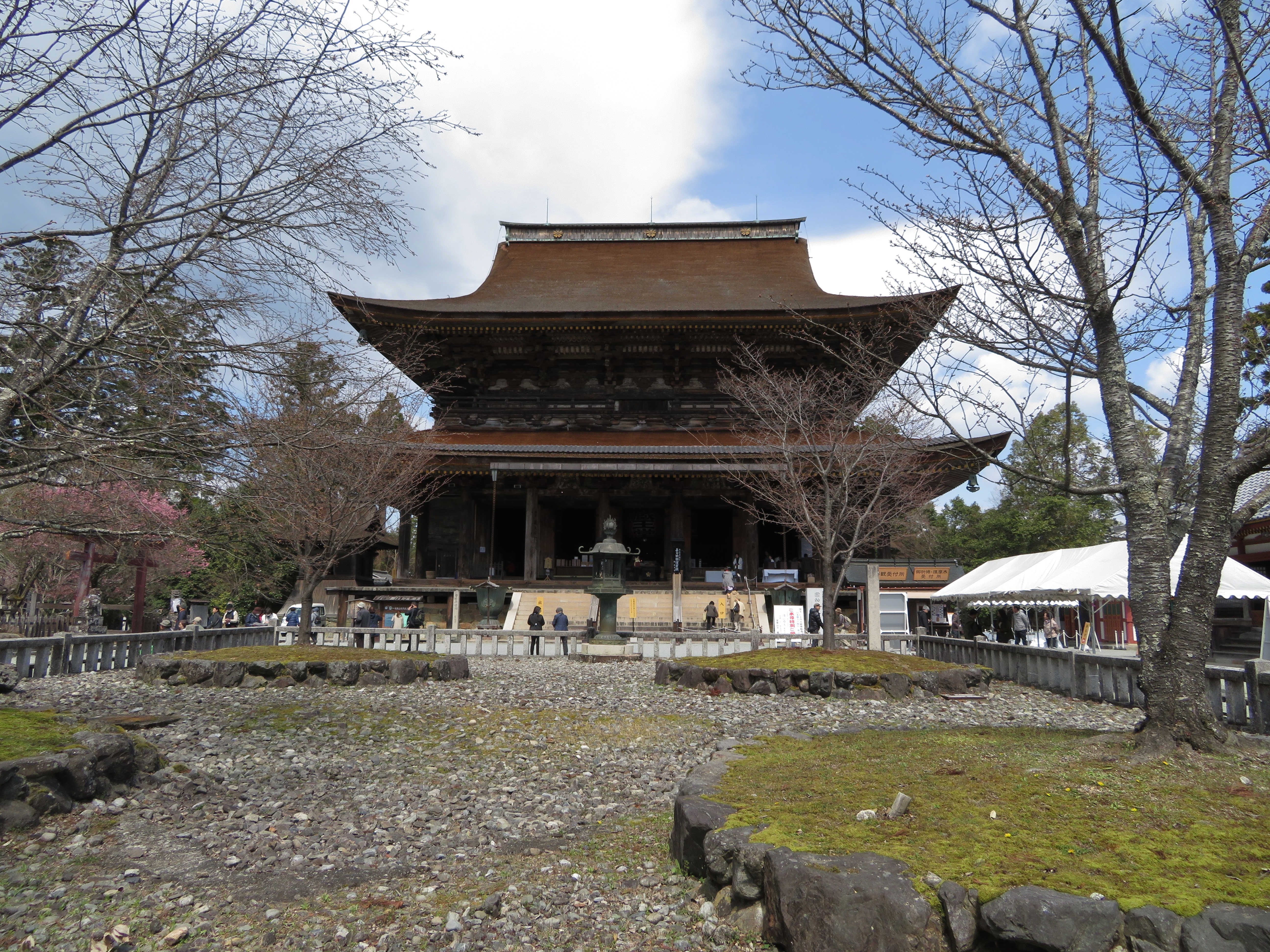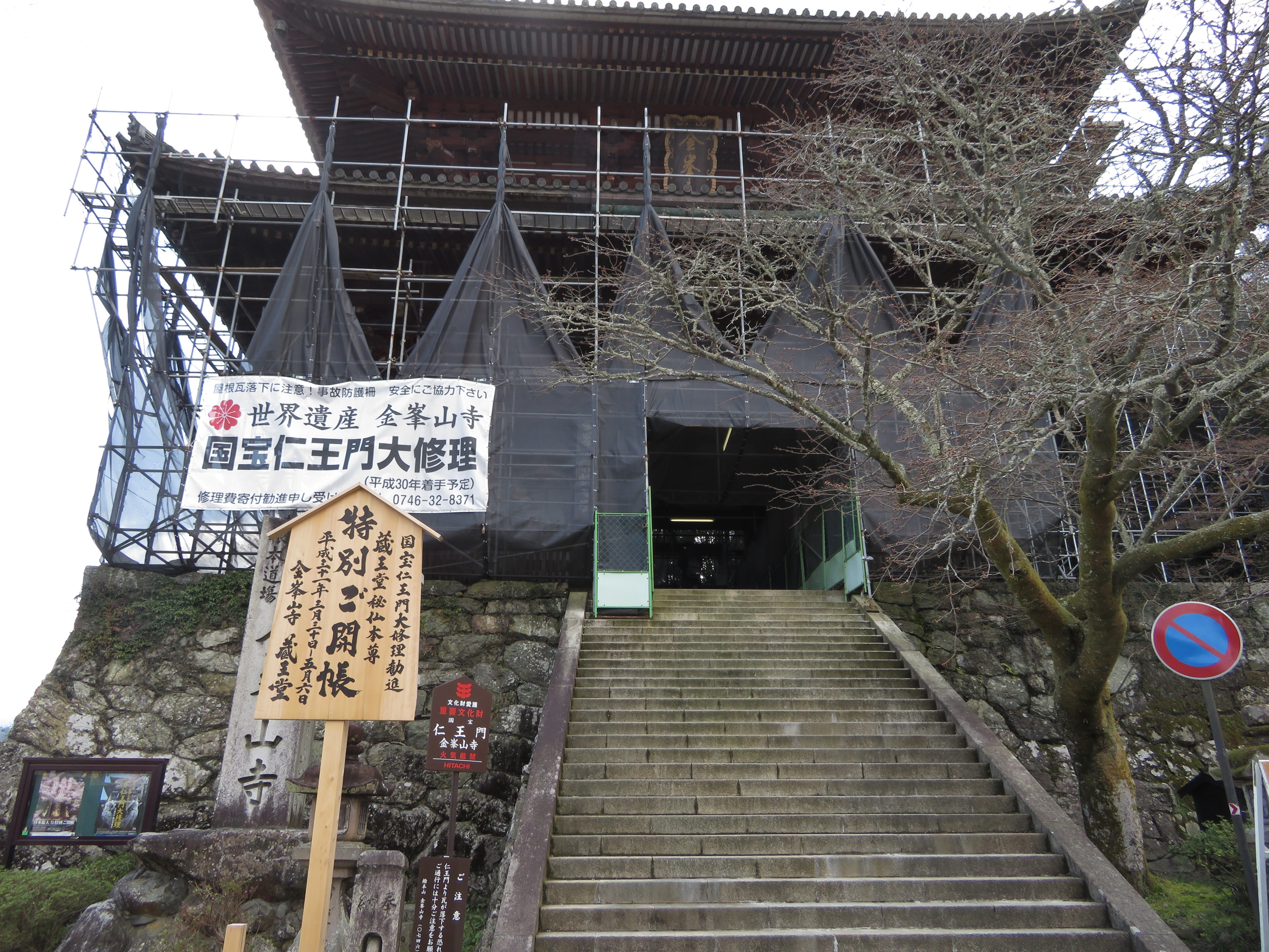 | 金峯山寺では、秘仏の本尊金剛蔵王大権現を真近で拝むことができました。 厨子の中に三体、中尊は7.3M・右側が6.15M・左側が5.9Mの巨大で真っ青な 憤怒の立像を圧倒的迫力で見上げていました。 |